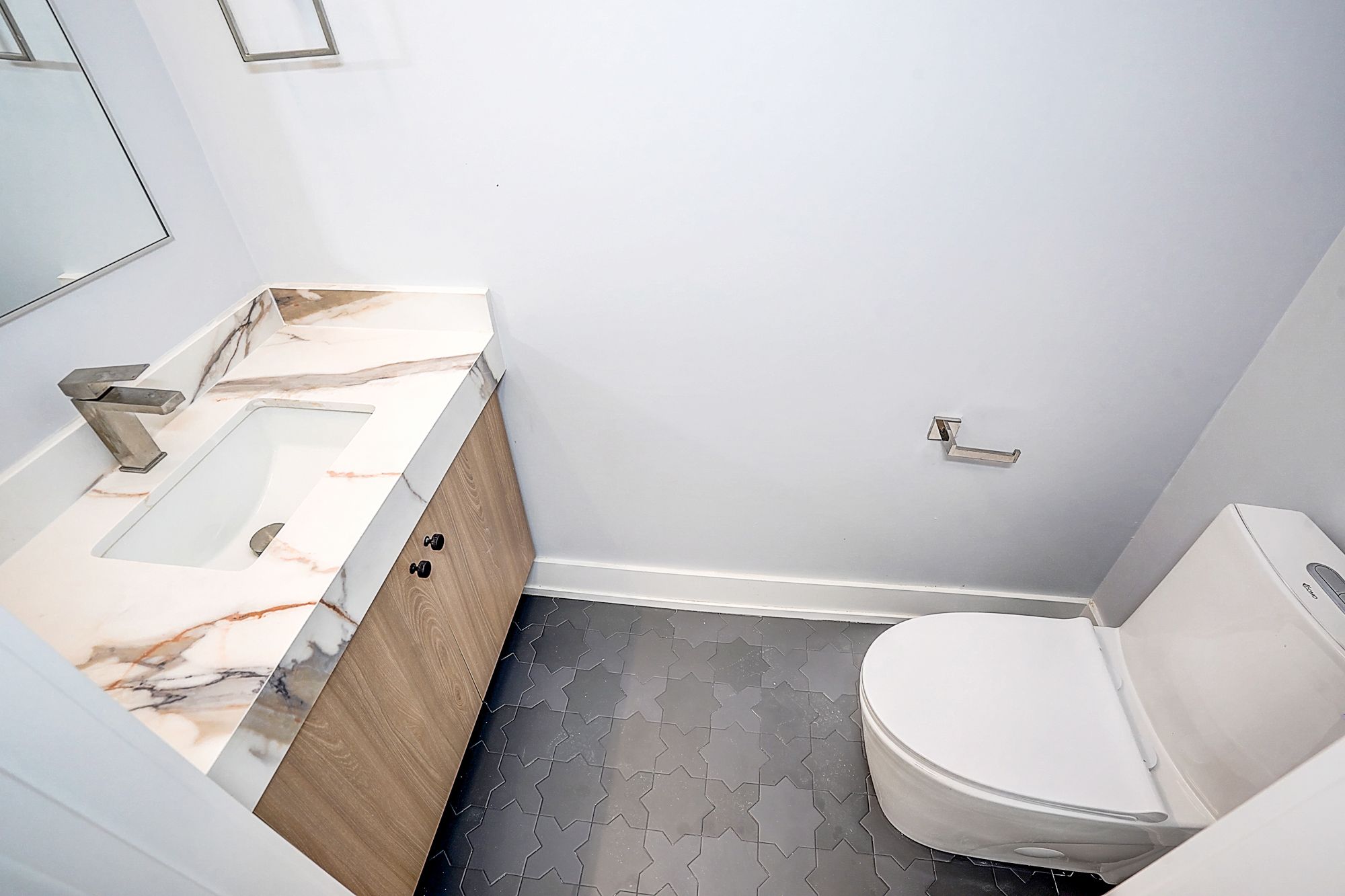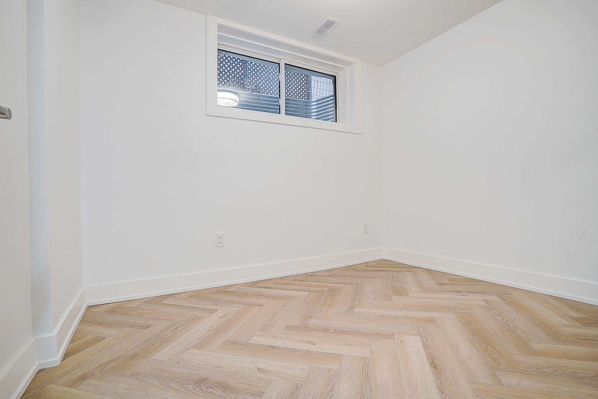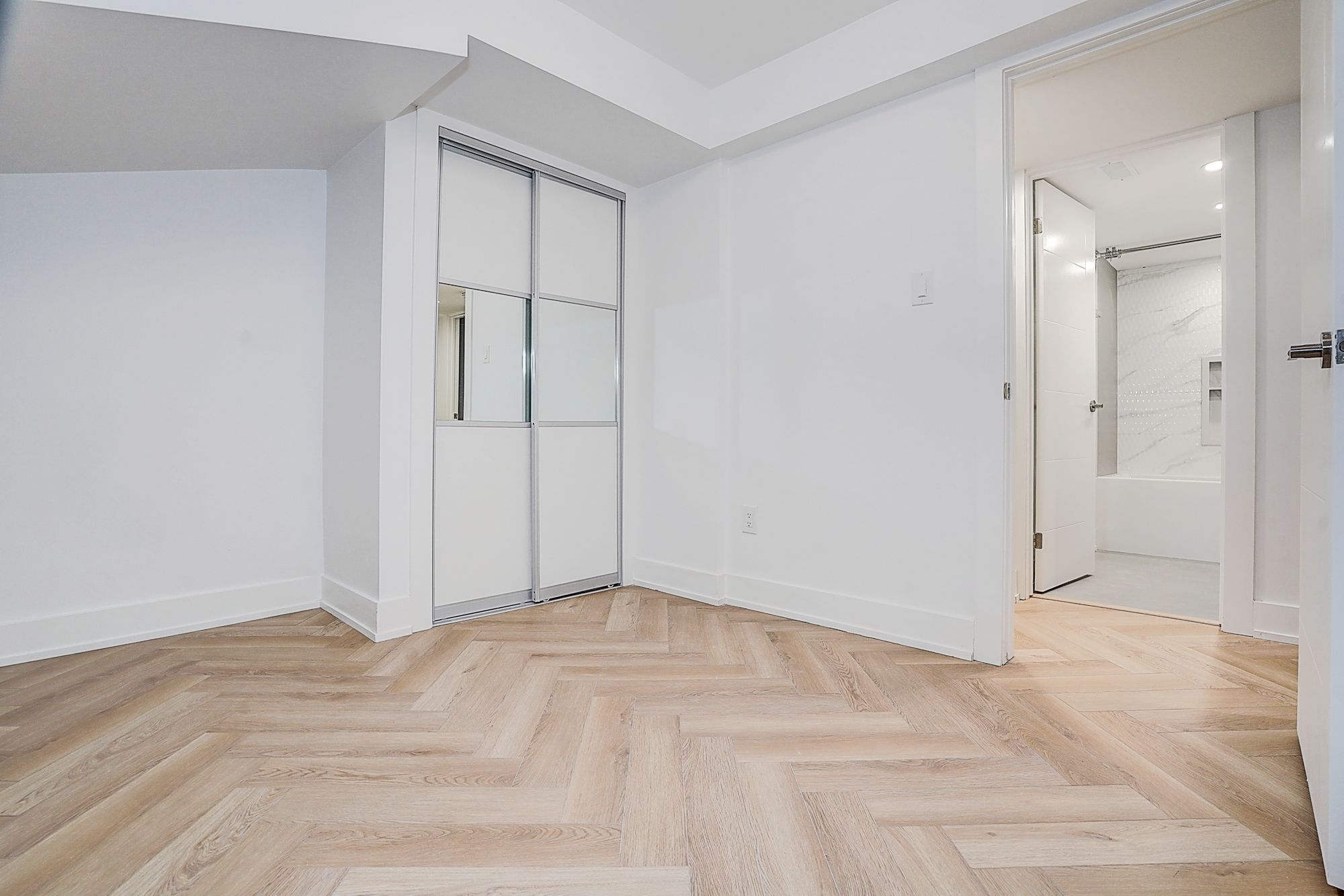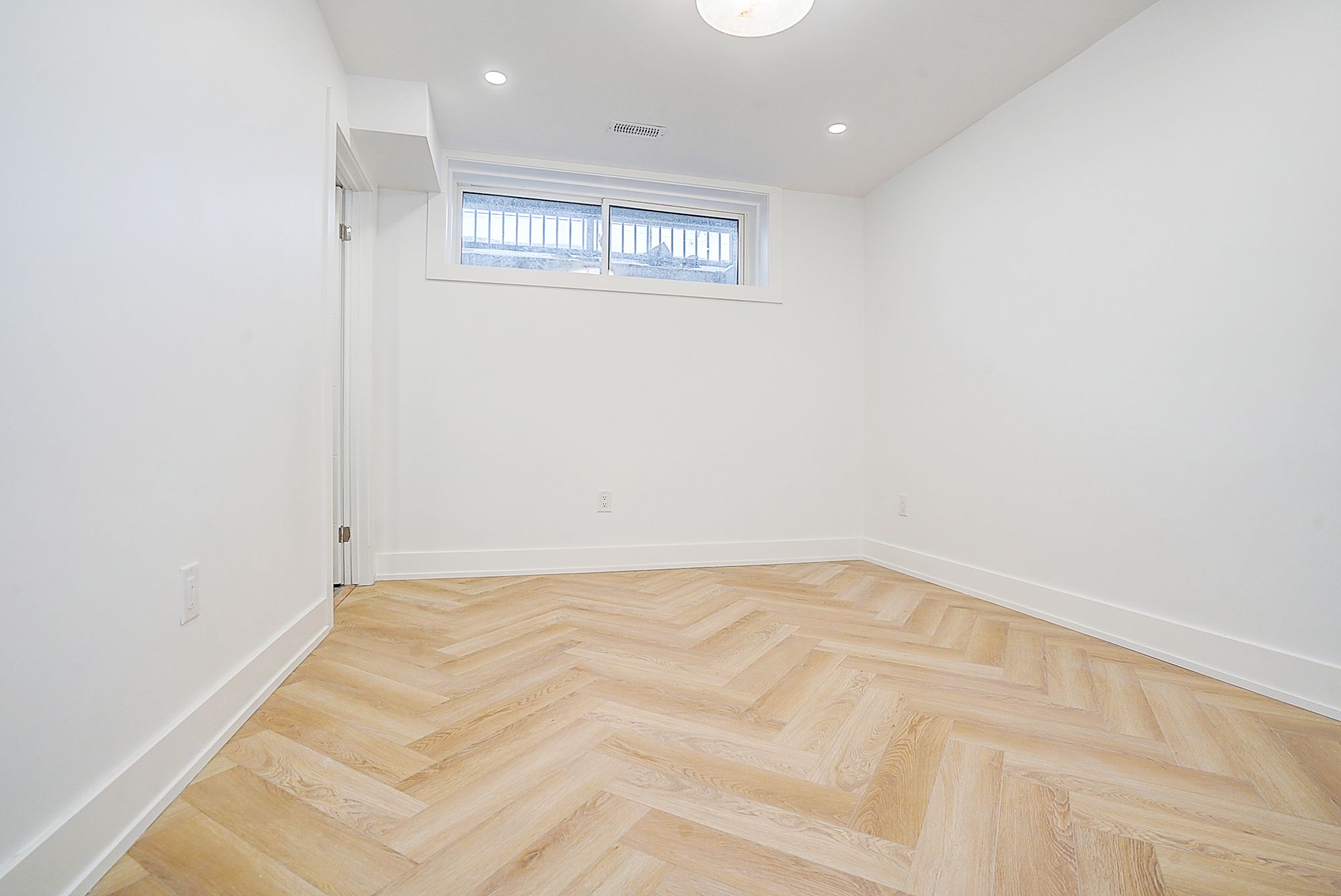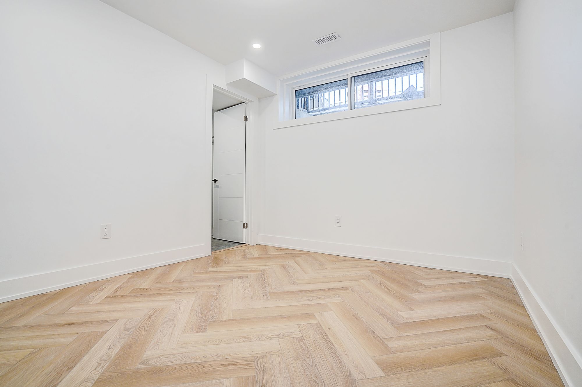• Spacious open-concept living/dining/kitchen with herringbone flooring.