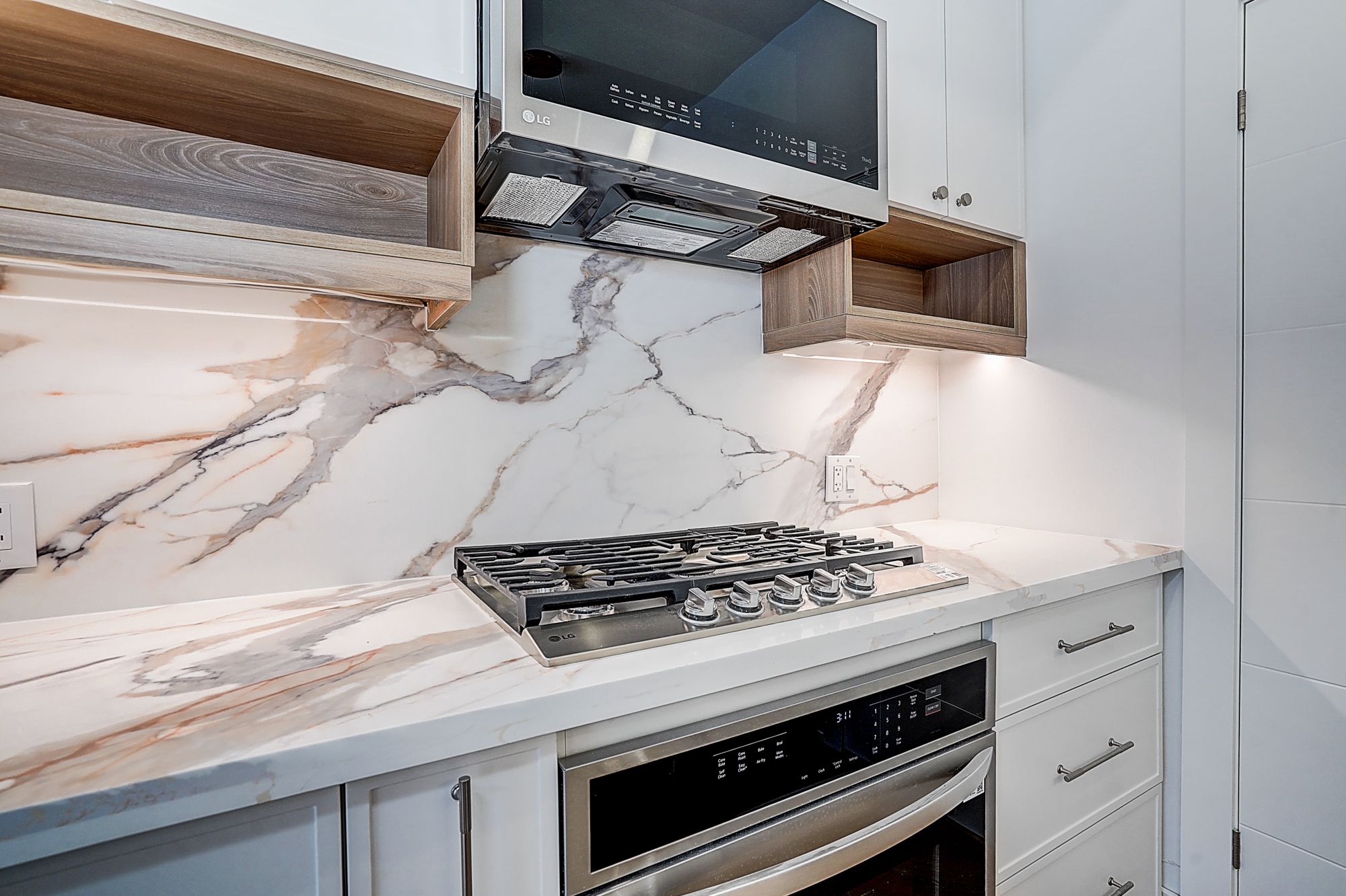 • Gourmet kitchen with modern appliances and quartz counters.