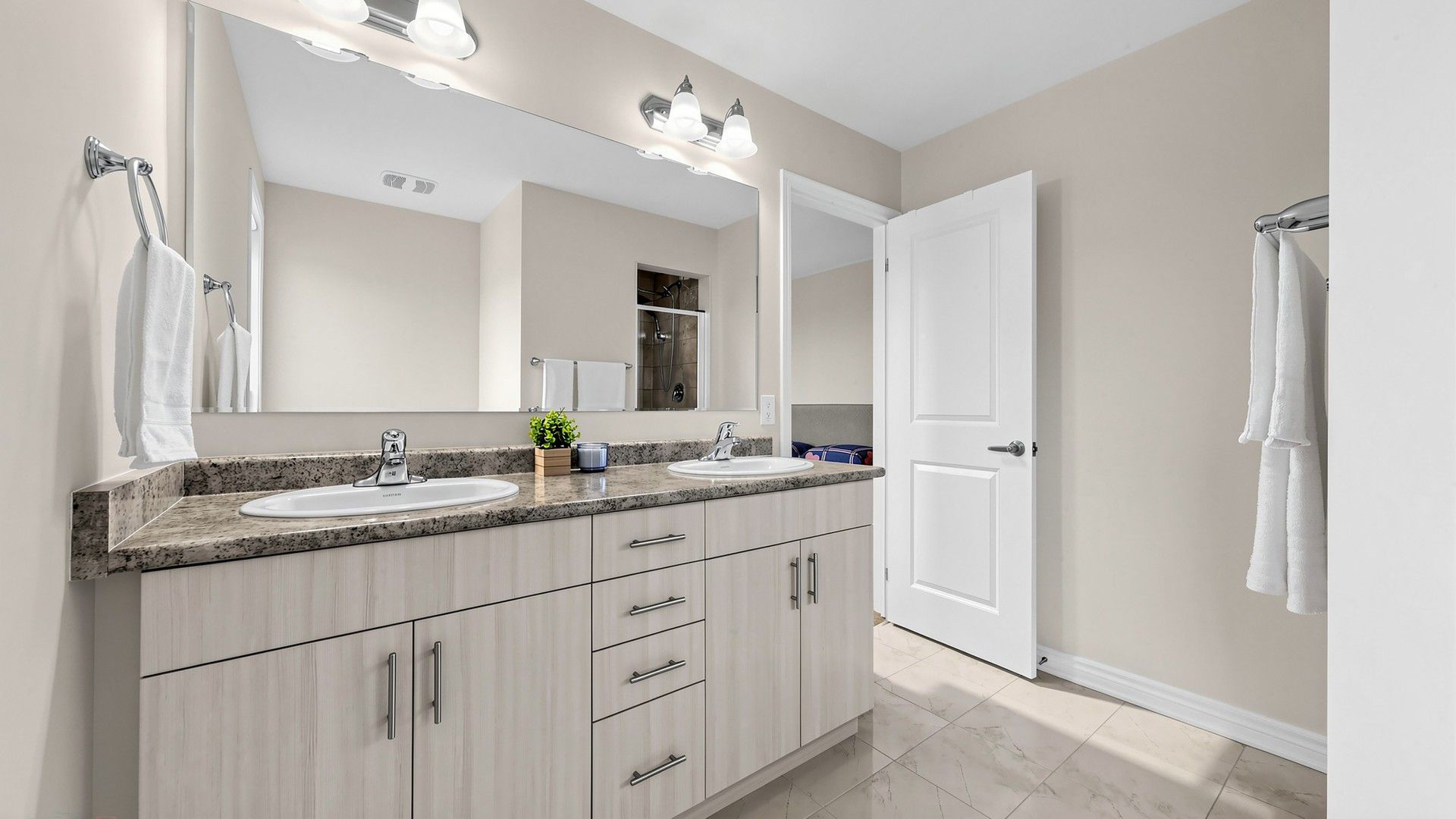 • Open-concept kitchen with a large island and granite countertops.