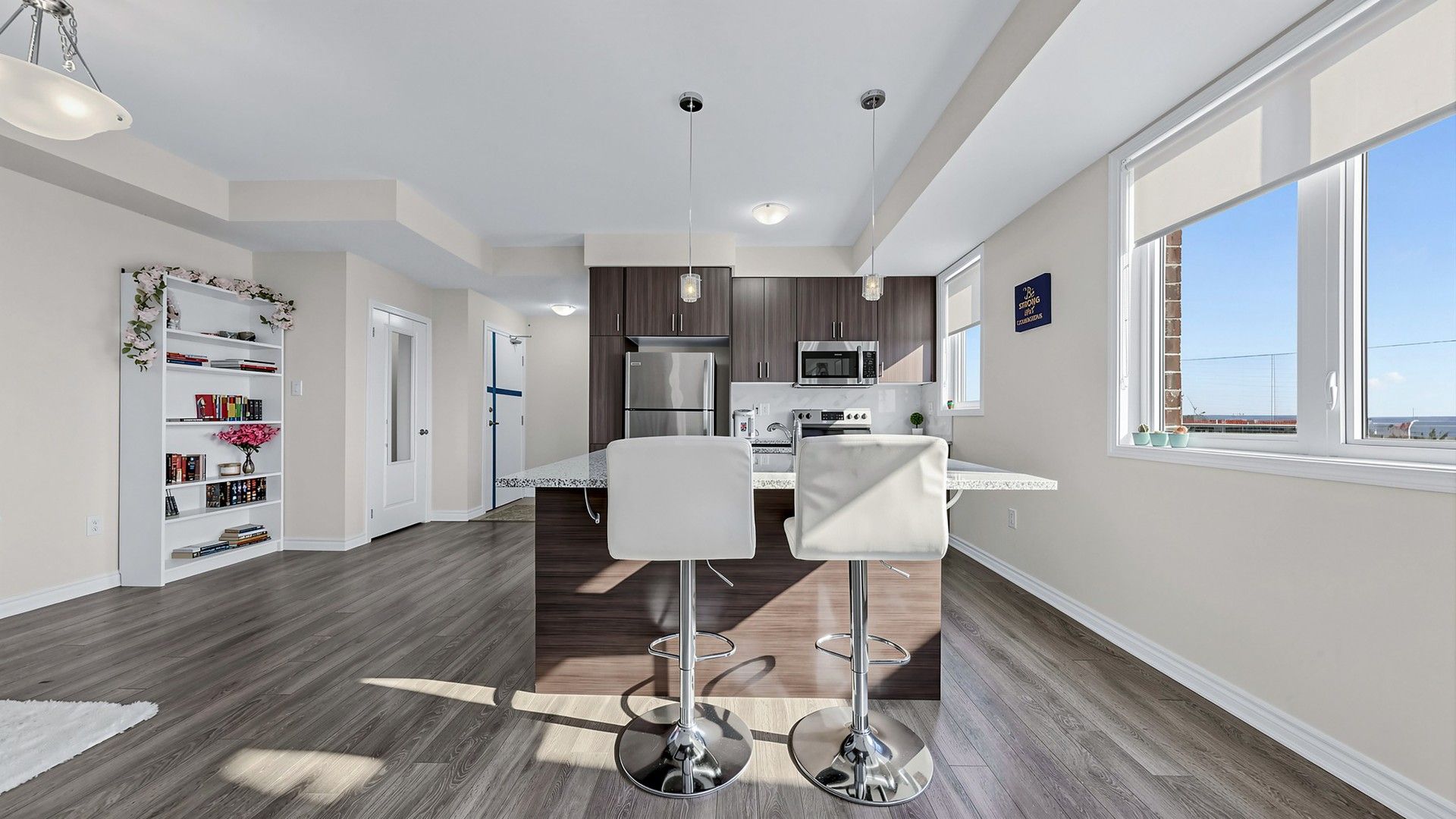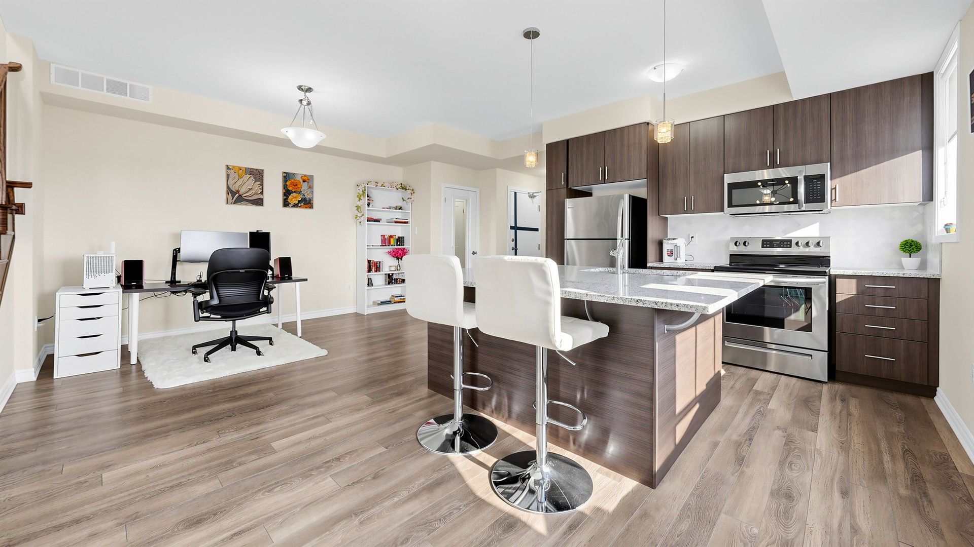 Stylish mattamy condo townhome in the highly desirable seaton, pickering! This turnkey, bright, and spacious 1,656 sq. Ft. Home features 2 bedrooms and 3 bathrooms, 9-ft ceilings on the main floor, and large windows that provide abundant natural light throughout. The main-floor living room can be converted into a third bedroom, offering flexible living space. The open-concept kitchen boasts a large centre island, granite countertops, and stainless steel appliances, with a walkout to a spacious balcony-perfect for bbq gatherings while enjoying unobstructed east-facing views. Elegant oak stairs add a refined touch to the home. The large primary bedroom offers two walk-in closets and a double-sink ensuite. Second-floor laundry provides added everyday convenience. Enjoy direct access to the garage and a private driveway. Situated in a family-friendly neighbourhood, this home is close to seaton hiking trails, golf courses, highways 401 & 407, pickering go station, and pickering town centre. An ideal opportunity for first-time buyers or young families. Don't miss this fantastic opportunity!