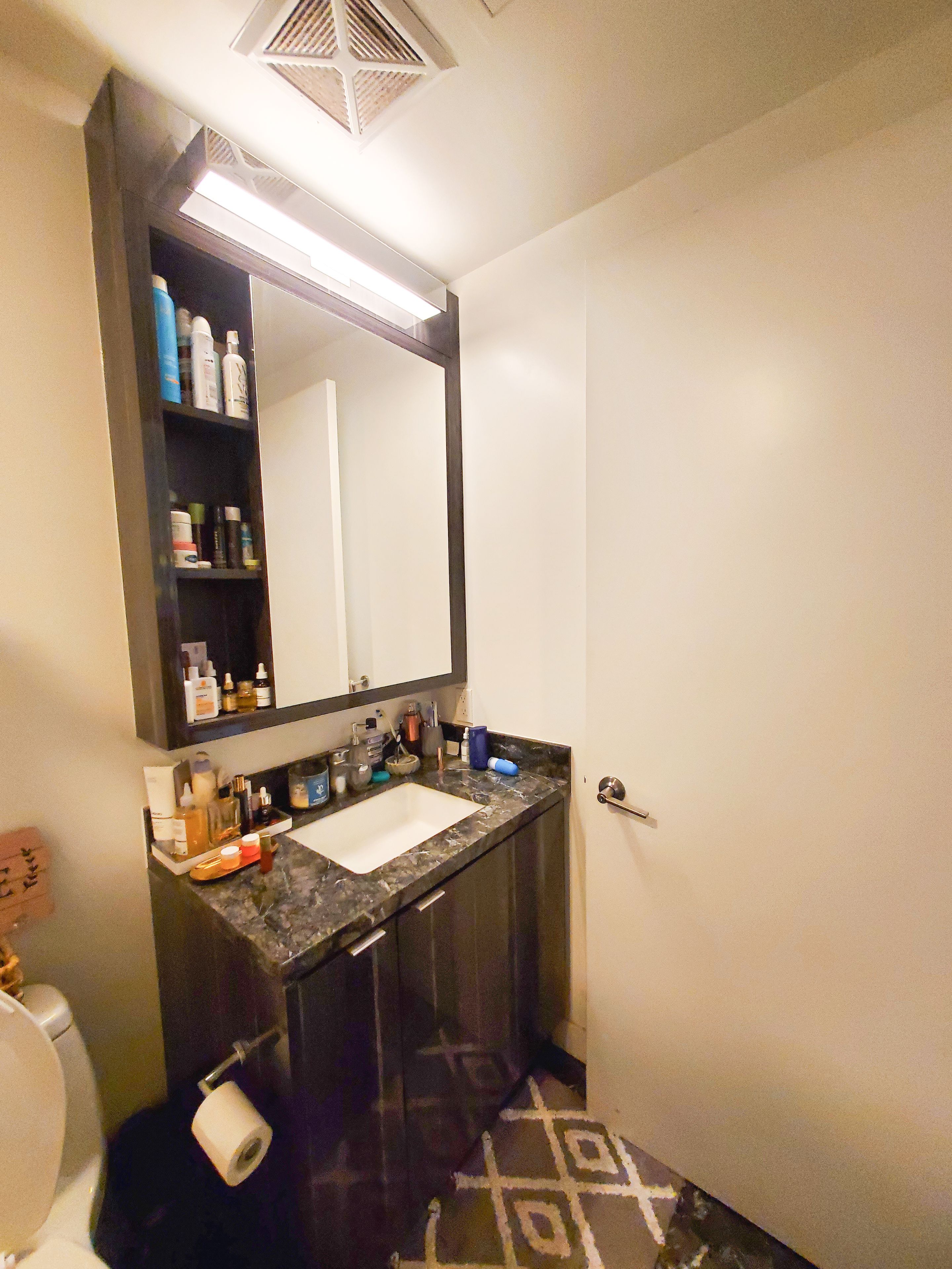 • Luxury bathroom features marble tile and high-end finishes.