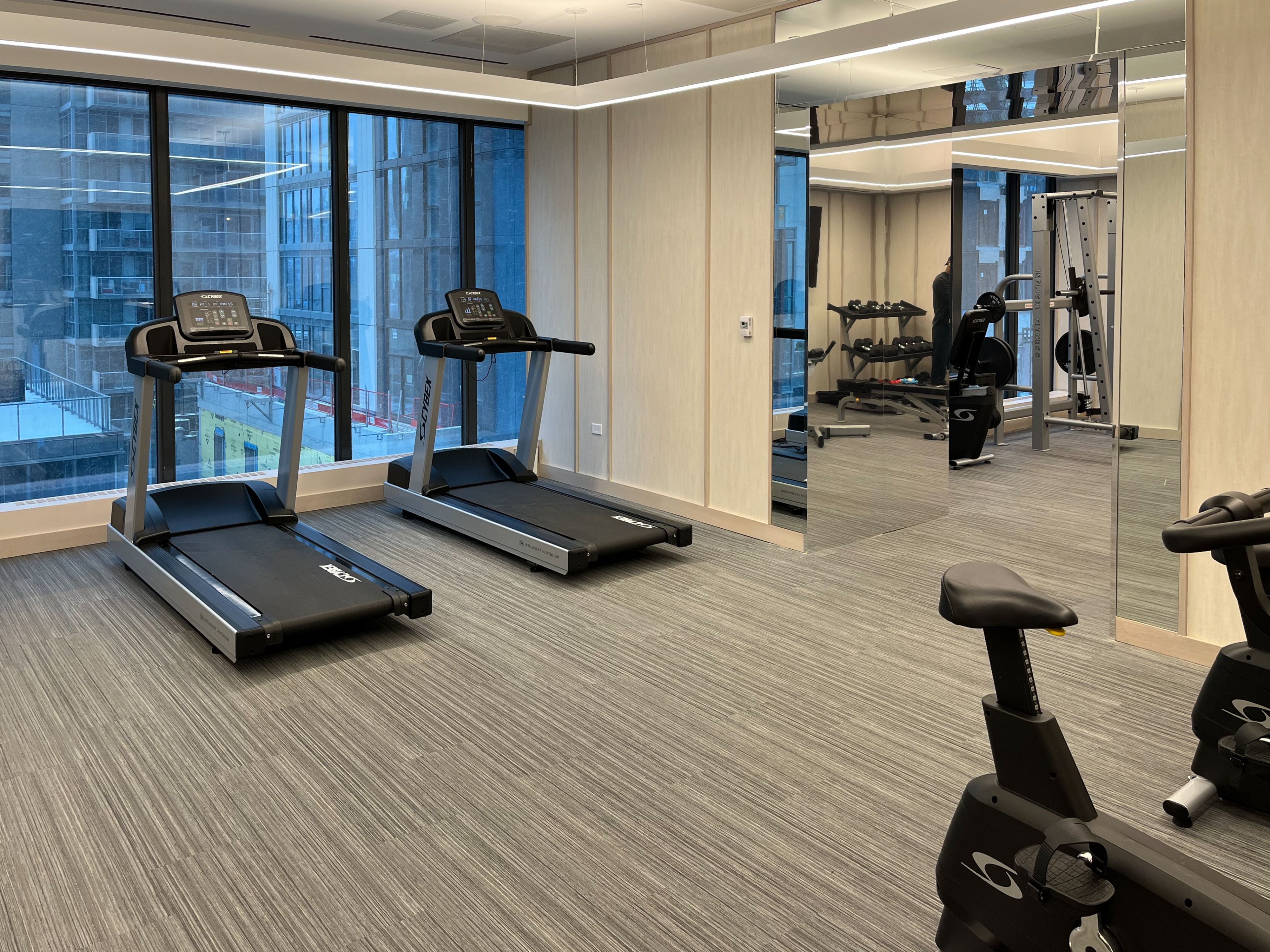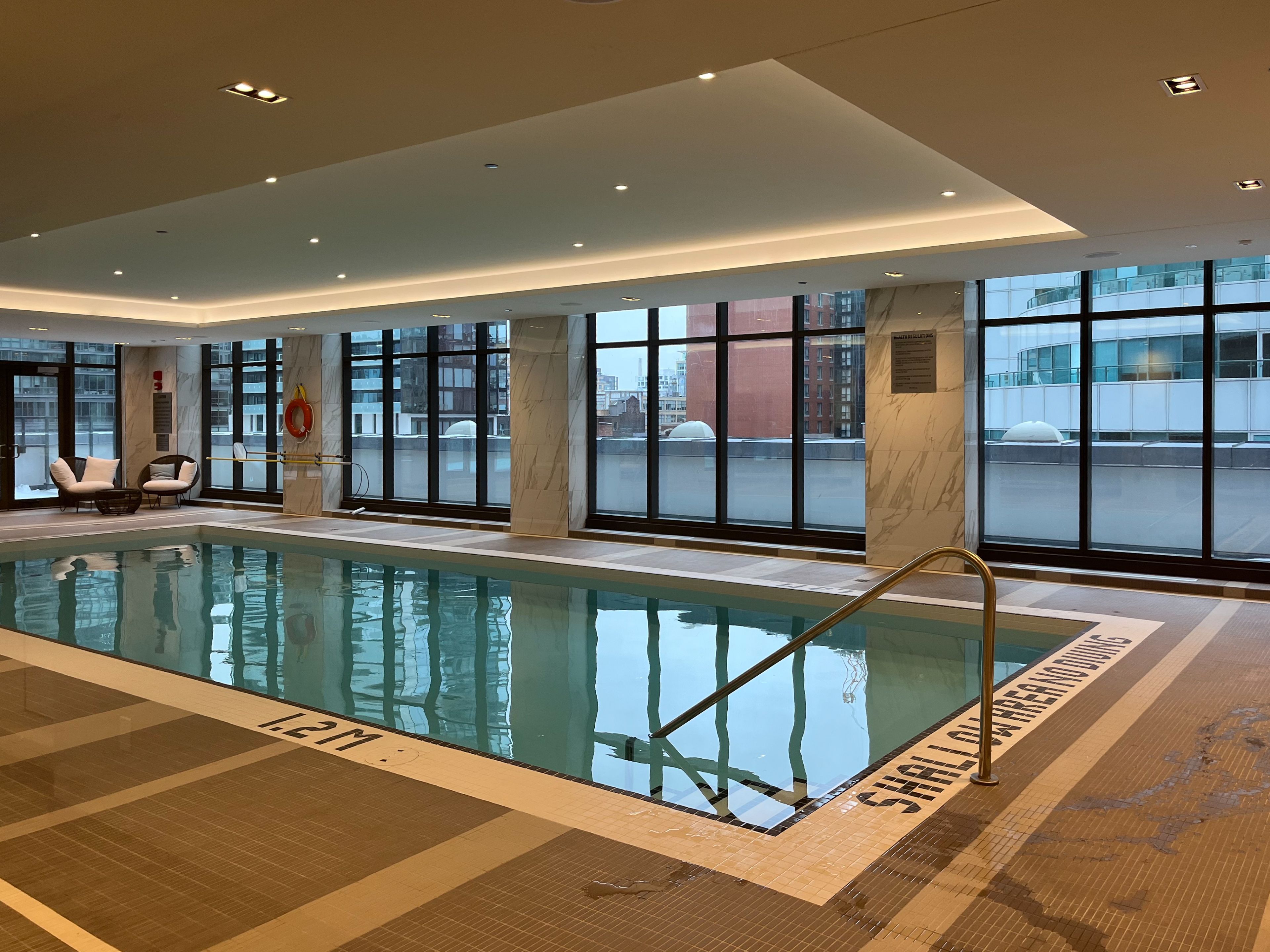 • Amenities include a pool, fitness room, and 24-hour concierge.