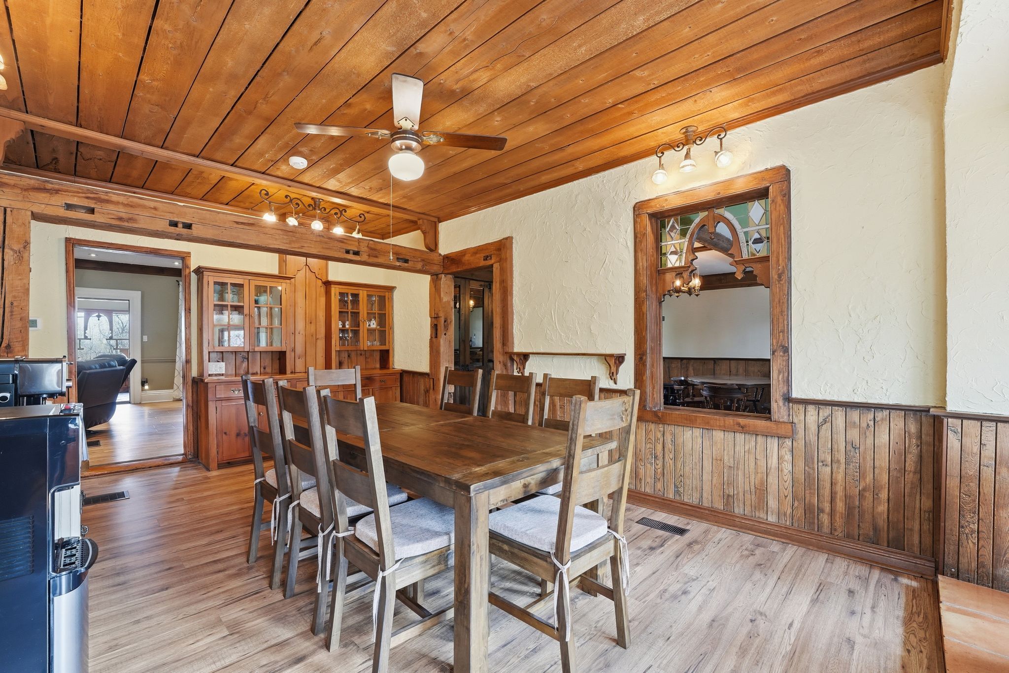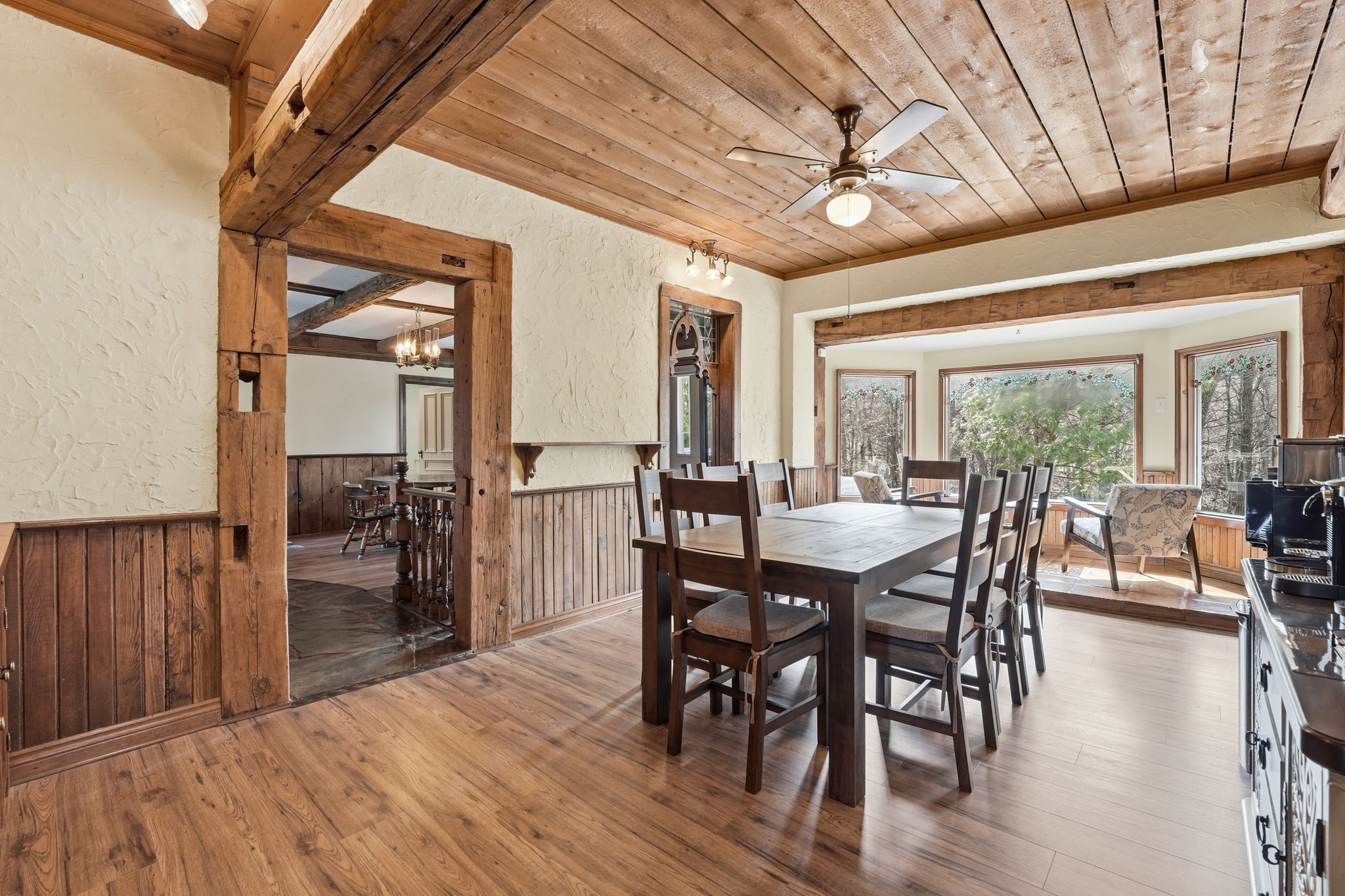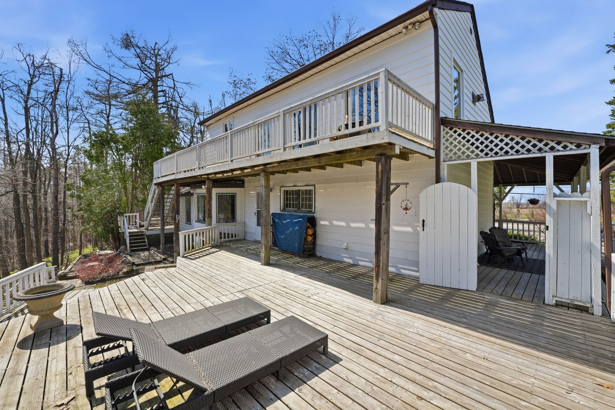 Charming century home on a private 1. 28 acre estate in sought-after midhurst! Full of character, warmth, and timeless appeal, featuring farmhouse beams & stained glass accents throughout, perfectly nestled among mature trees and backing onto a ravine with 330 feet of frontage, this property offers ultimate privacy and a truly serene setting. Offering 2,886 sq ft above grade, the home features an open, bright, and functional layout where every room serves a purpose. The kitchen is well-appointed with double wall ovens, quartz countertops, and scenic views overlooking the forest. Multiple walkouts lead to a massive three-tiered deck, seamlessly blending indoor and outdoor living and creating your own private retreat. The classic wrap-around porch anchors the charm! Upstairs, a hidden vaulted ceiling rec room adds unique character and flexible living space. The walkout basement offers endless potential, while ample storage throughout ensures practicality meets charm. Step outside and enjoy peaceful family gatherings, fires, and outdoor living on the expansive lot. A true lifestyle property. Complete with a triple car detached garage for all the toys and located just minutes to barrie and highway 400, this home offers the perfect balance of privacy and convenience. A rare opportunity to own a truly special property in one of the area's most desirable settings.