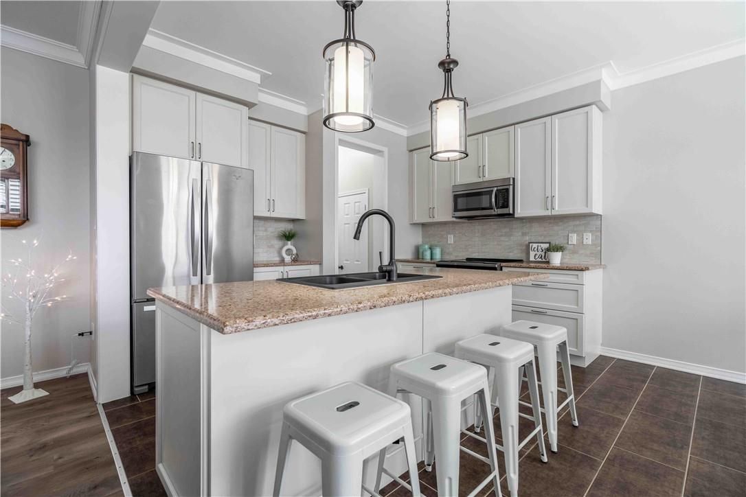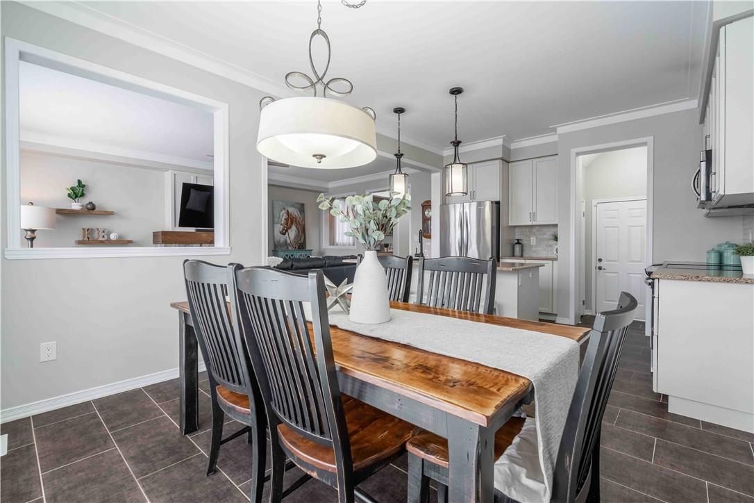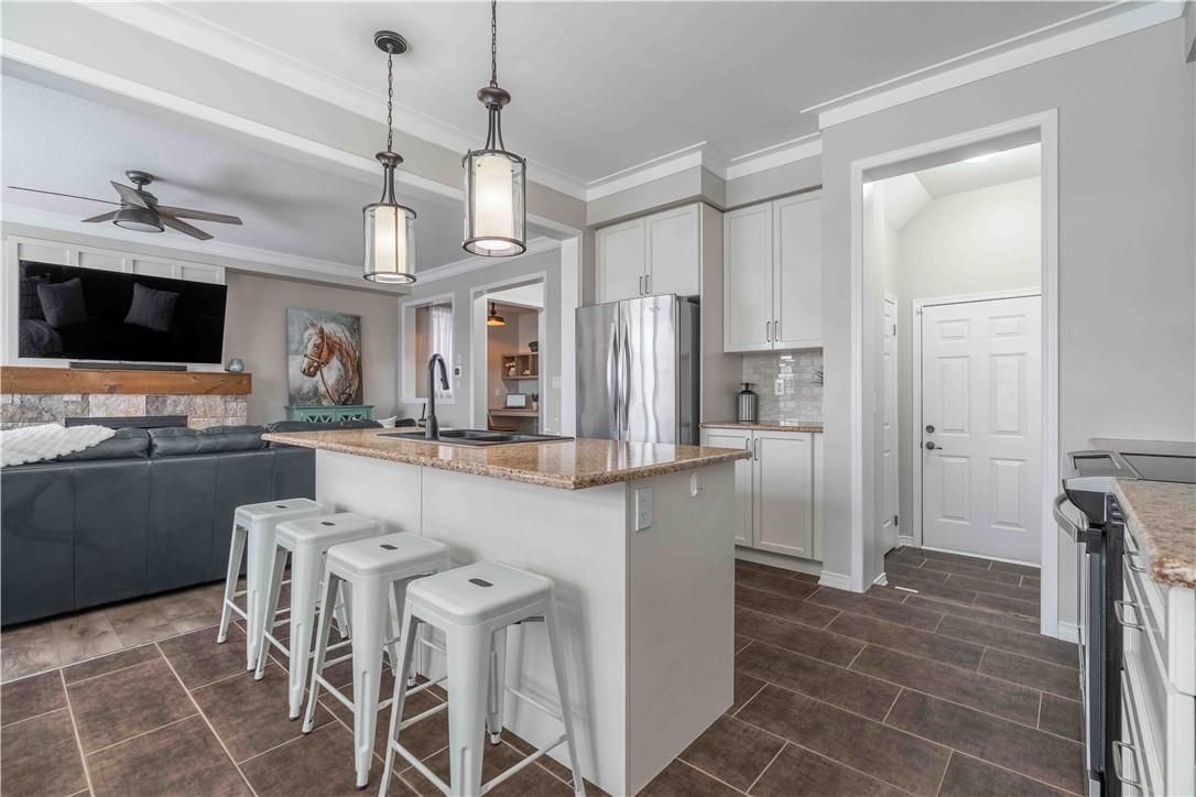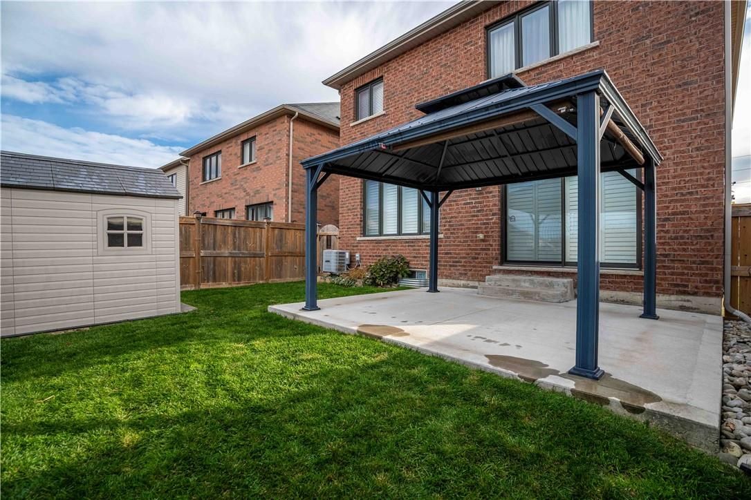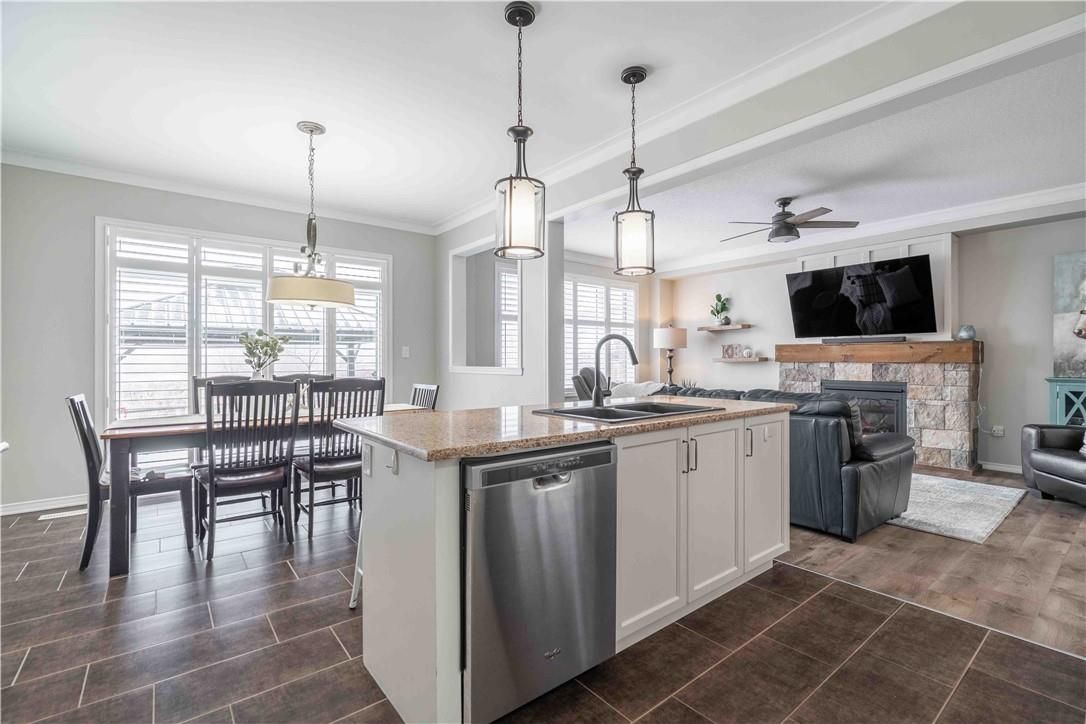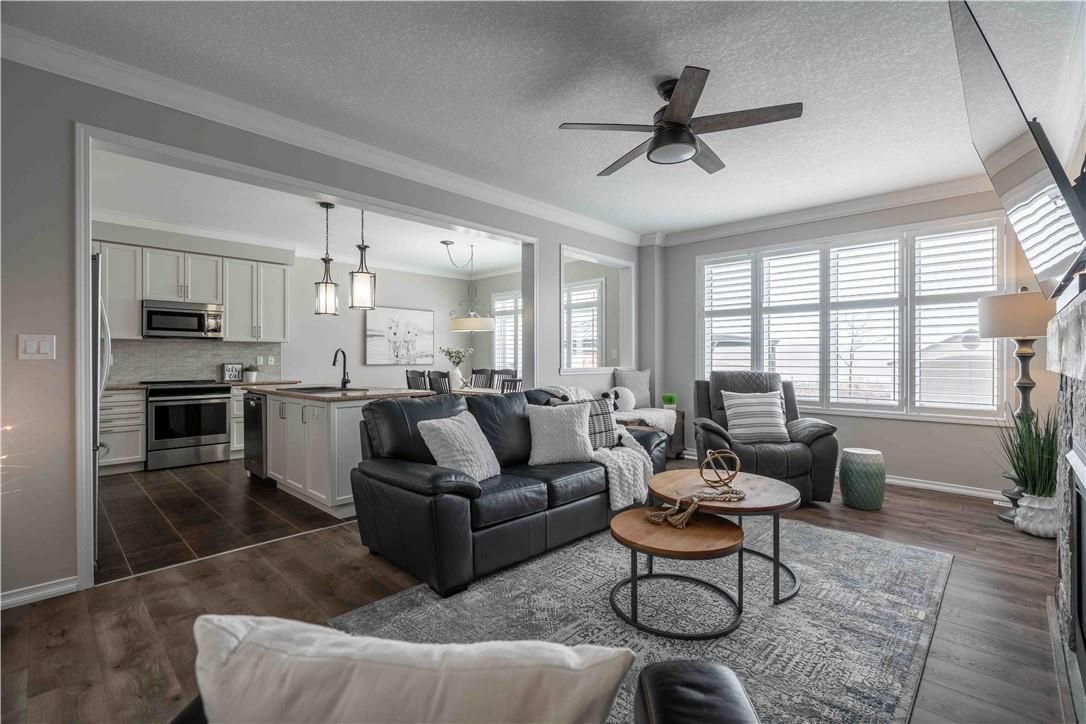 Welcome to 115 larry crescent, beautifully located just steps from the lovely grand river and seneca park. The newer community of "avalon" provides conveniences and service for families in a sought-after rural setting. This impressive all-brick home is situated on a generous 37 ft lot, with excellent curb appeal, fully fenced back yard, double drive and double garage. You are invited to enjoy the well-maintained home at the covered front porch- a great place to enjoy a peaceful morning coffee or a sip at end of day! The spacious entrance of this 4 bedroom, 3 bath home escorts you into the foyer and then the open concept main level. Note the gas fireplace, the extensive use of crown moulding, the large windows and oversized patio doors to let the sunshine stream in. Features include: central peninsula in kitchen, stainless appliances, quartz countertops, built-in otr micro-oven, ample cabinetry, special central planning center which could easily be home office or home-work center, inside access to garage. Newly carpeted staircase to upper level with 4 spacious bedrooms, ideally located laundry (with brand new dryer installed feb 2026) and 2 full baths. Primary bedroom is oversized with 4 piece ensuite bath featuring spa tub/separate shower. 3 other bedrooms share the primary 4-pc bath. Basement is partially finished awaiting your designer touches. Fenced private backyard is provides a poured concrete patio complete with gazebo and also a handy garden shed. Make this your next home!