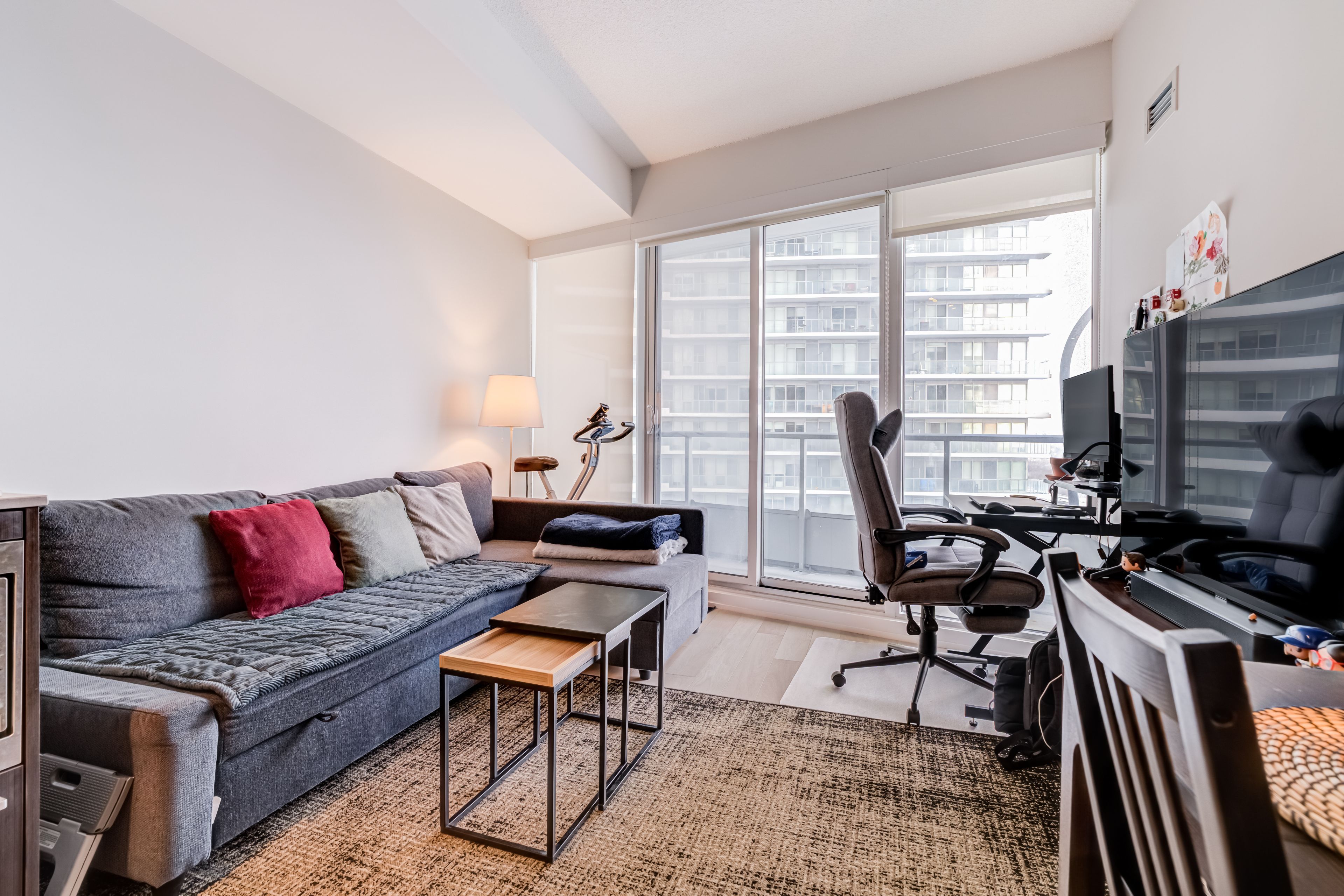 • Building amenities include a fitness centre, bowling alley, and sports courts.