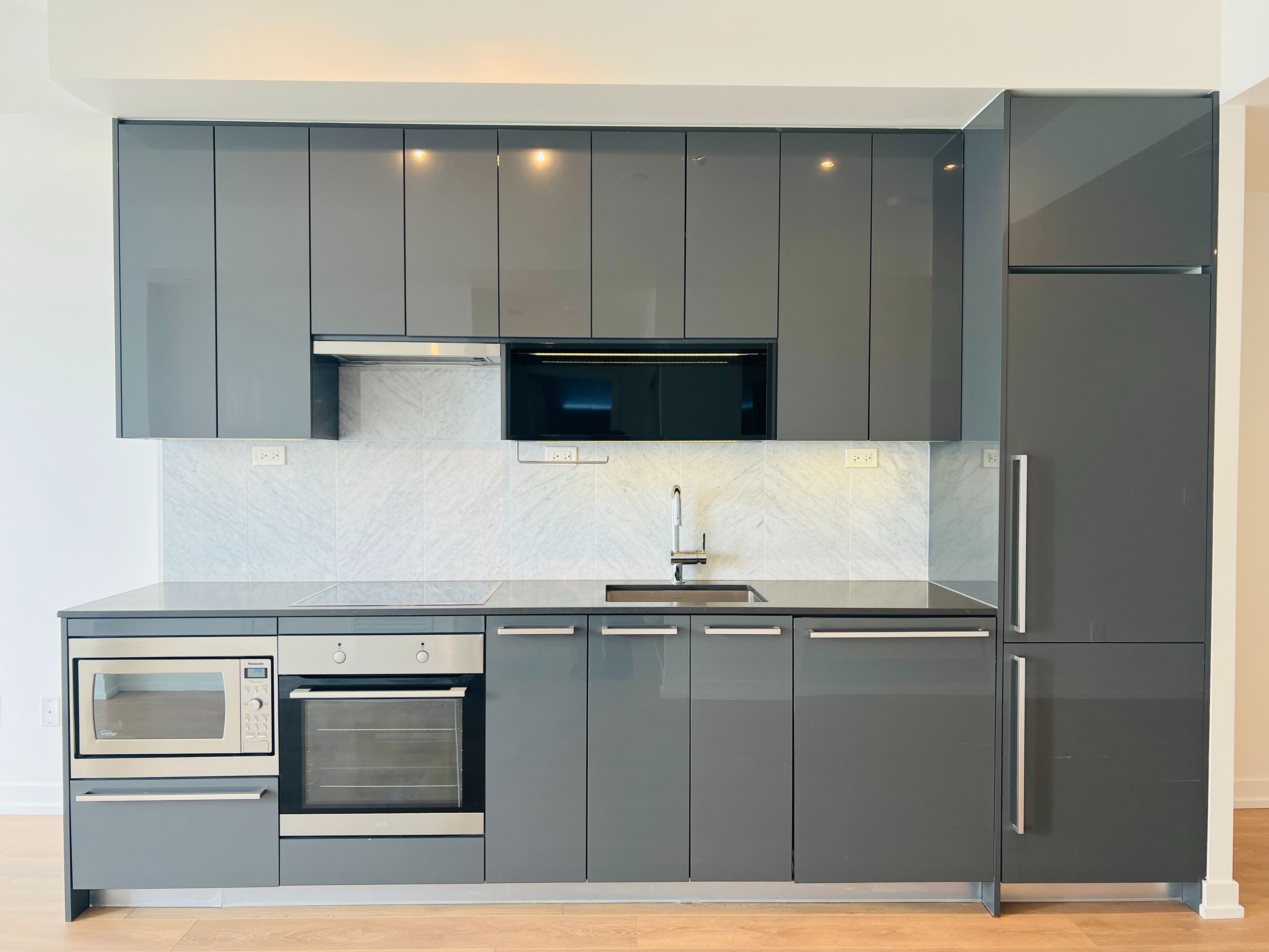 • Modern kitchen with integrated appliances and smart storage solutions.