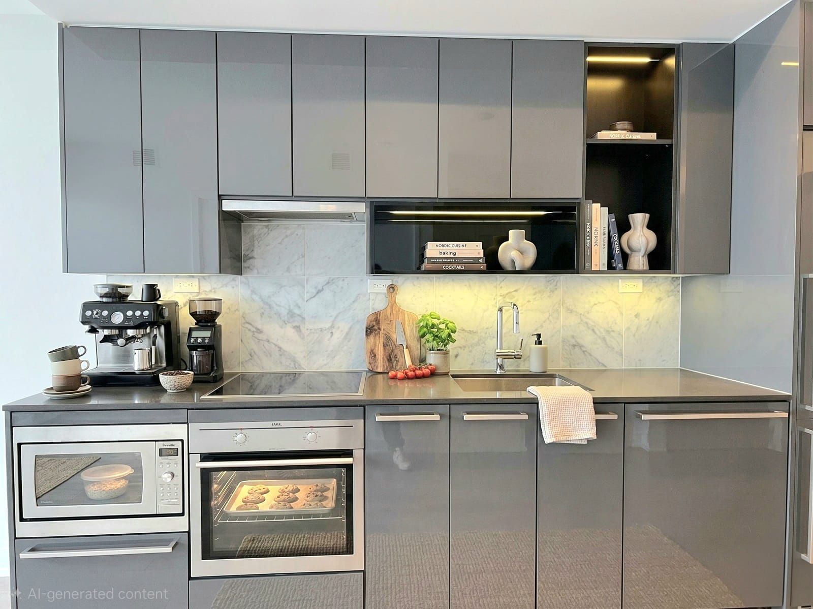 • Modern kitchen features granite countertops and a stylish backsplash.