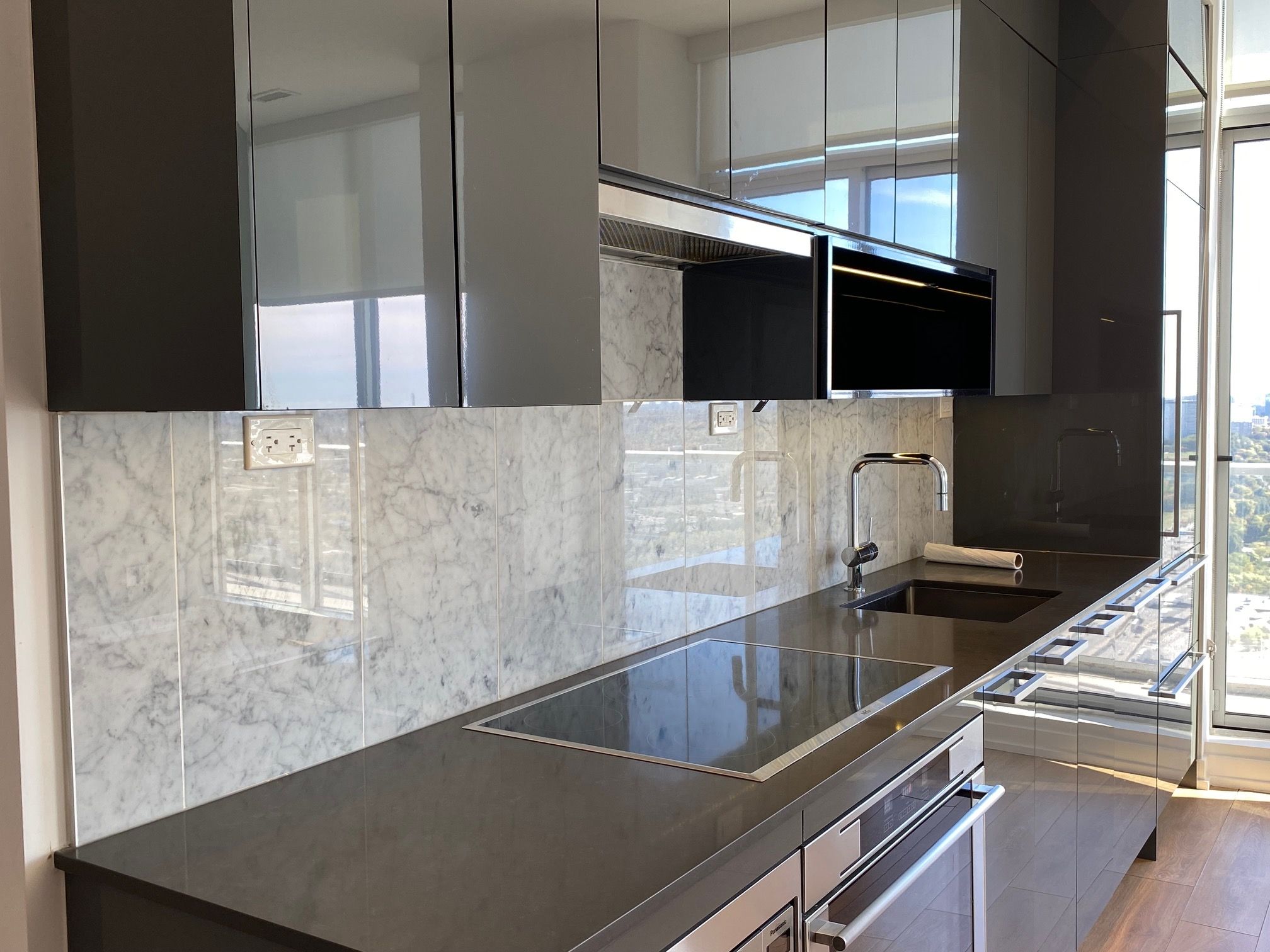 • Modern kitchen with high-end appliances and stylish quartz countertops.