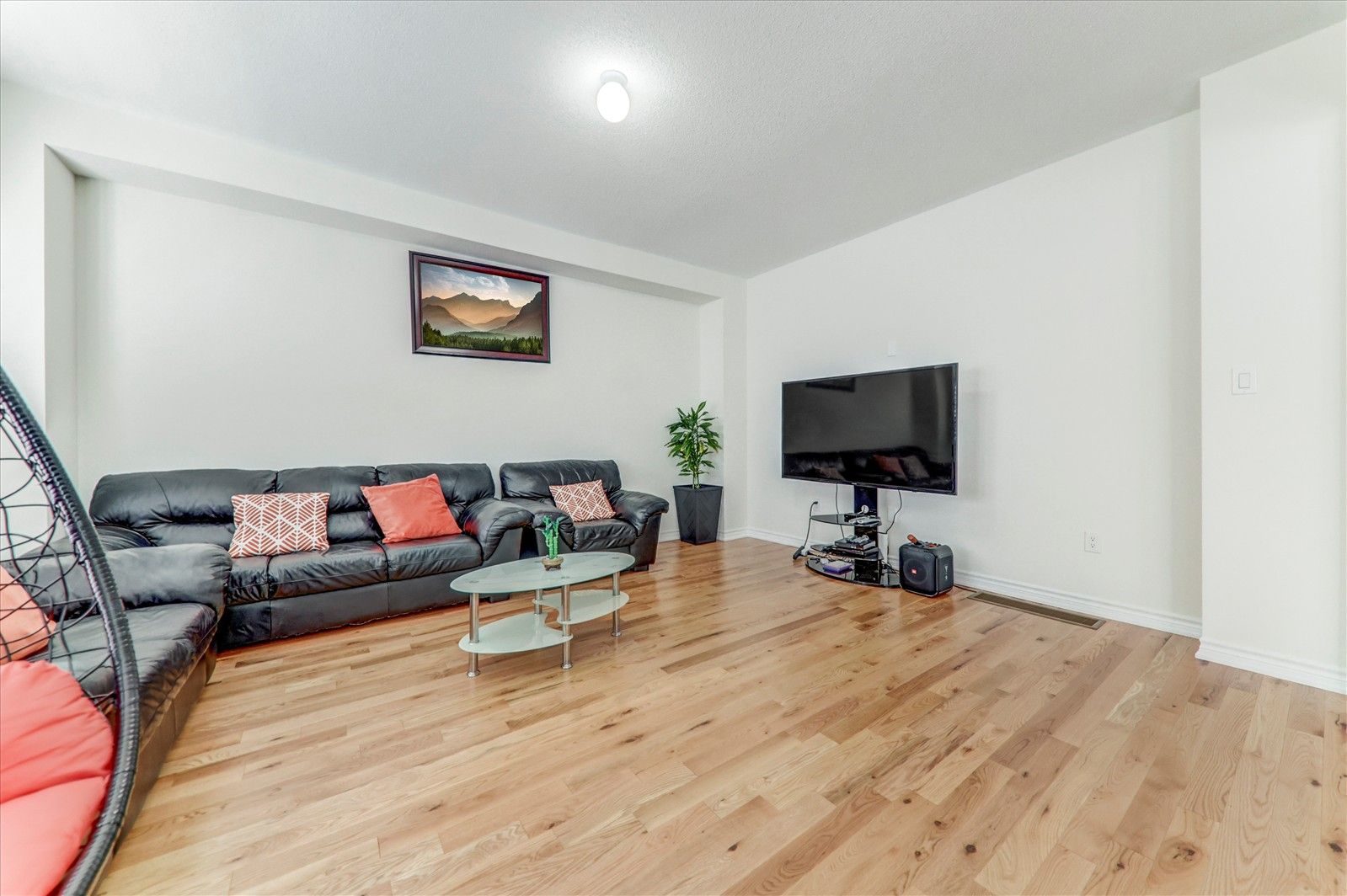 • Bright family room featuring hardwood flooring and large windows.
