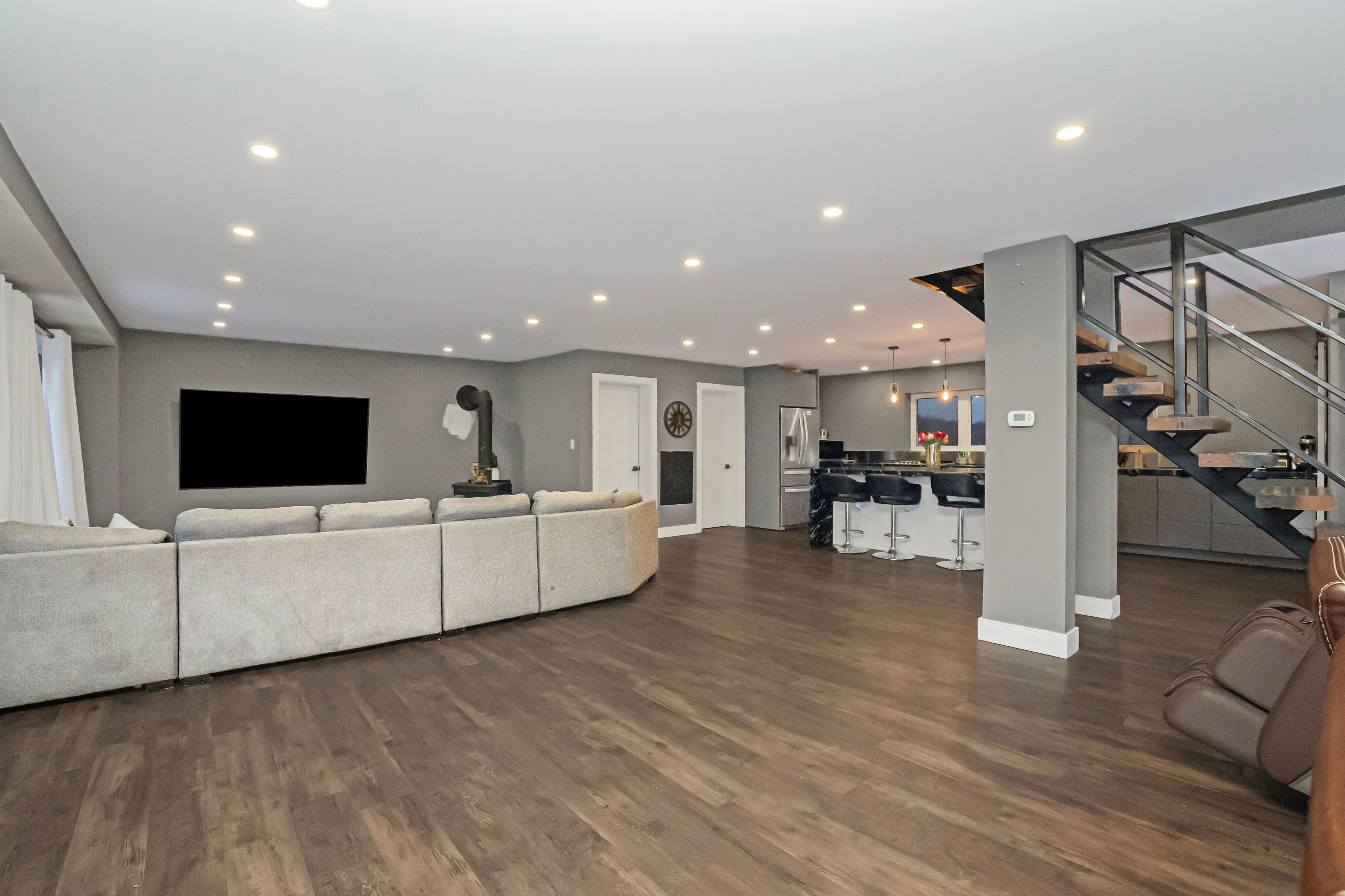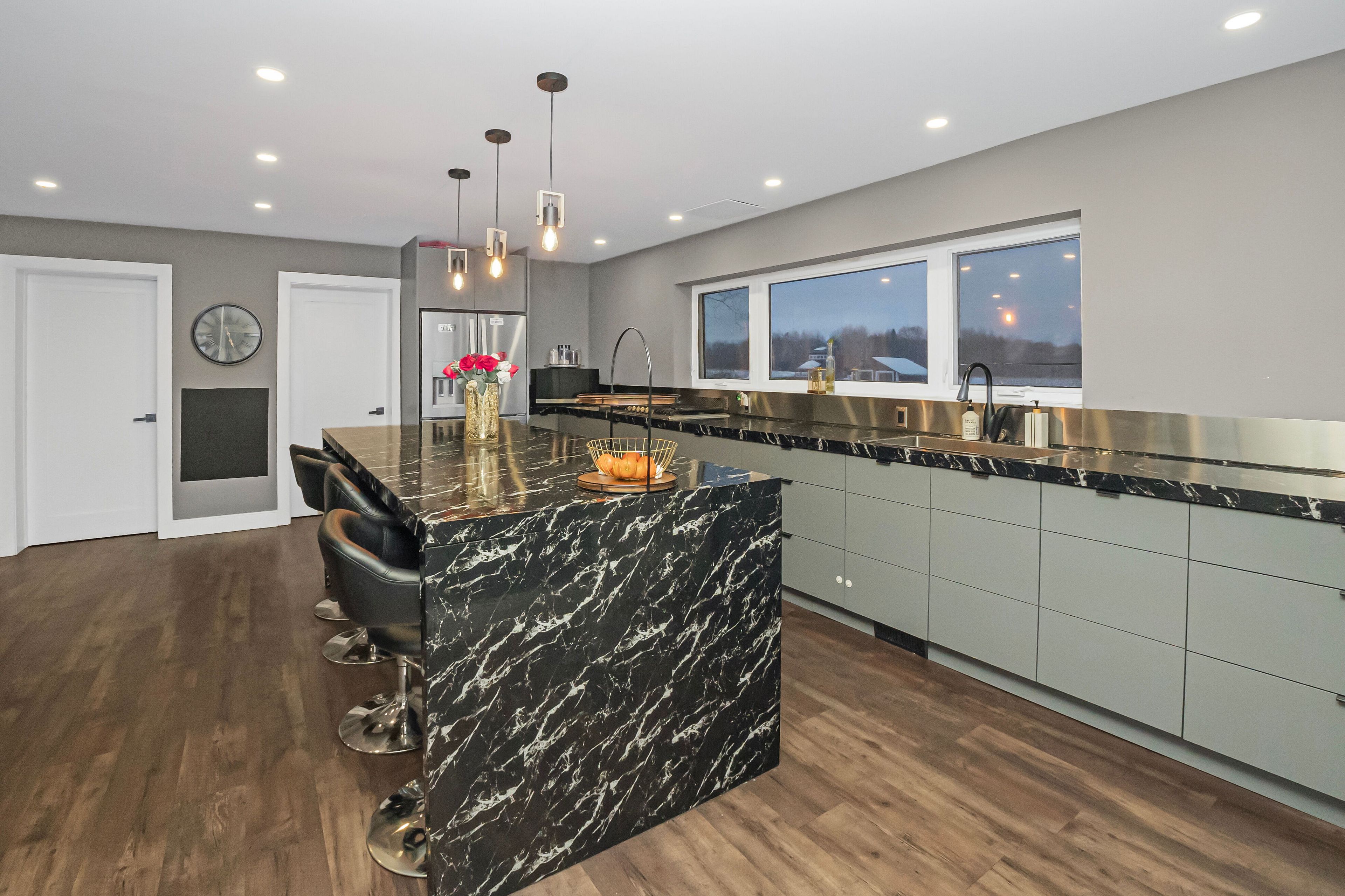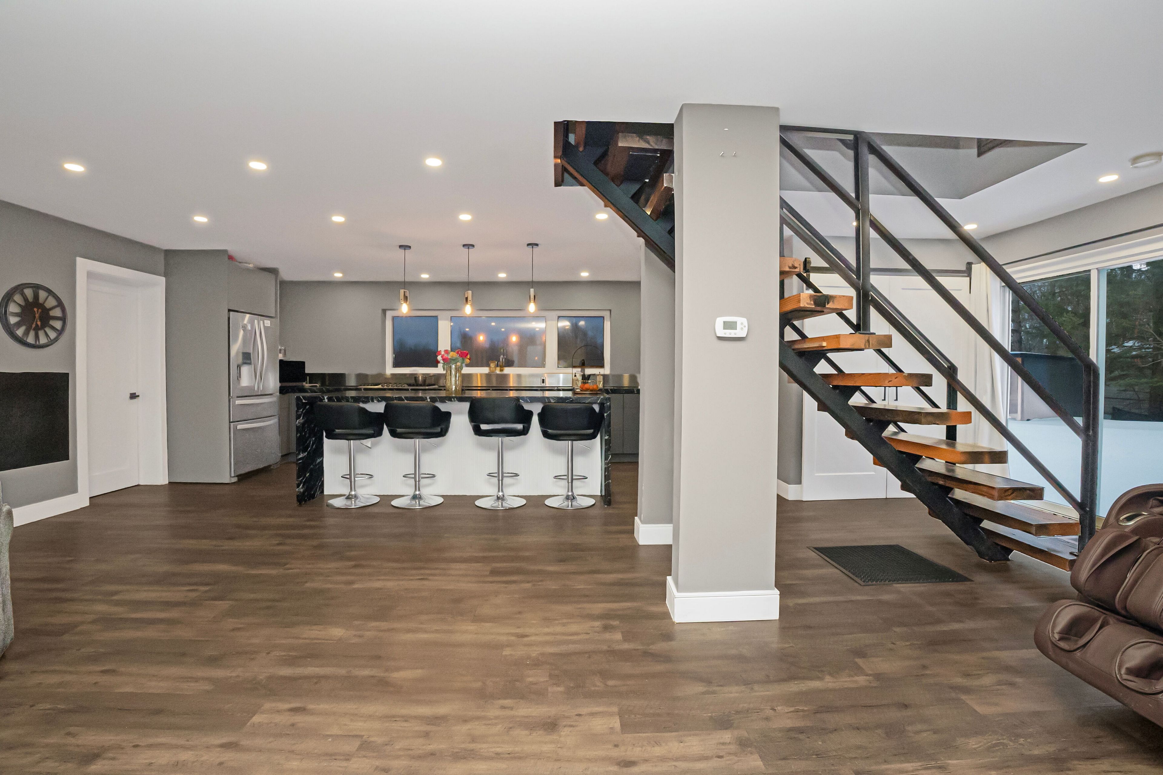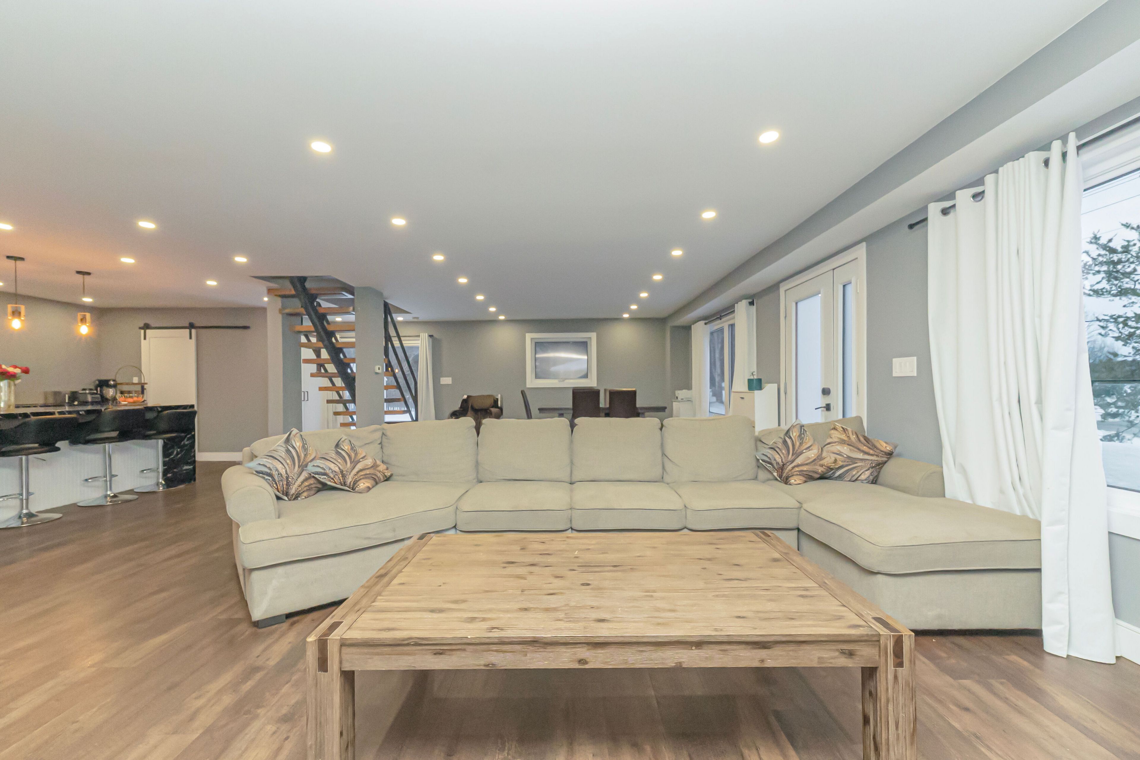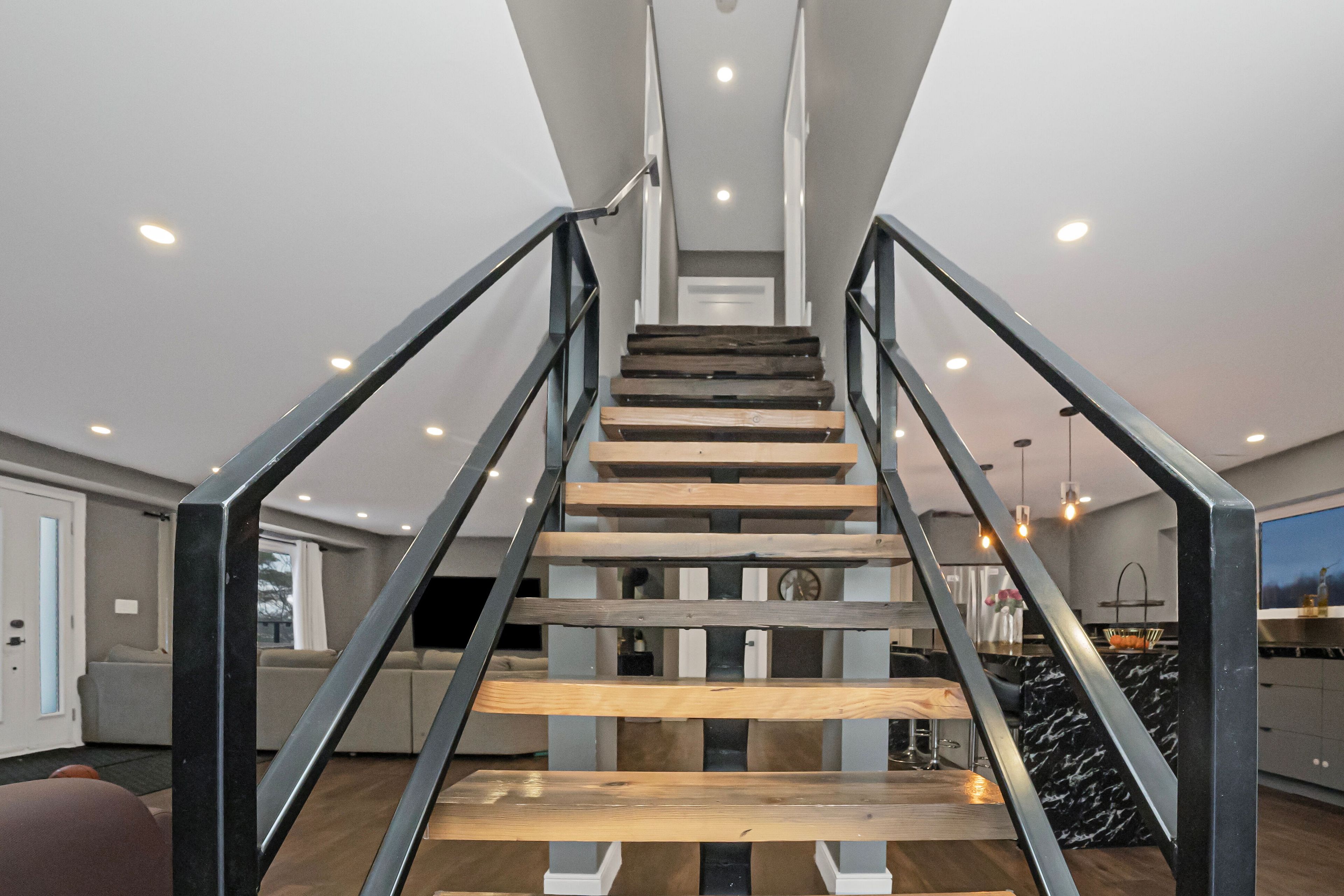 A home that truly must be seen to be appreciated! Step inside this beautifully designed open-concept home where every detail has been carefully considered. The main level offers a bright, spacious layout perfect for everyday living and elegant entertaining. The chef's kitchen features generous counter space, custom concrete countertops, and a large center island with built-in appliances, designed to be both functional and stylish. A walk-in pantry keeps small appliances out of sight, while oversized windows fill the space with natural light and showcase stunning views. A striking custom staircase, crafted with reclaimed wood from the historic well and canal, adds warmth, character, and unique charm. Upstairs, the primary suite is a peaceful retreat with sweeping views, a spa-style ensuite, and a large walk-in closet with room for a sitting area or home gym. The soaker tub, perfectly placed to overlook the horizon, is ideal for relaxing. Two additional bedrooms are spacious and bright, with a second full bathroom that continues the spa-inspired design, featuring a sleek glass-and-tile shower and serene rural views. Outside, a generous patio captures golden sunsets and pastoral scenery, perfect for unwinding or entertaining. Adding versatility, a ground-level one-bedroom apartment with heated floors offers comfort year-round, ideal for extended family or rental income. An oversized three-car garage provides ample storage for recreational gear, with easy access to nearby snowmobile and atv trails. This exceptional home is more than a residence-it's a lifestyle. Schedule your private viewing today to experience its charm, functionality, and optional furnished living