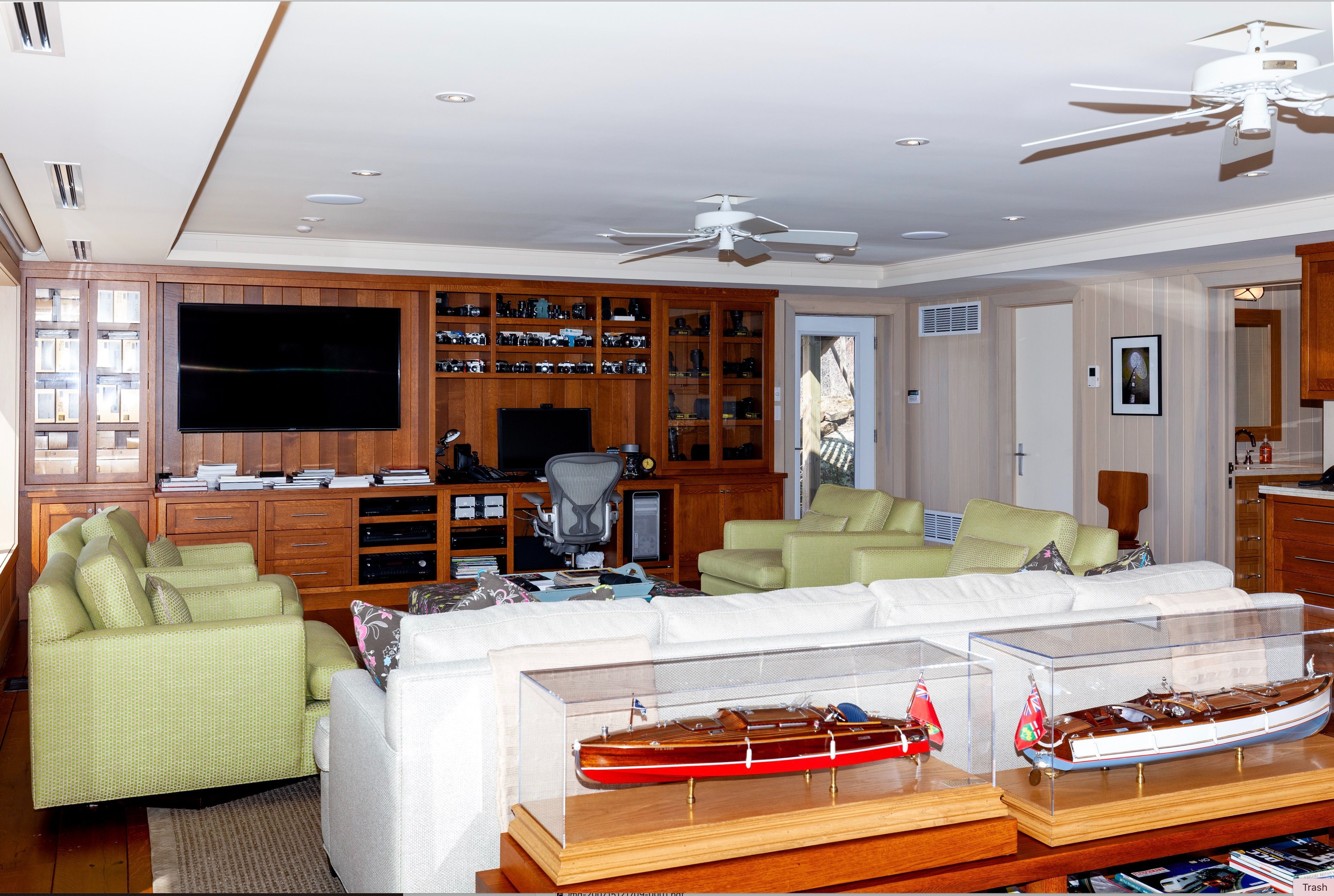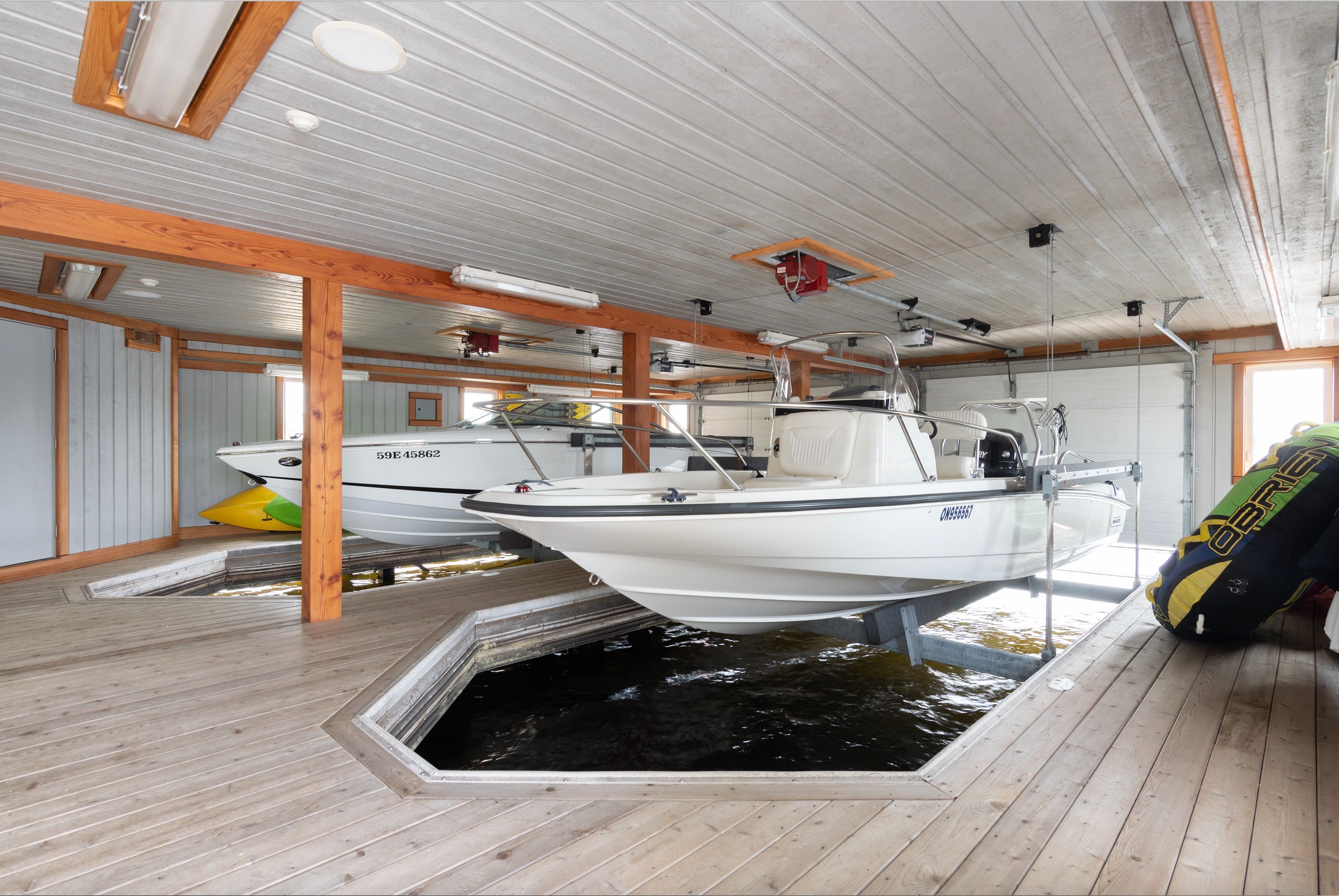 • Handsome two-storey boathouse with living quarters and multiple dock slips.