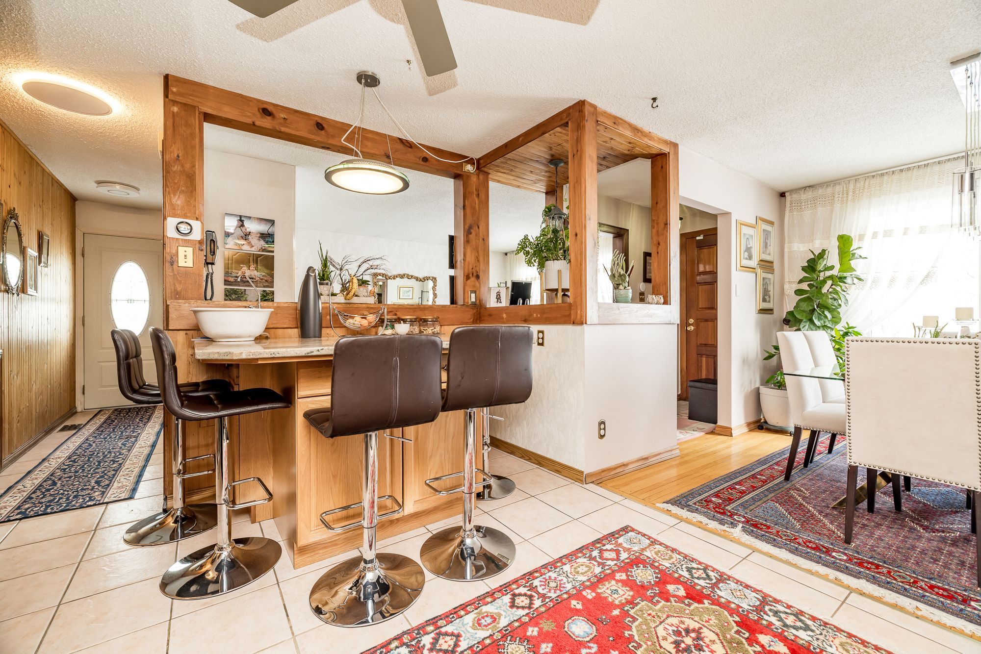 • Bright living room features soaring cathedral ceiling and dual-sided fireplace.