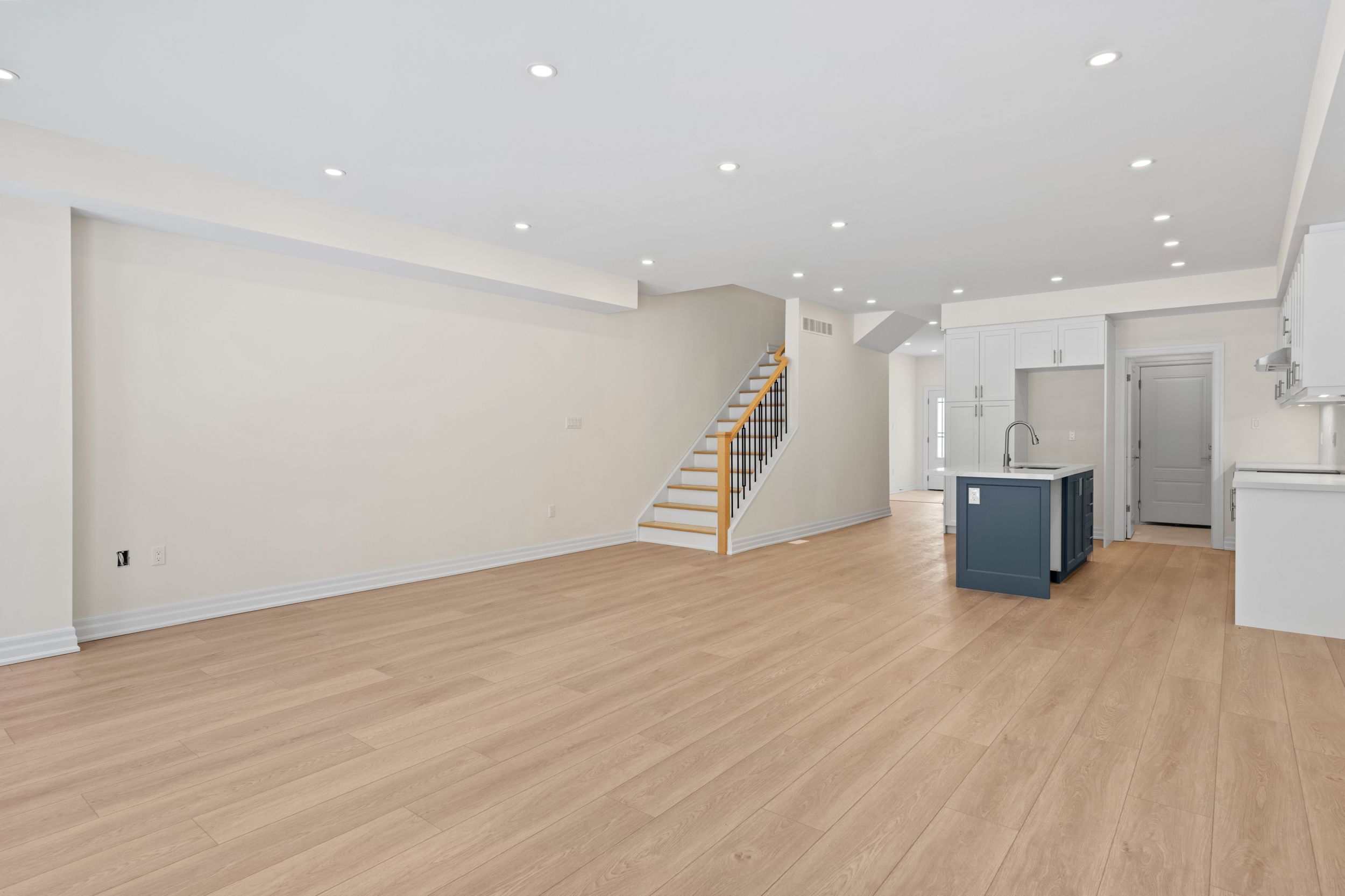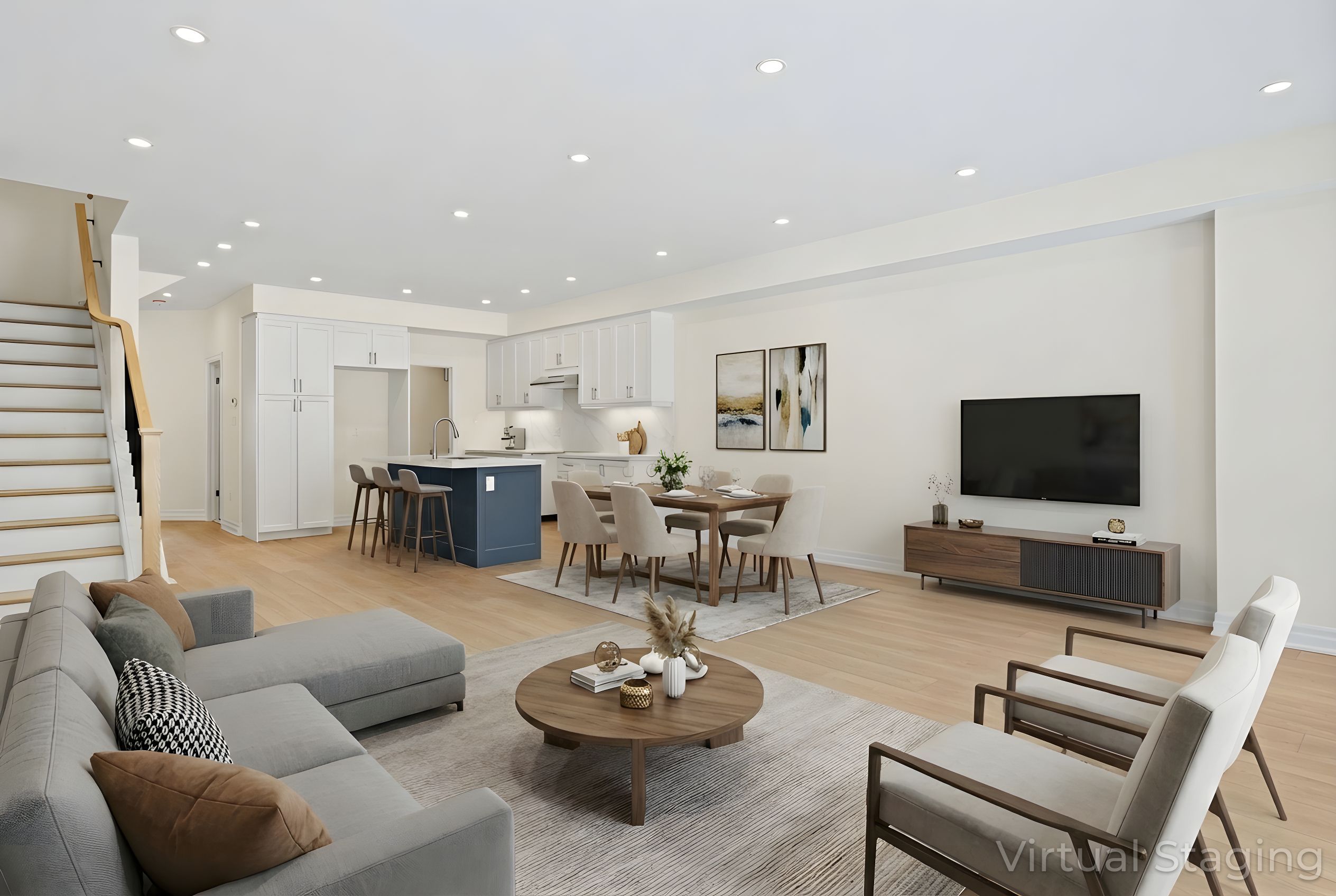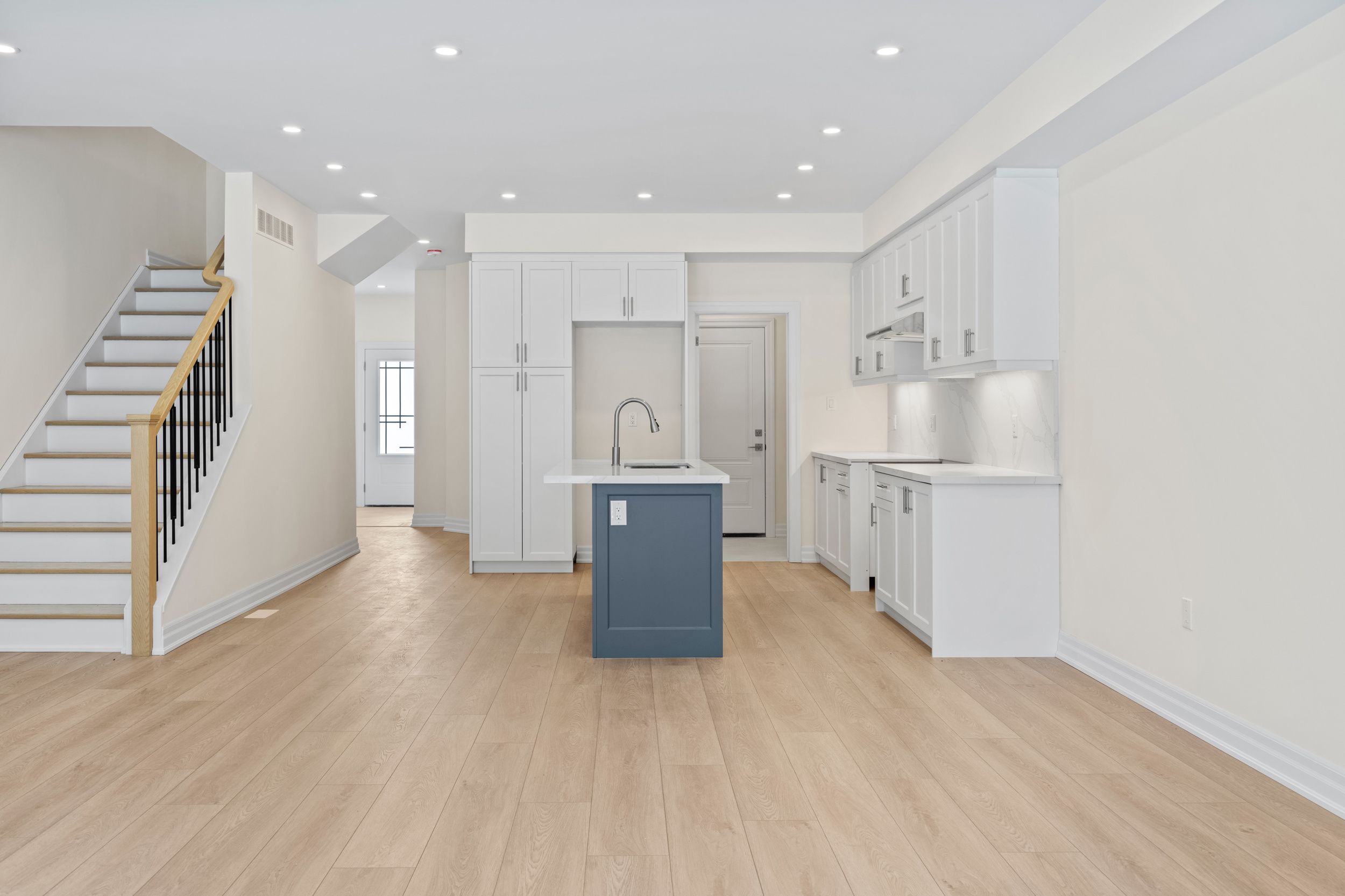 • Modern kitchen with a large quartz island, great for cooking and gatherings.