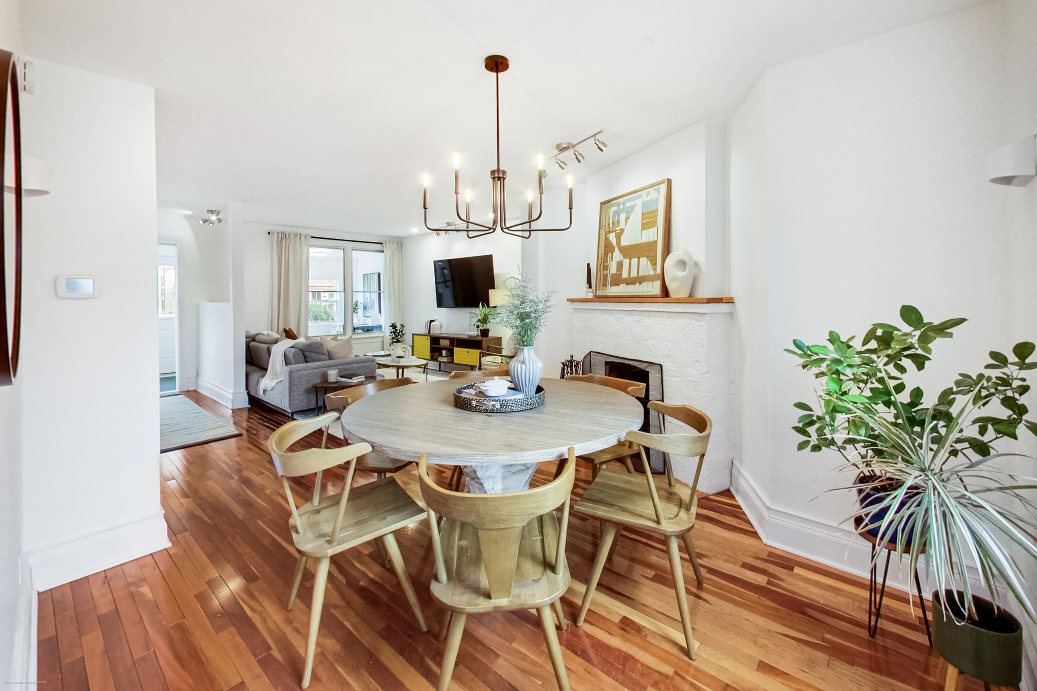 • Cozy living and dining areas with a non-operational wood-burning fireplace.