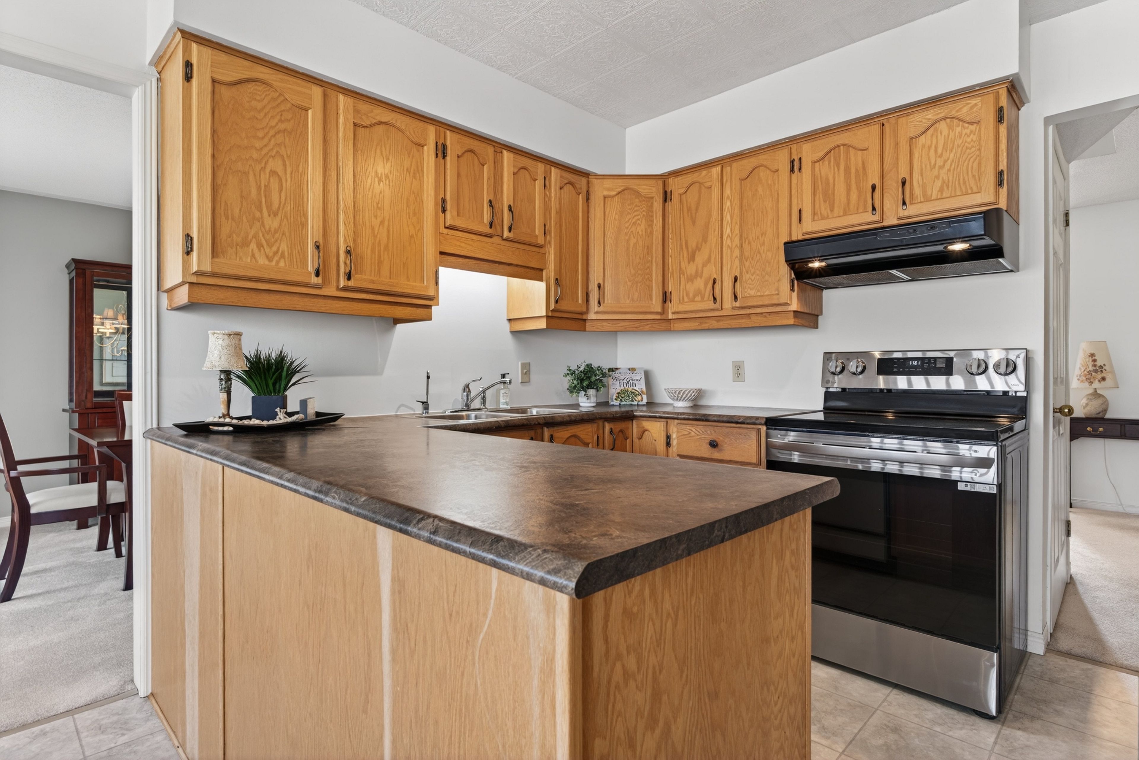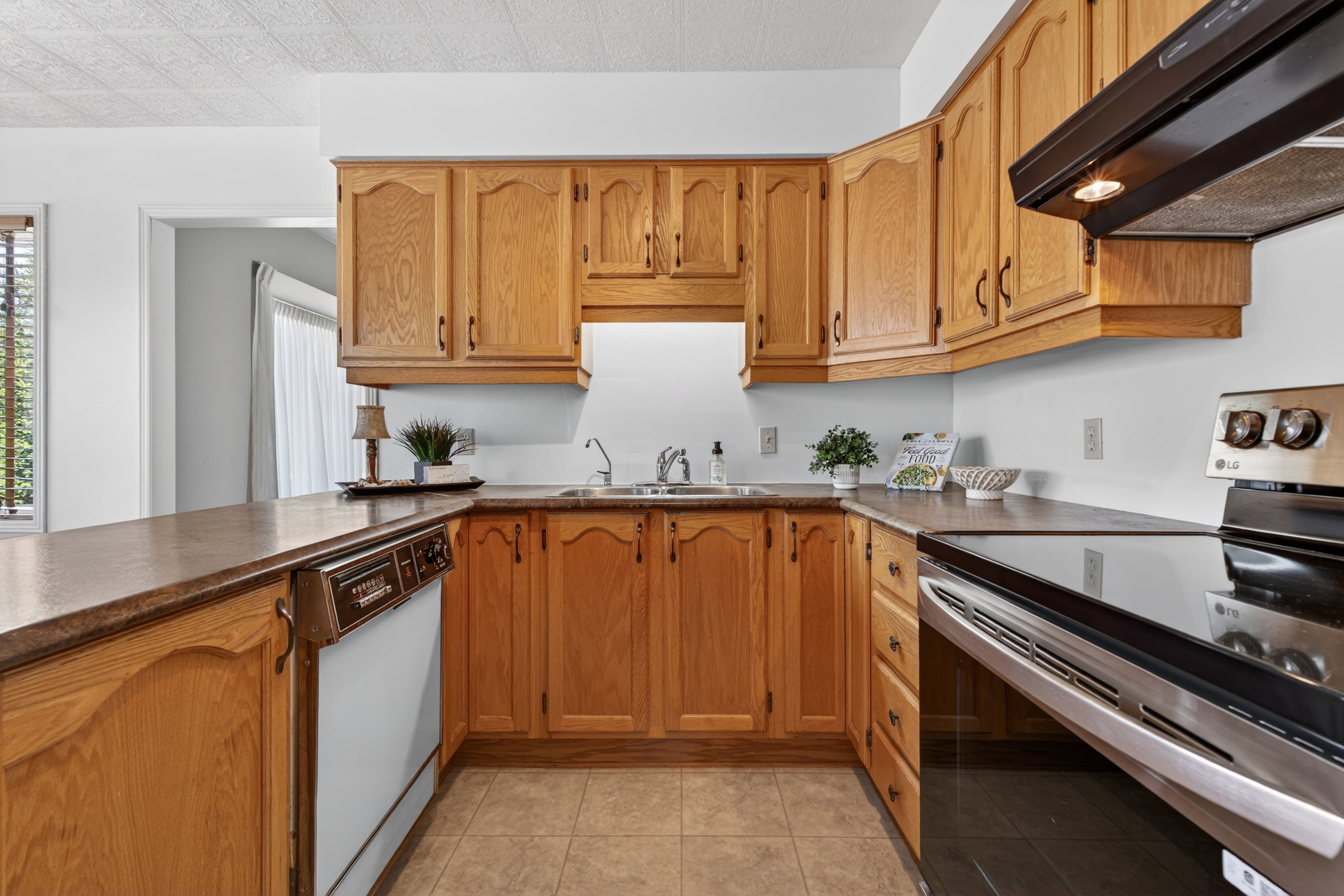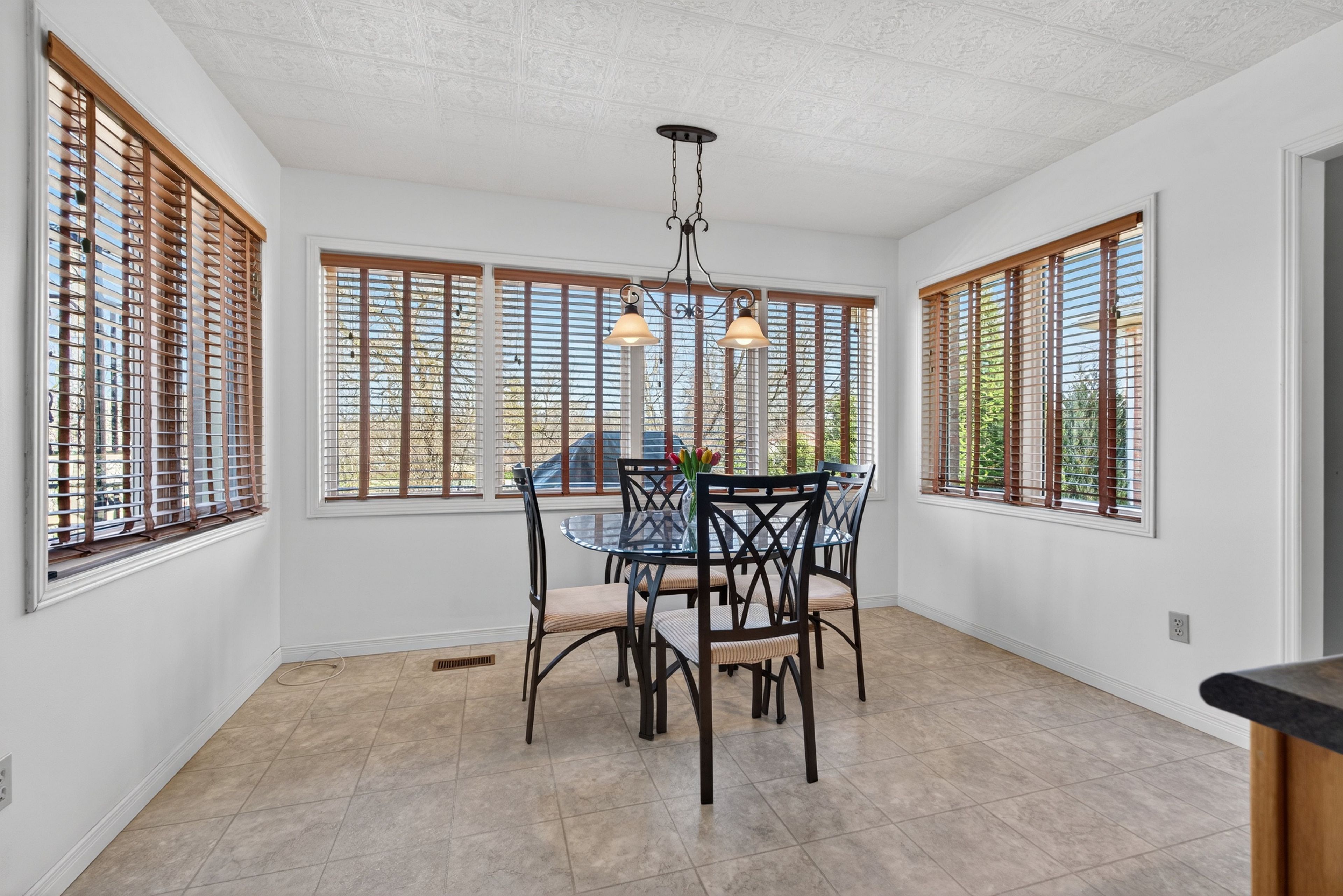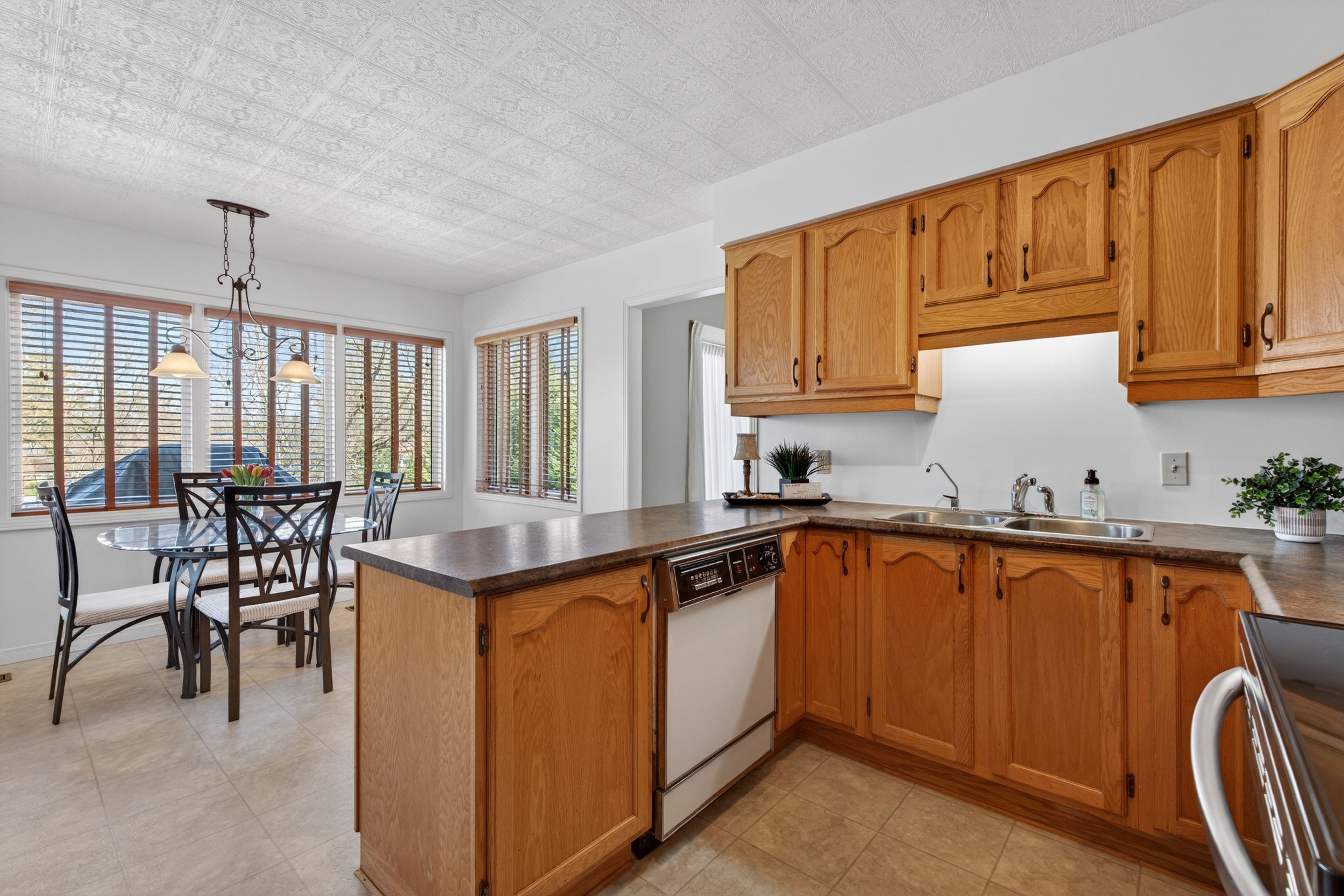 • Spacious eat-in kitchen with large windows and serene backyard views.