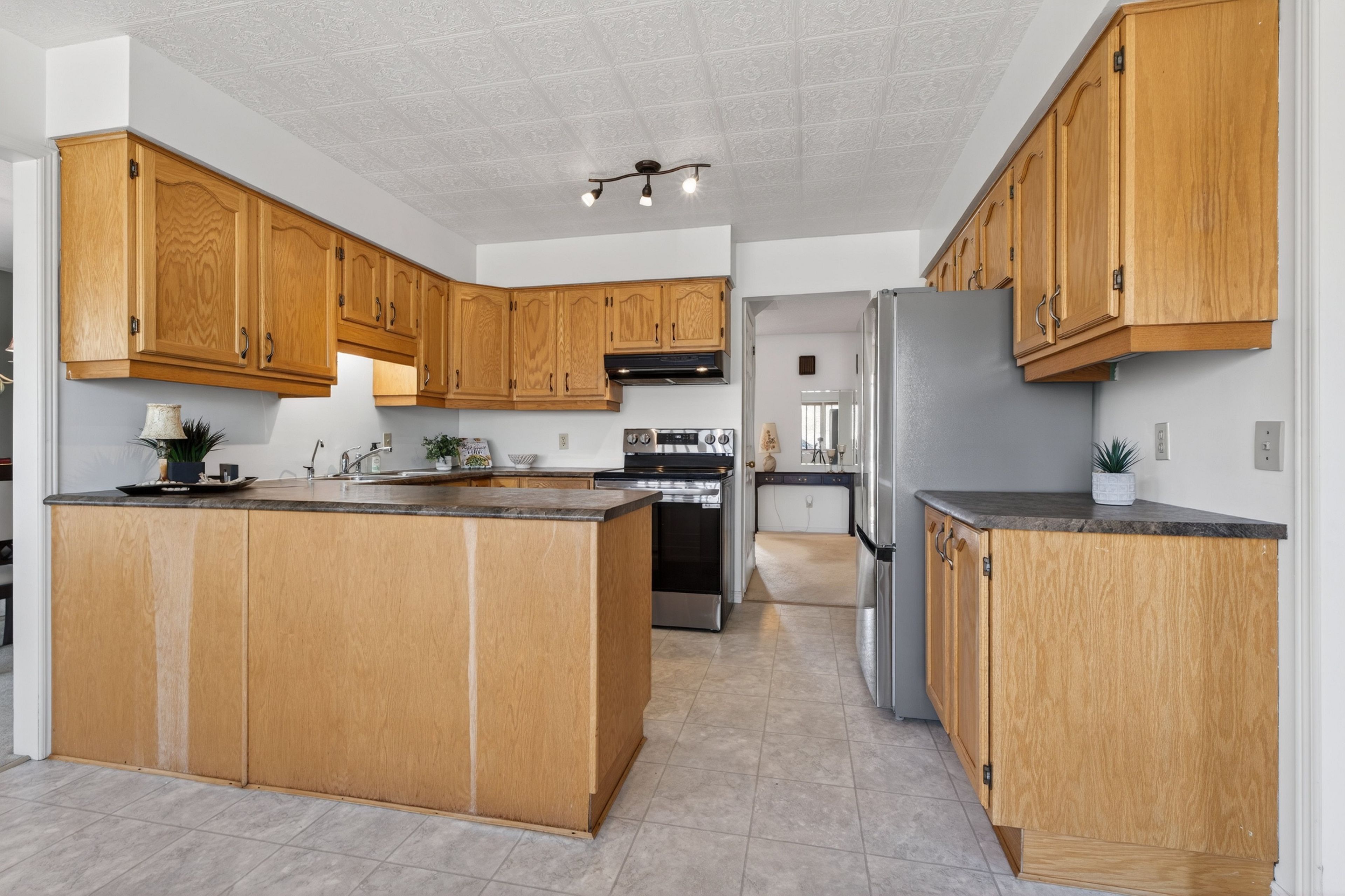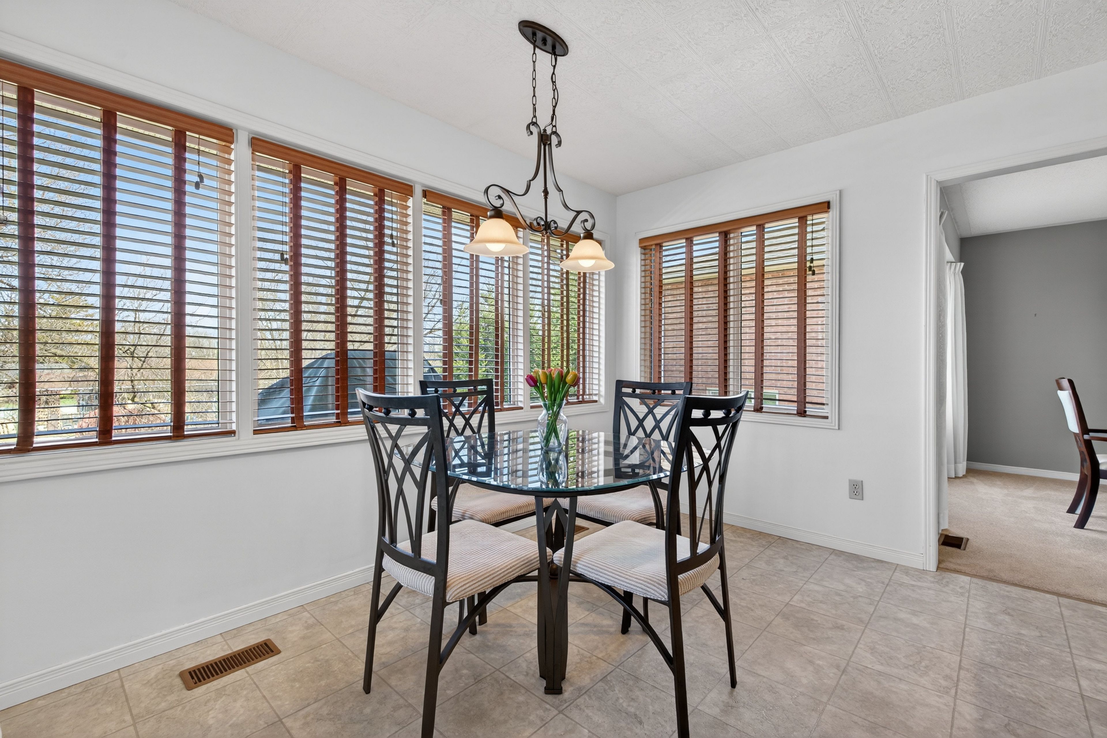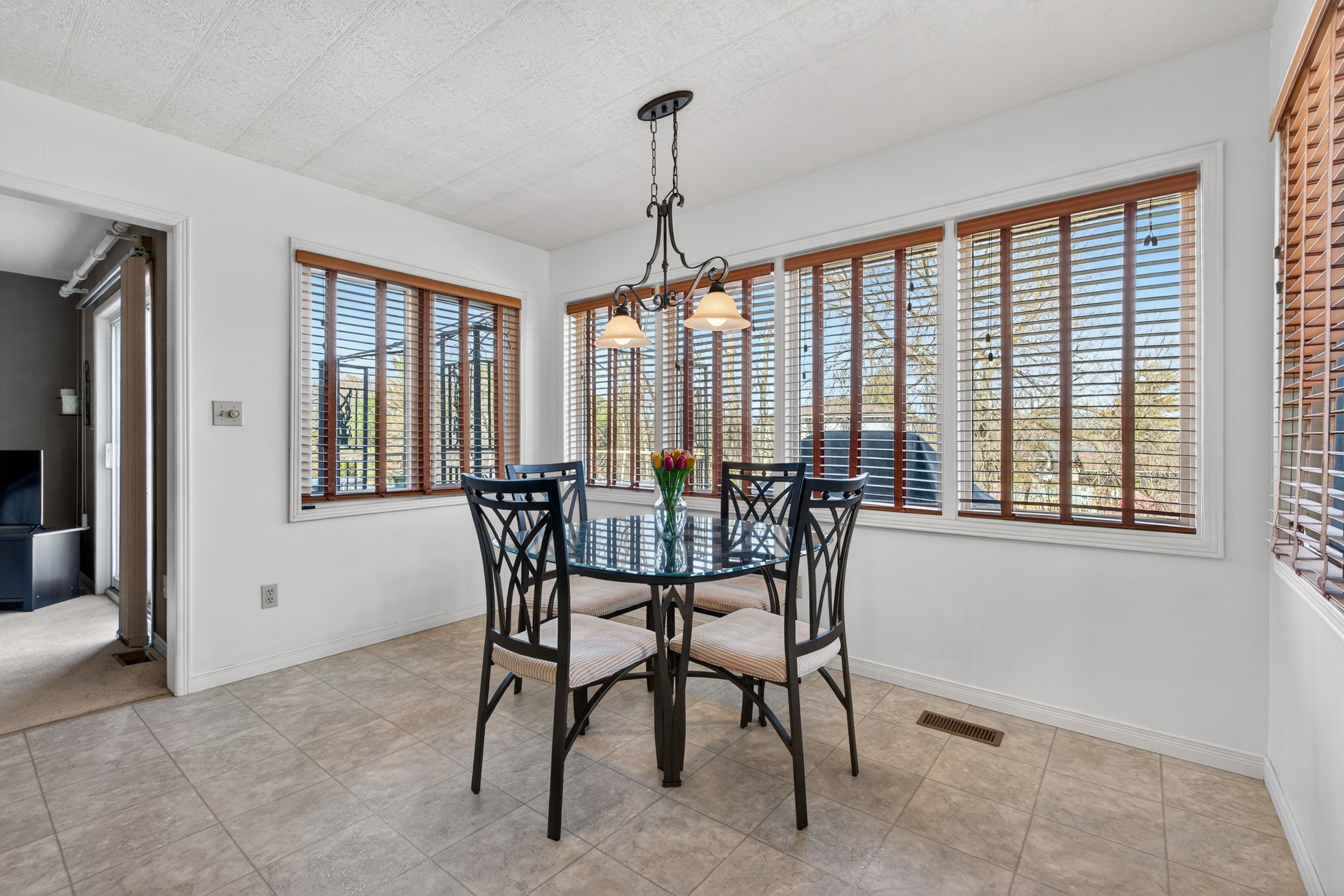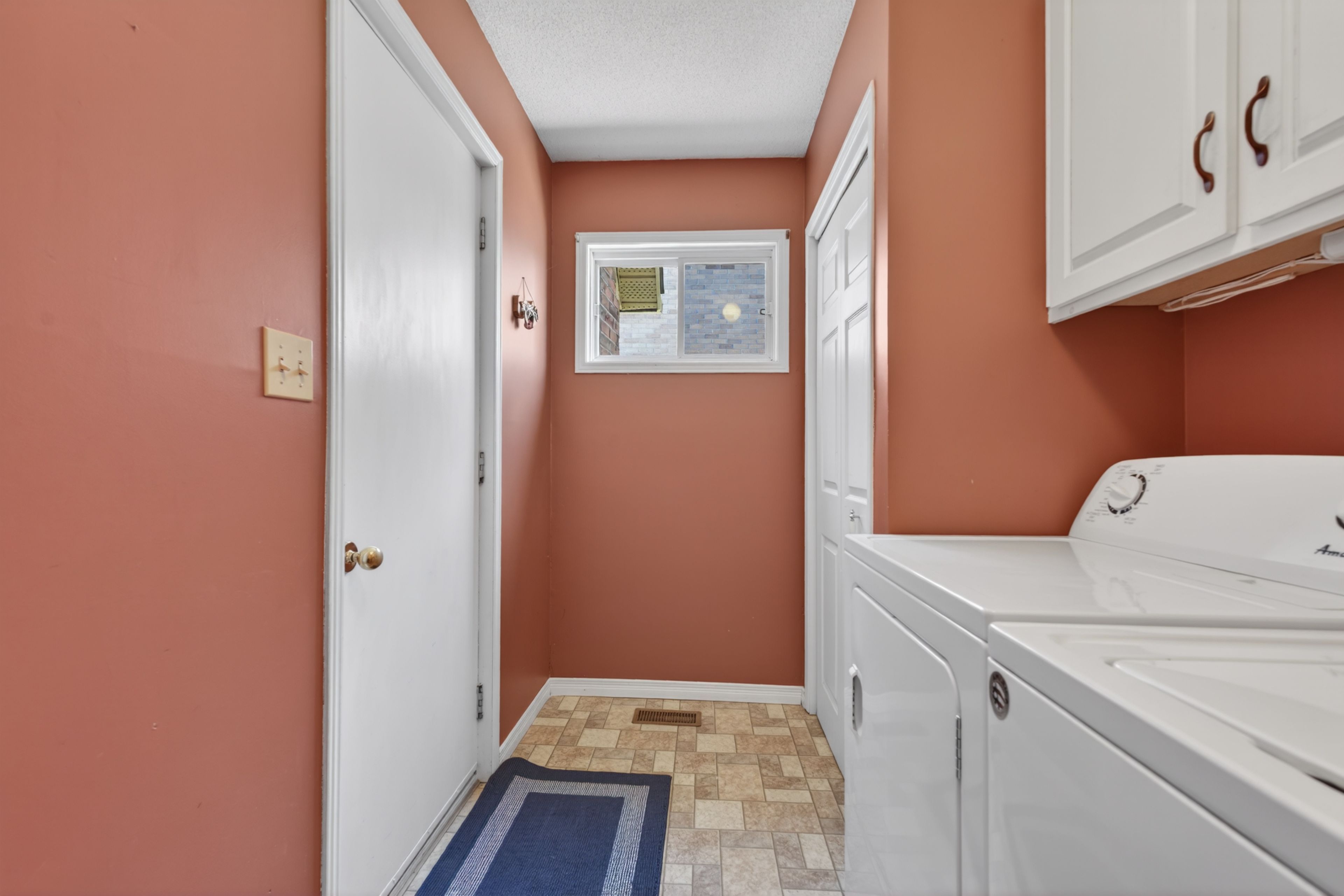 • Spacious eat-in kitchen with large windows and serene backyard views.