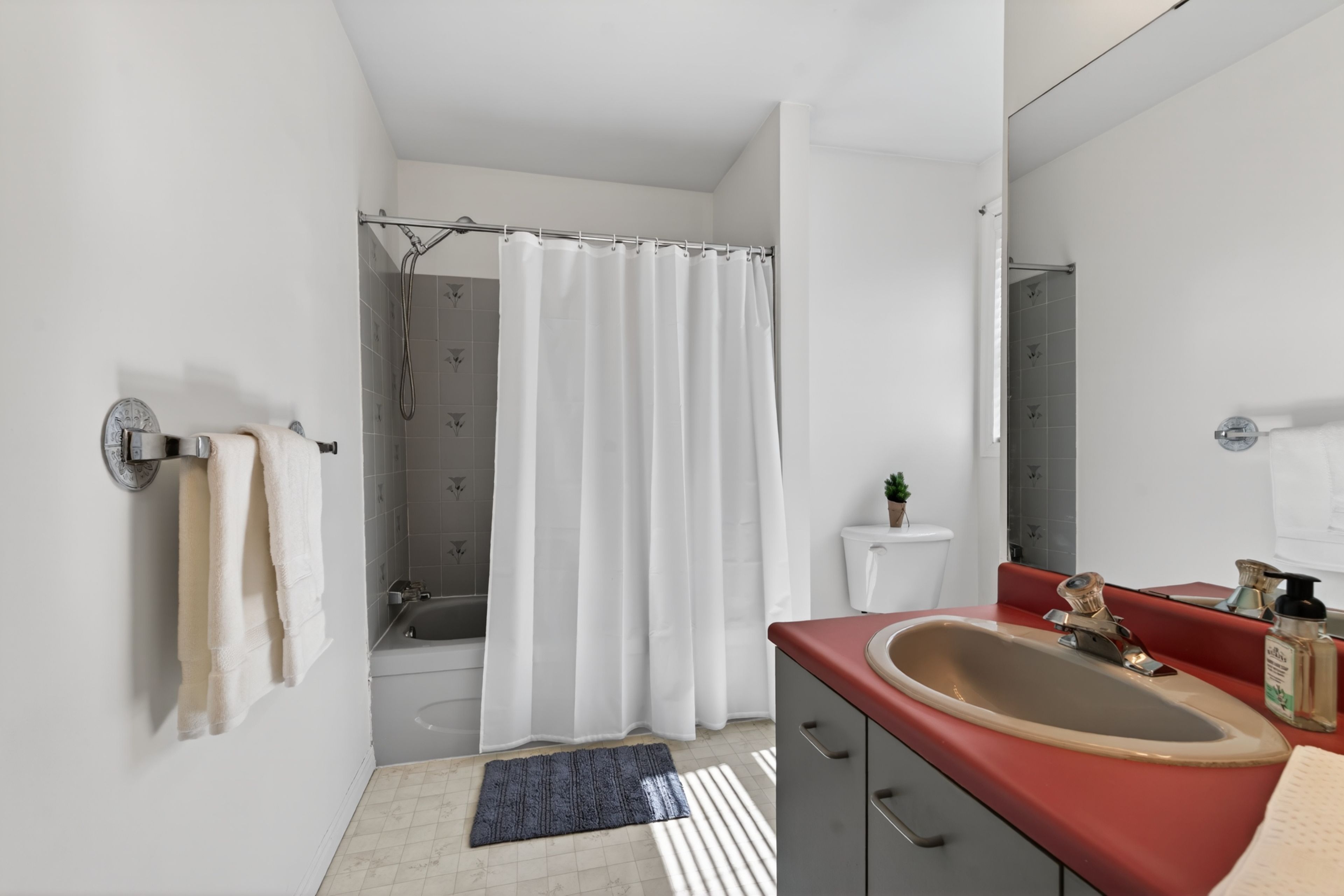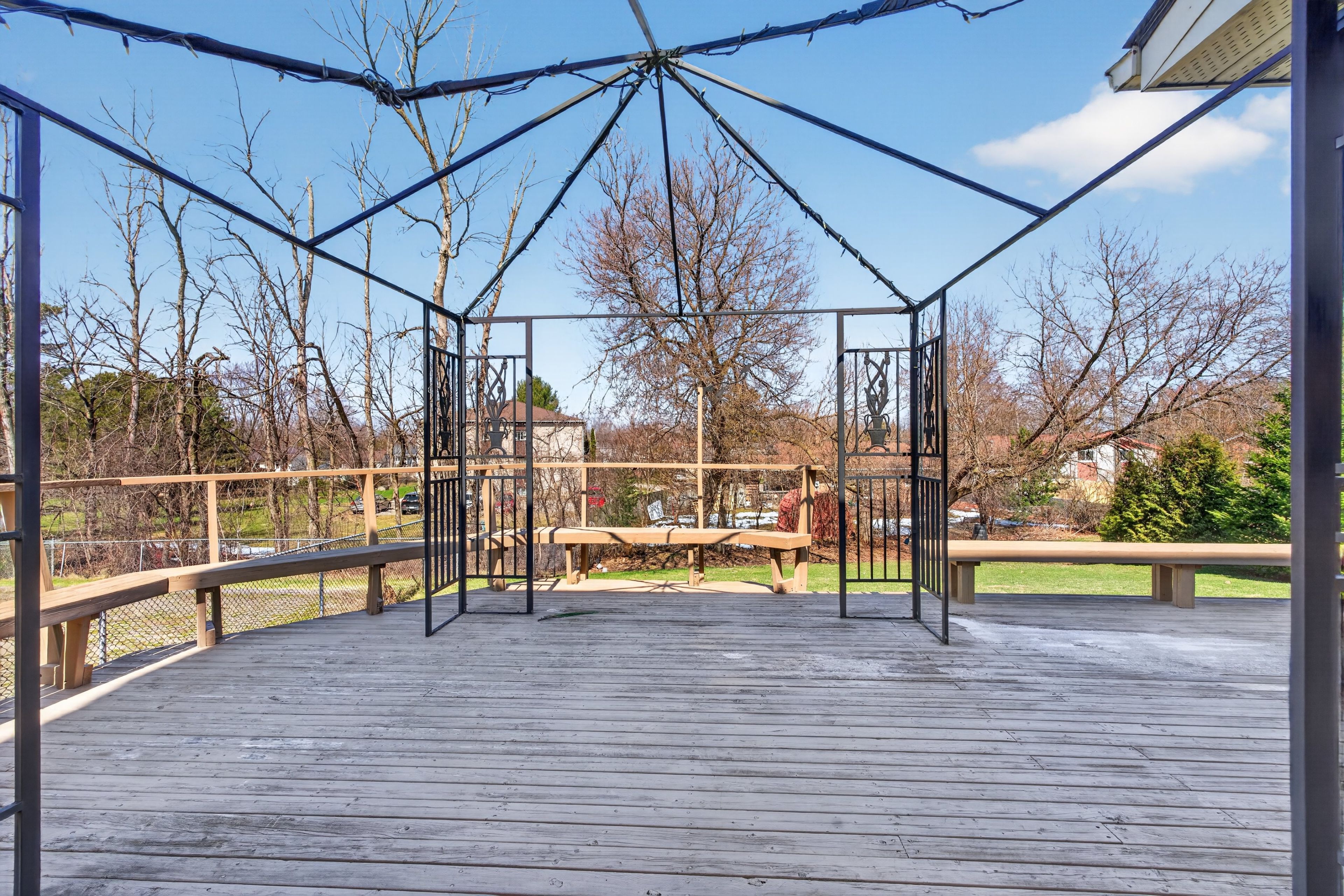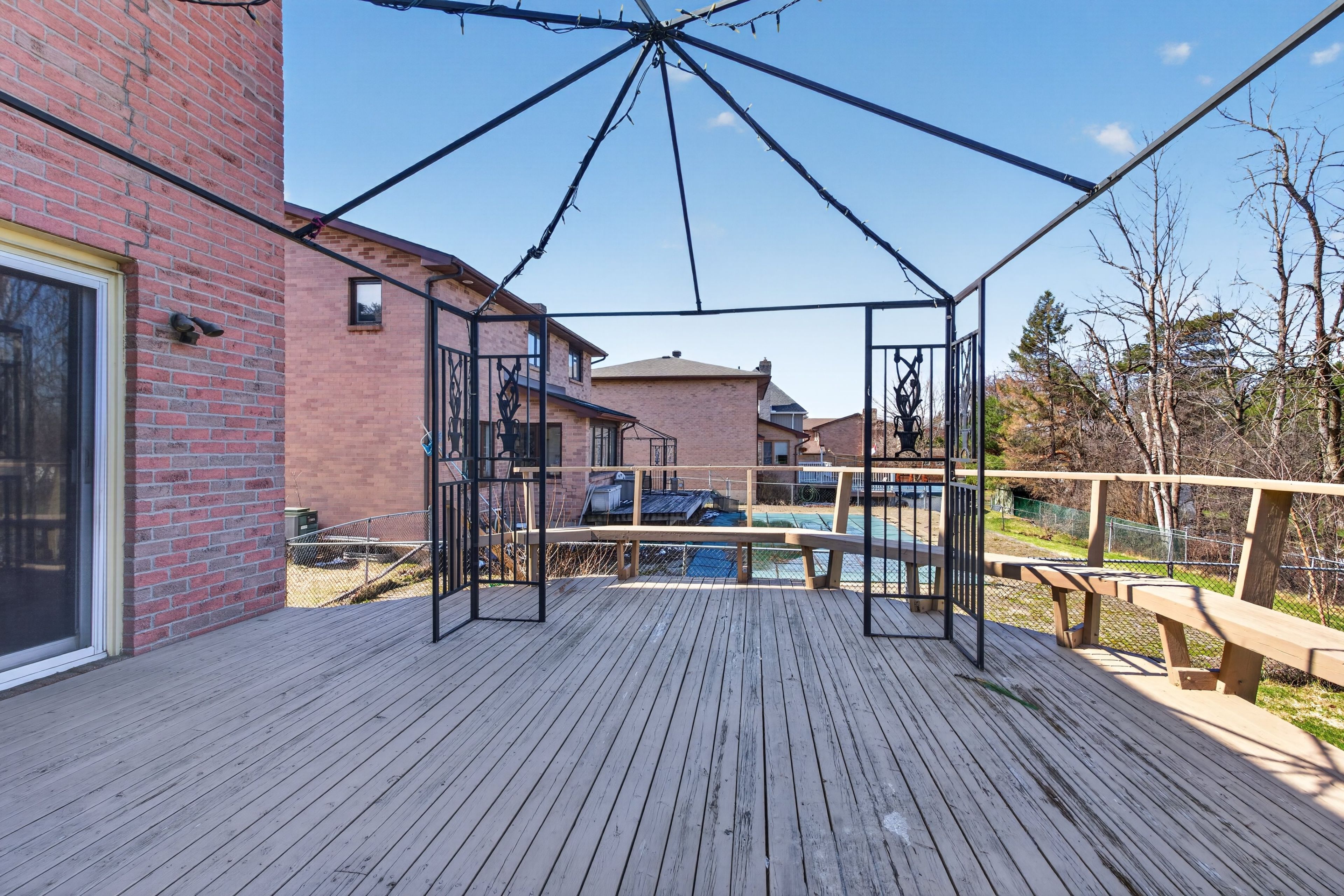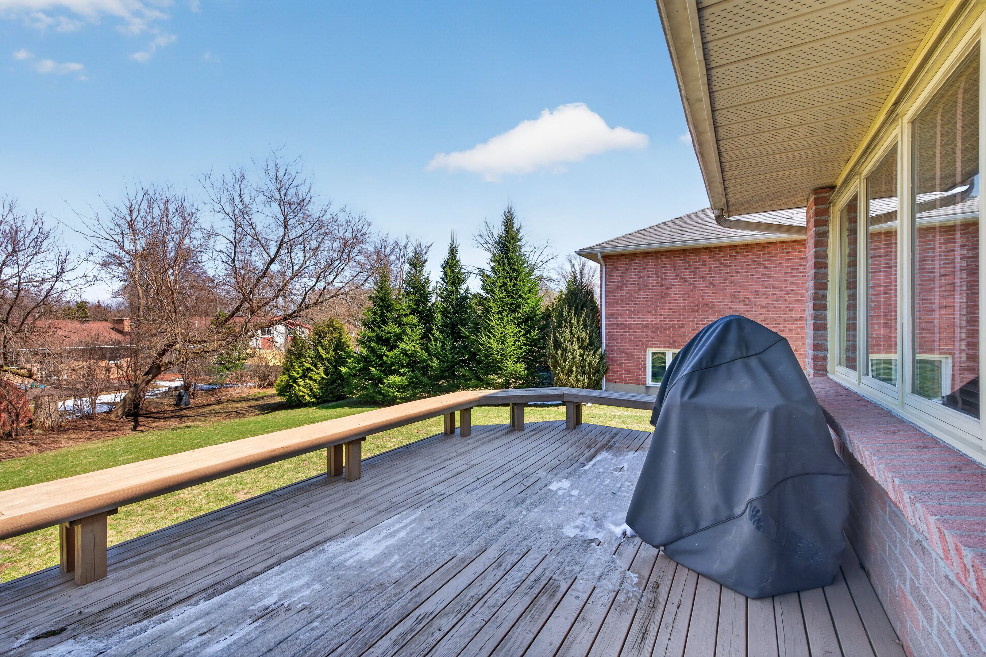 • Spacious eat-in kitchen with large windows and serene backyard views.