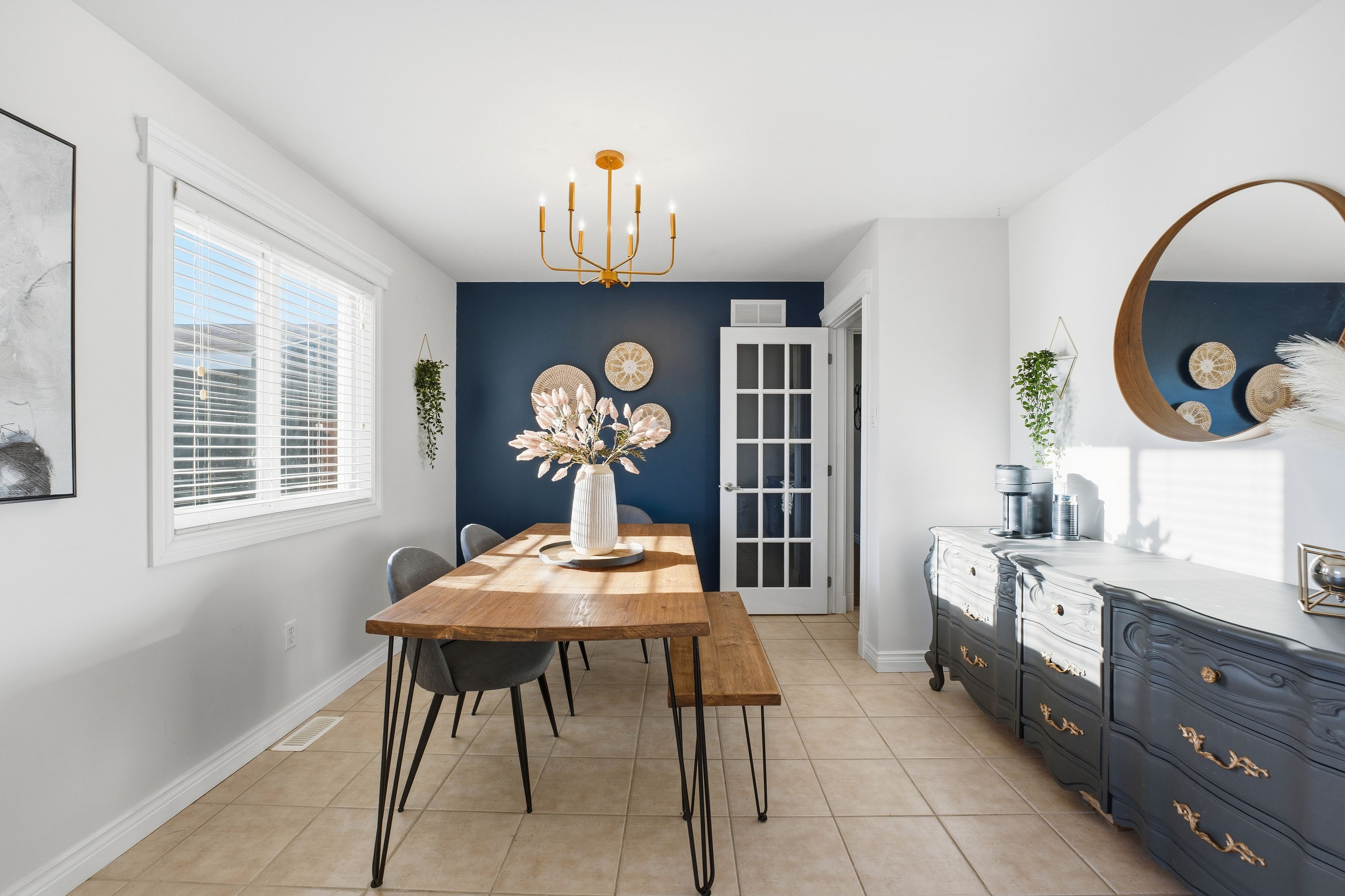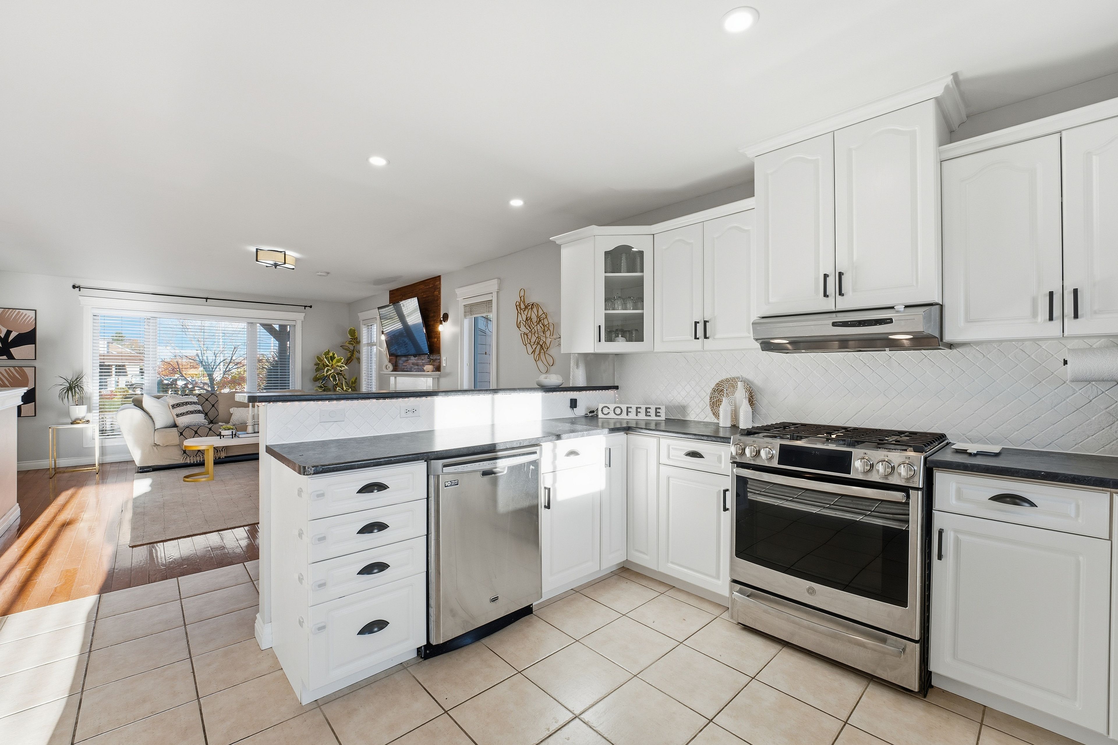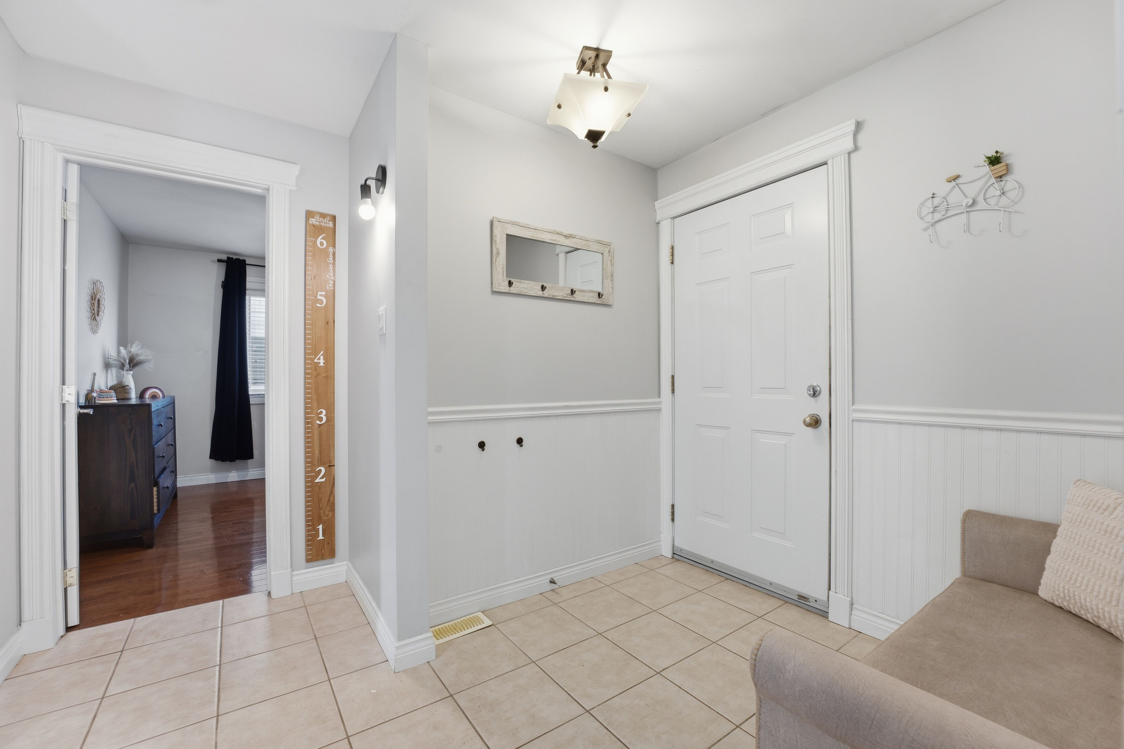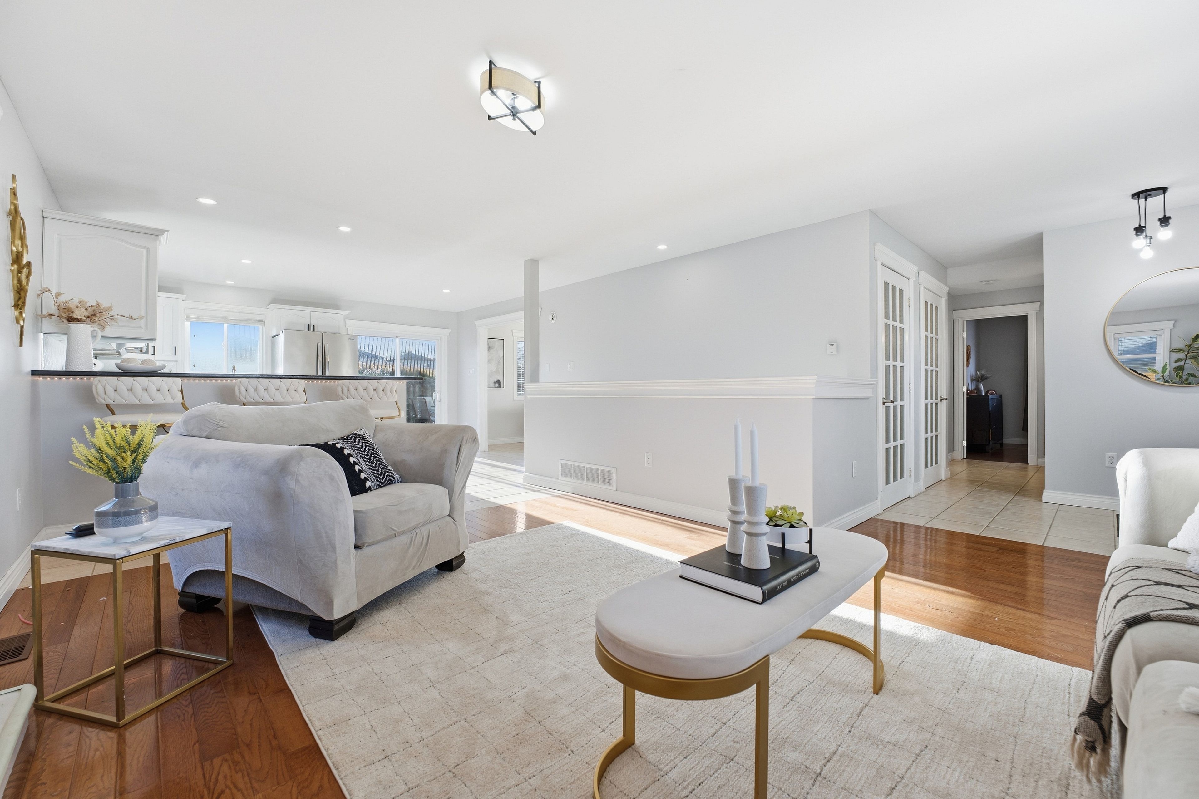 • Open-concept main level with hardwood and ceramic flooring.