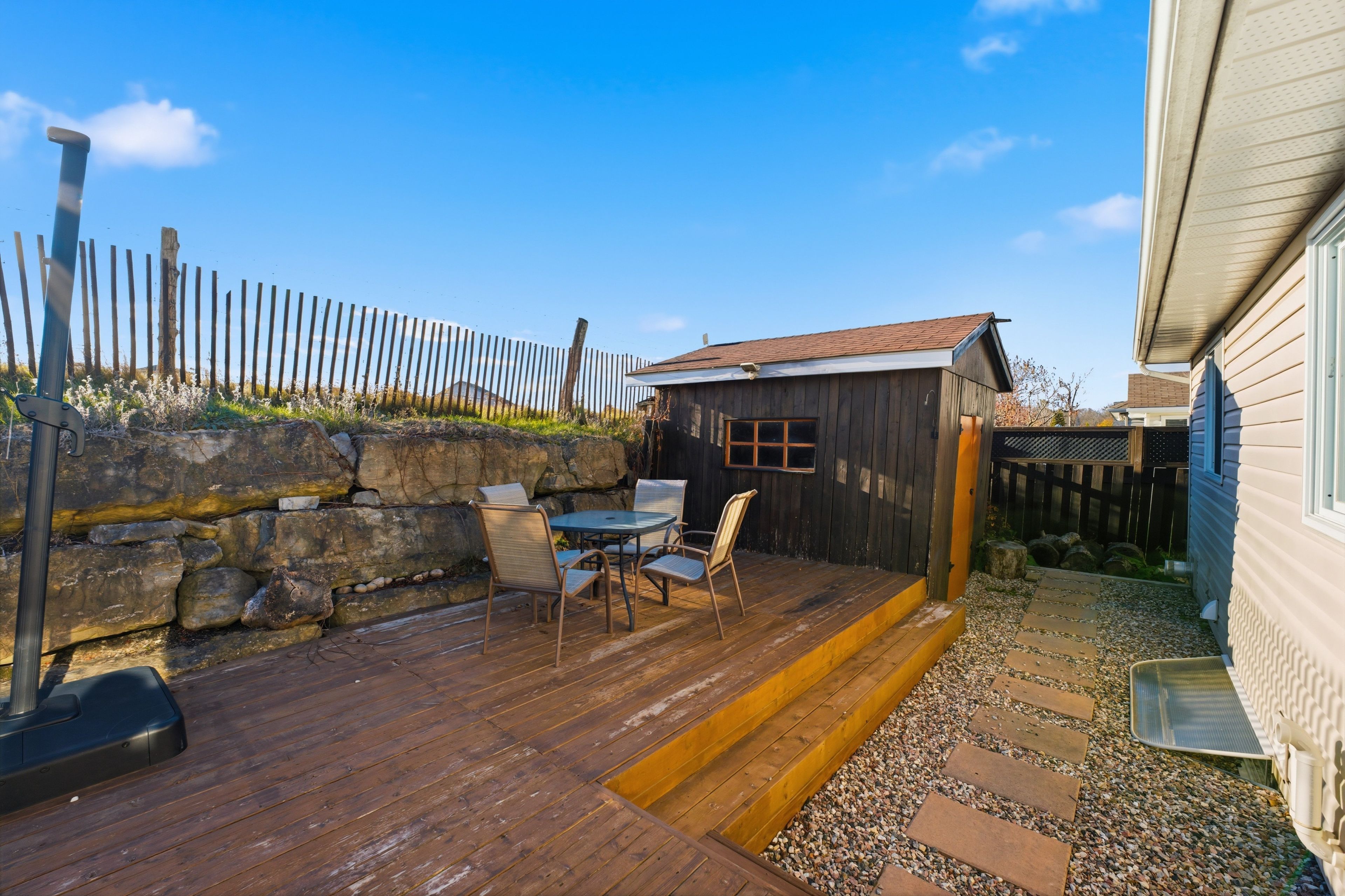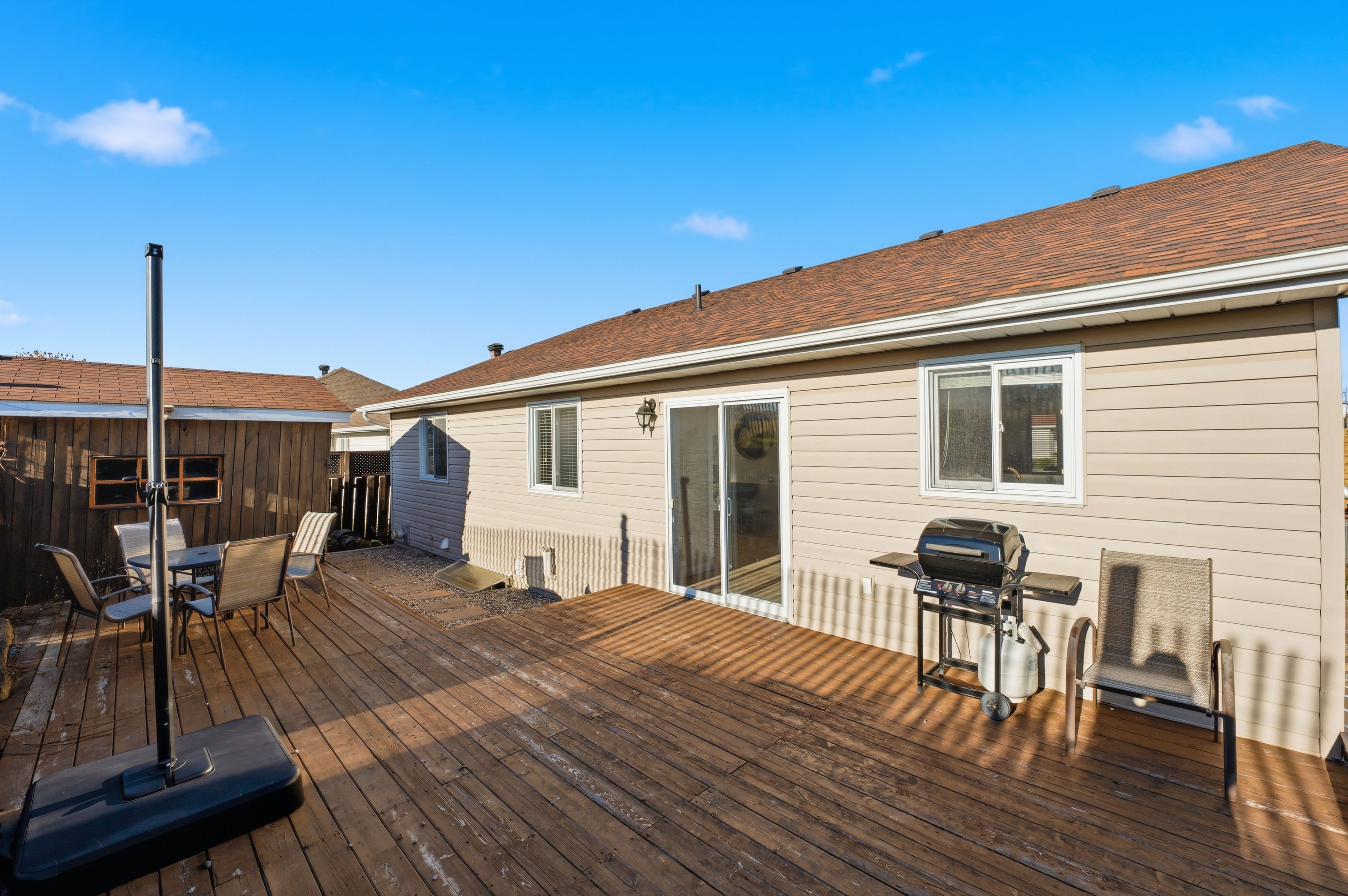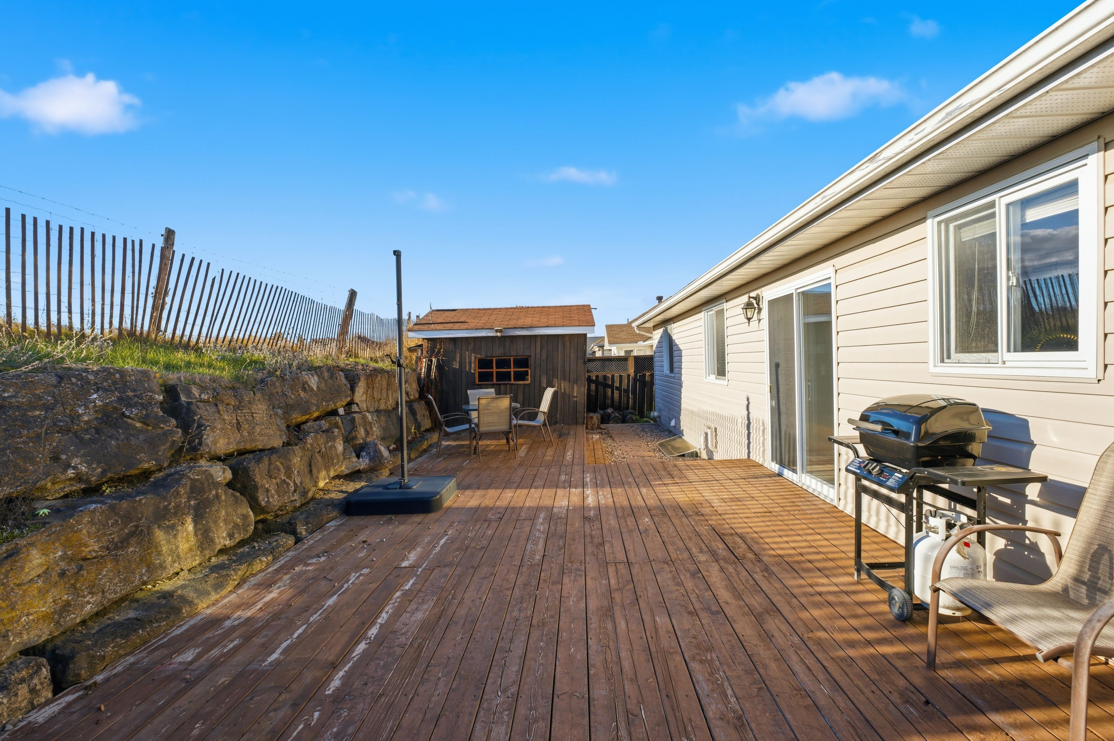• Private backyard retreat featuring an extended deck and garden shed.