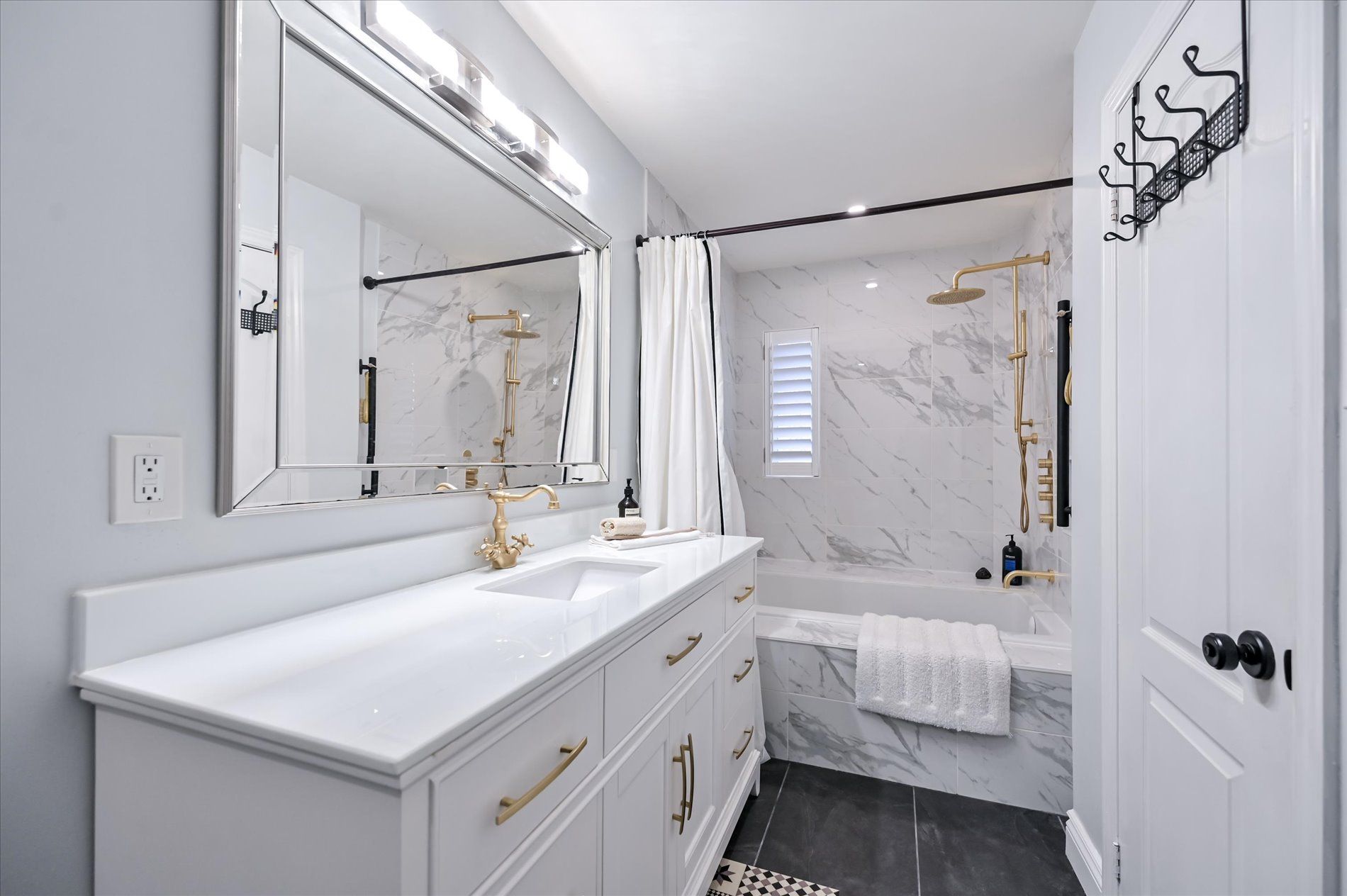 • Modern kitchen with quartz countertops and stainless steel appliances for easy entertaining.