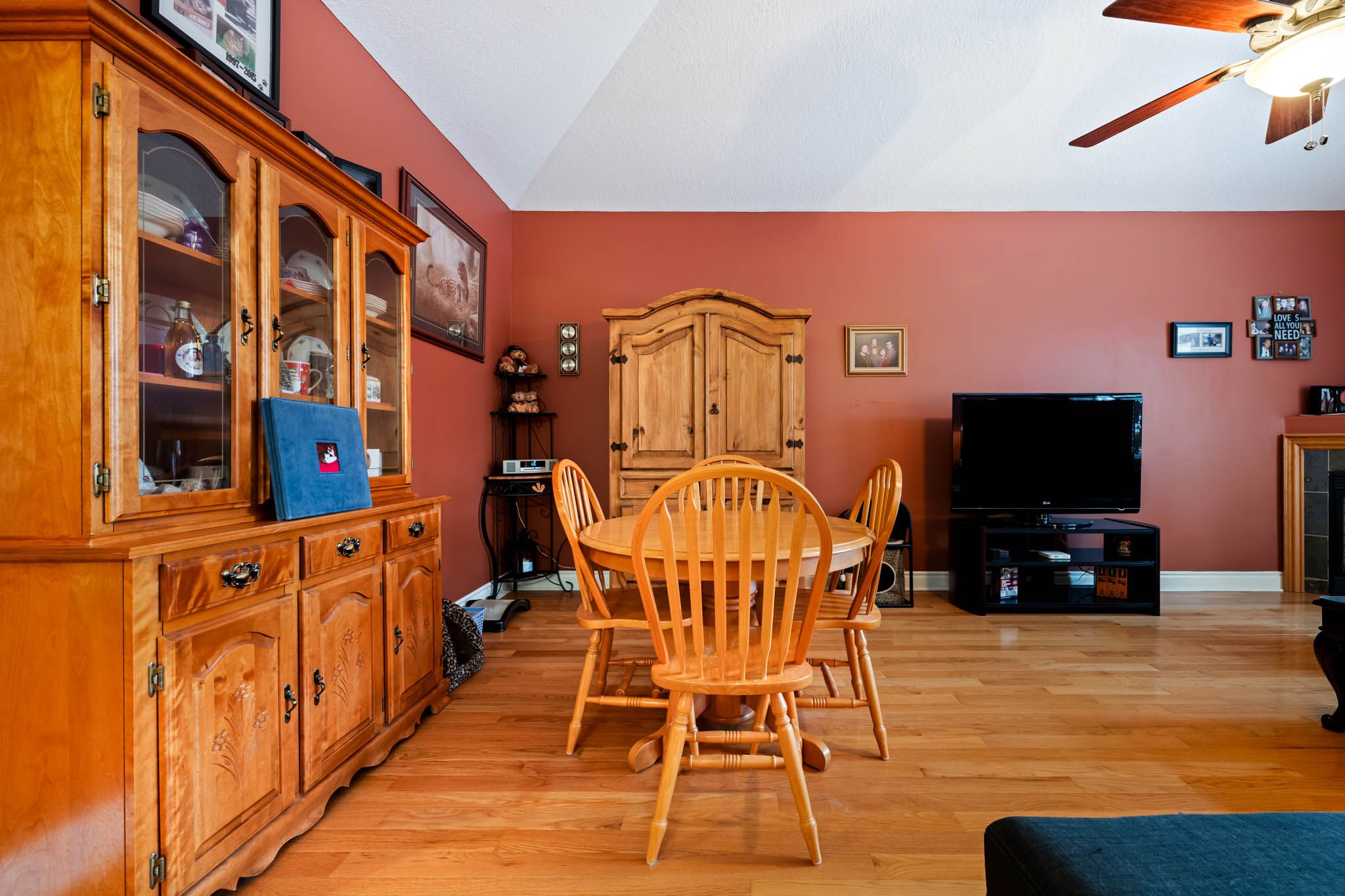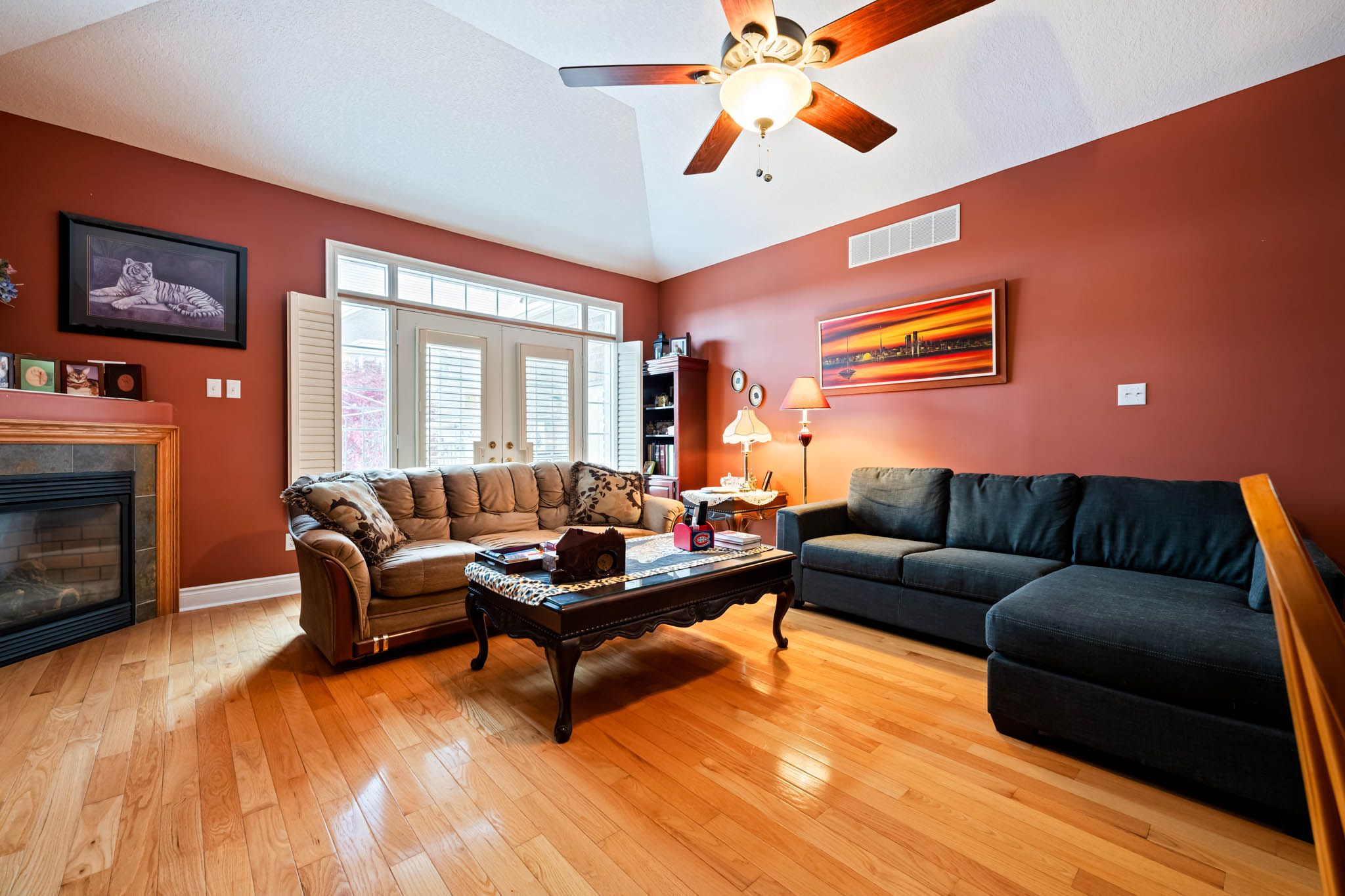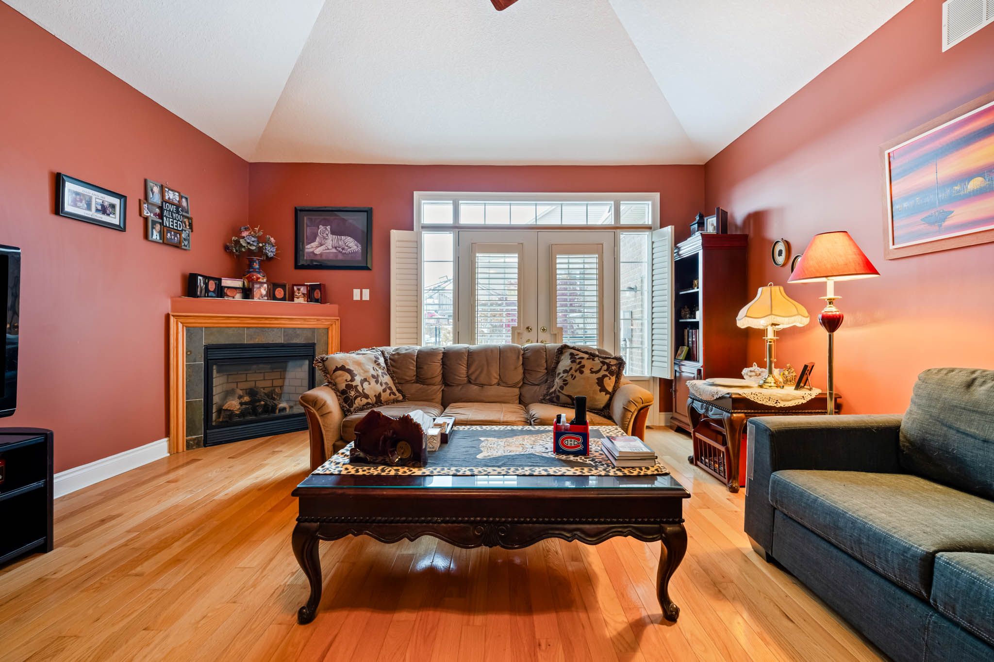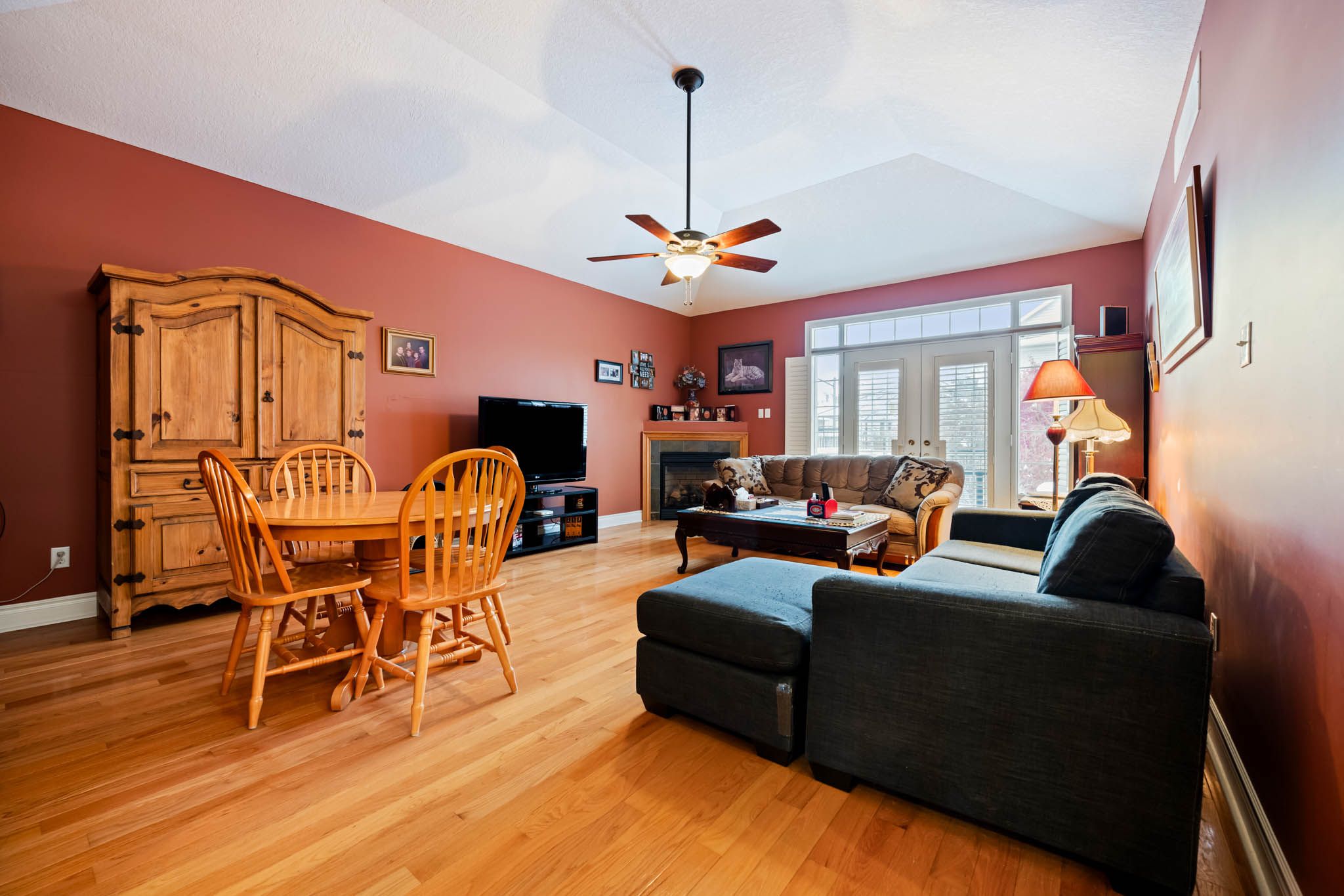 • Impressive living/dining area with vaulted ceiling and gas fireplace.