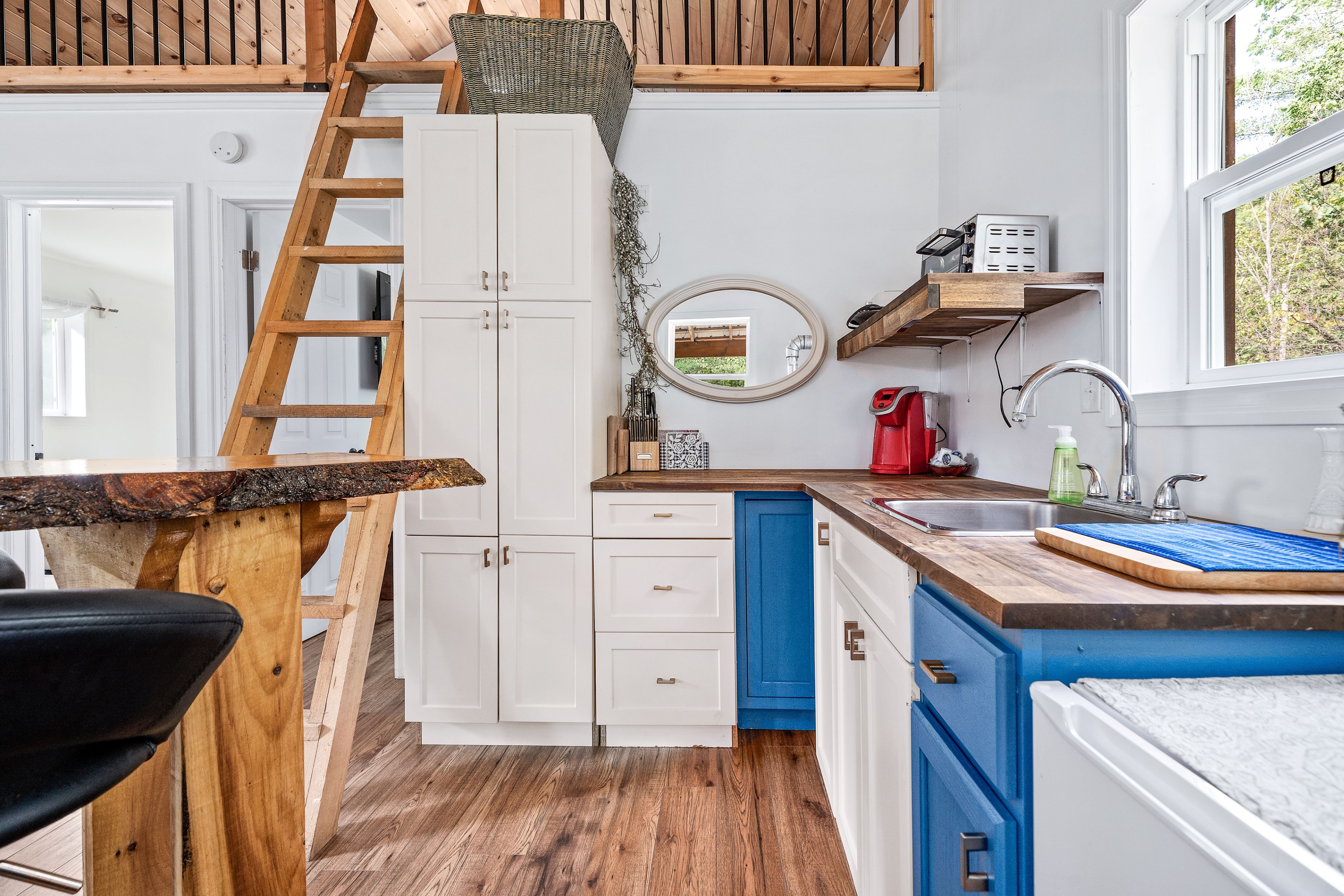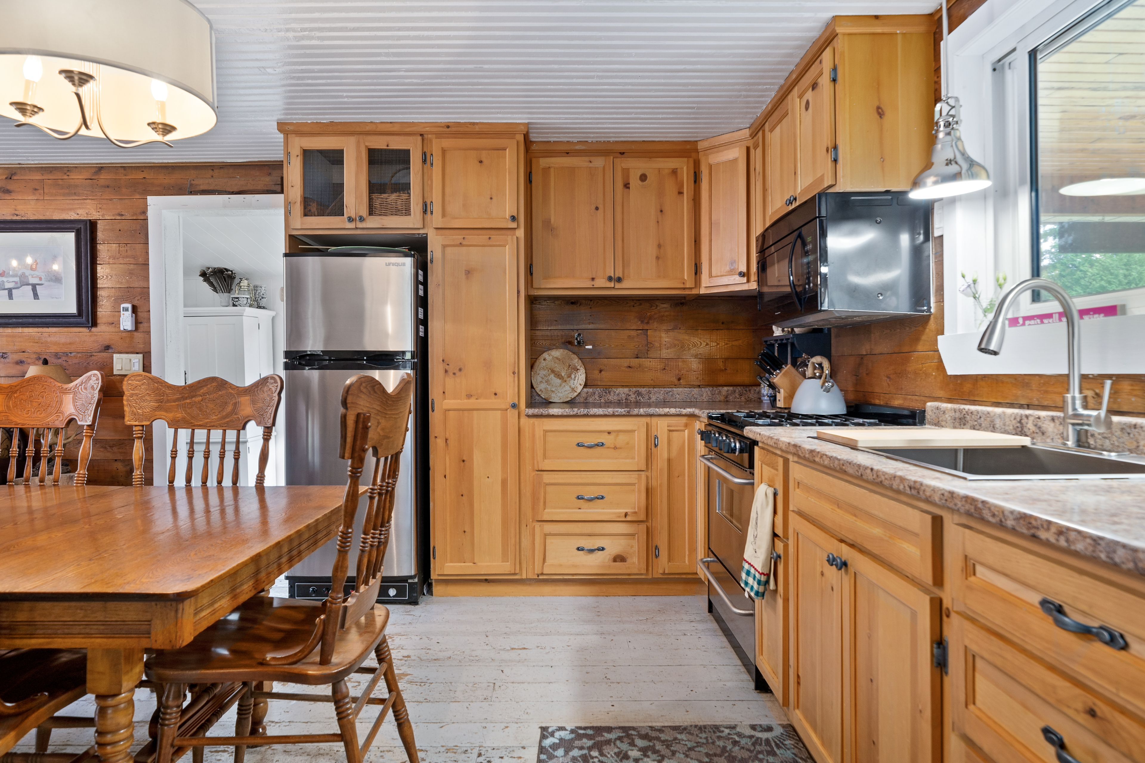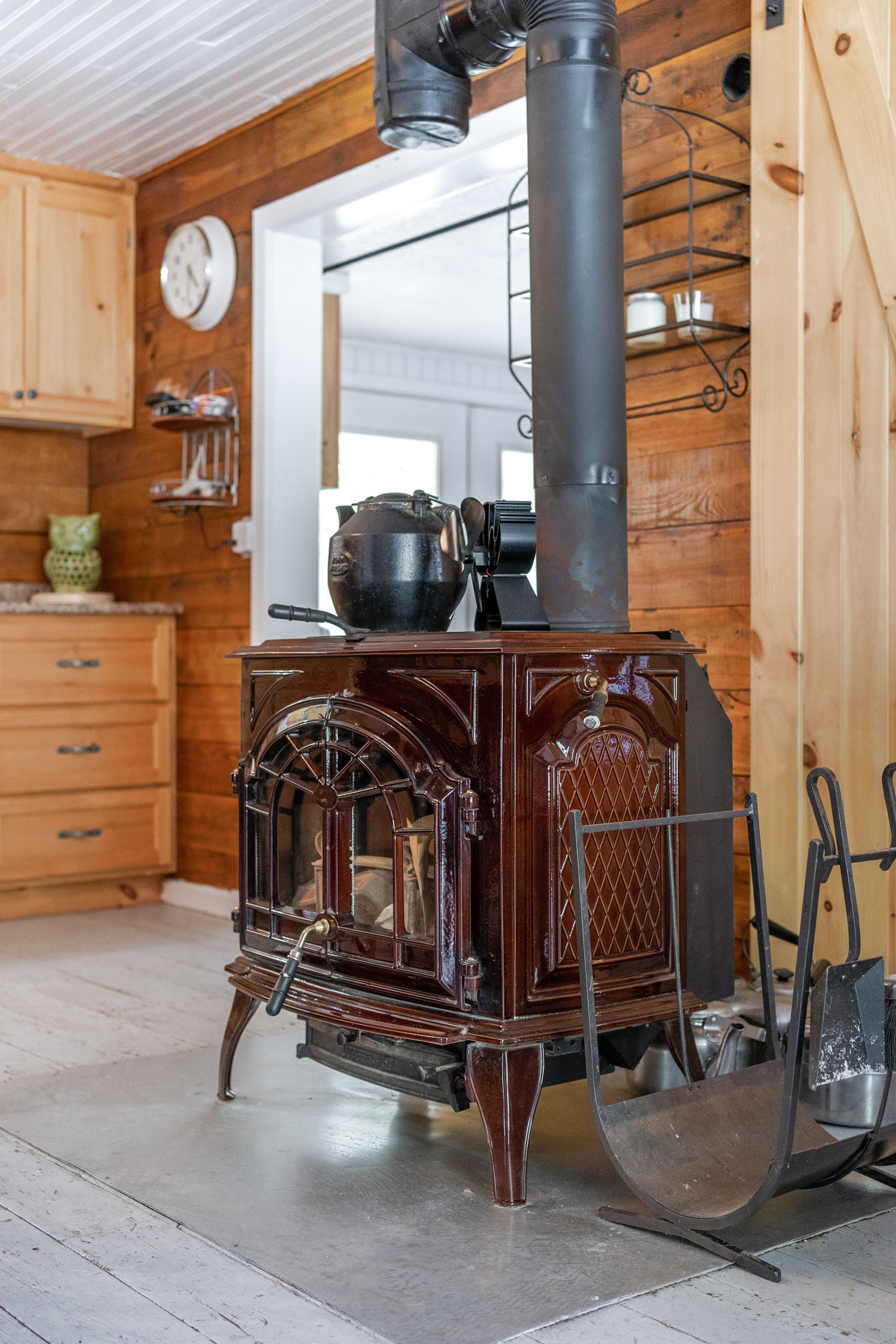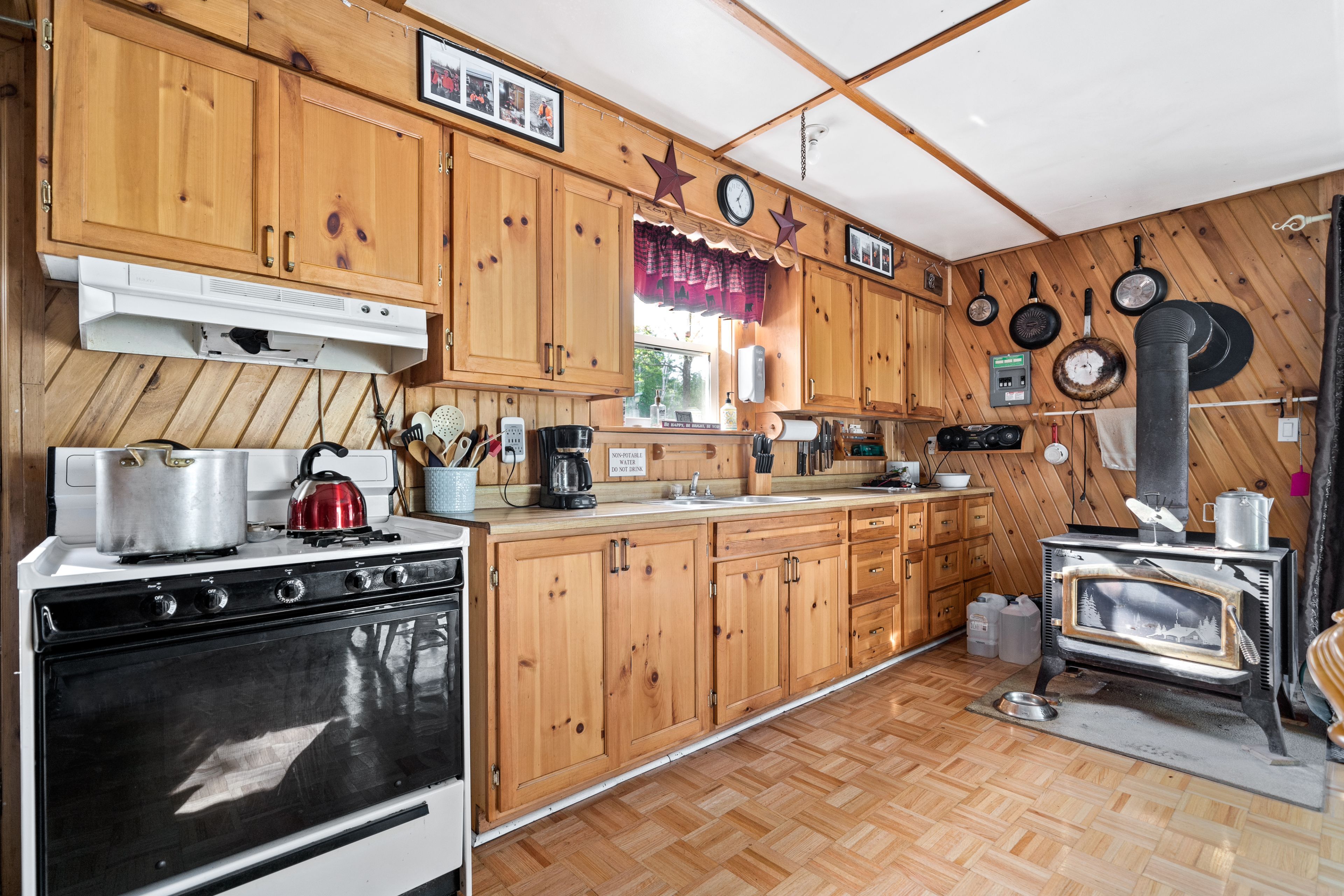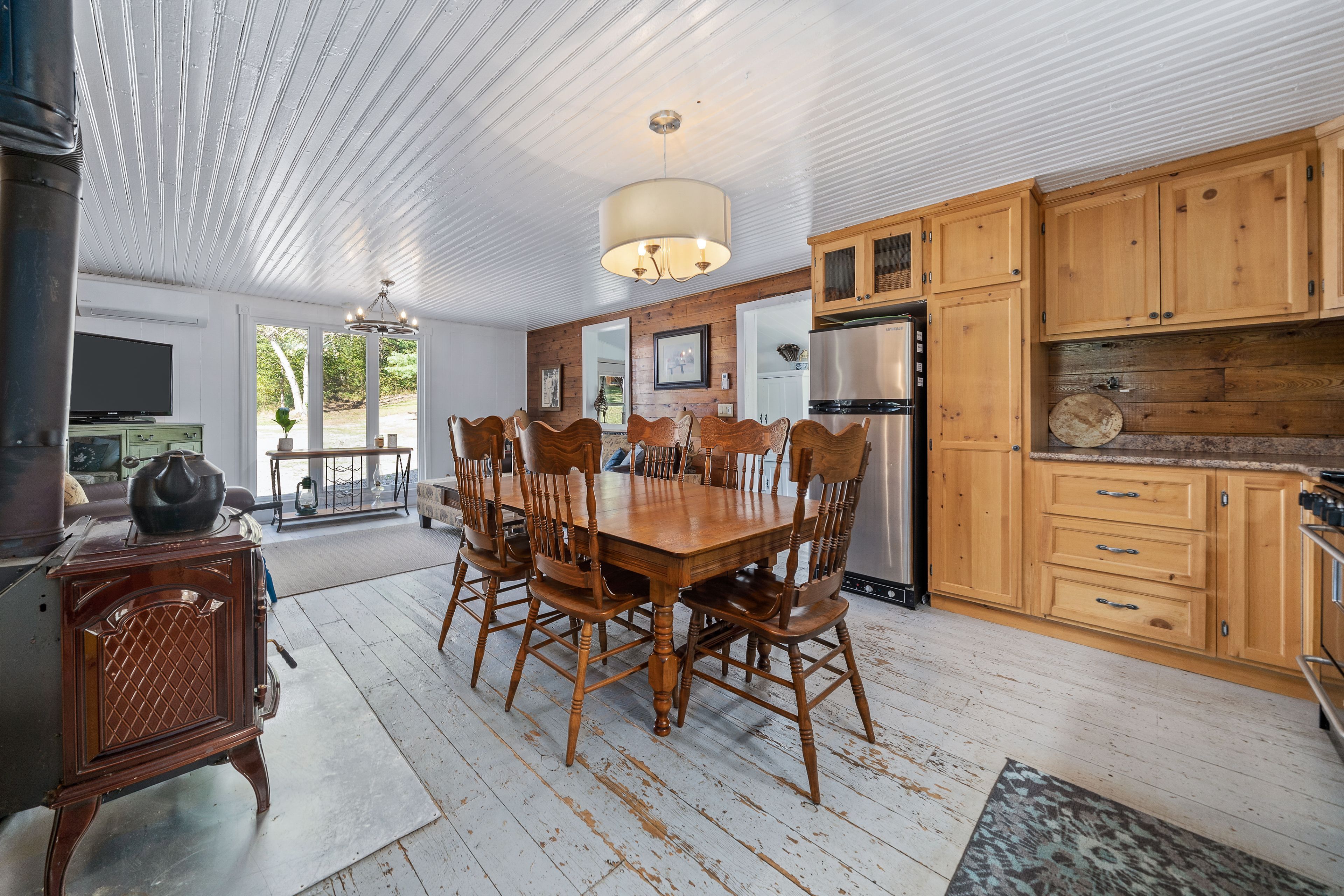 • Main Cabin features spacious, nostalgic design with wood stove.