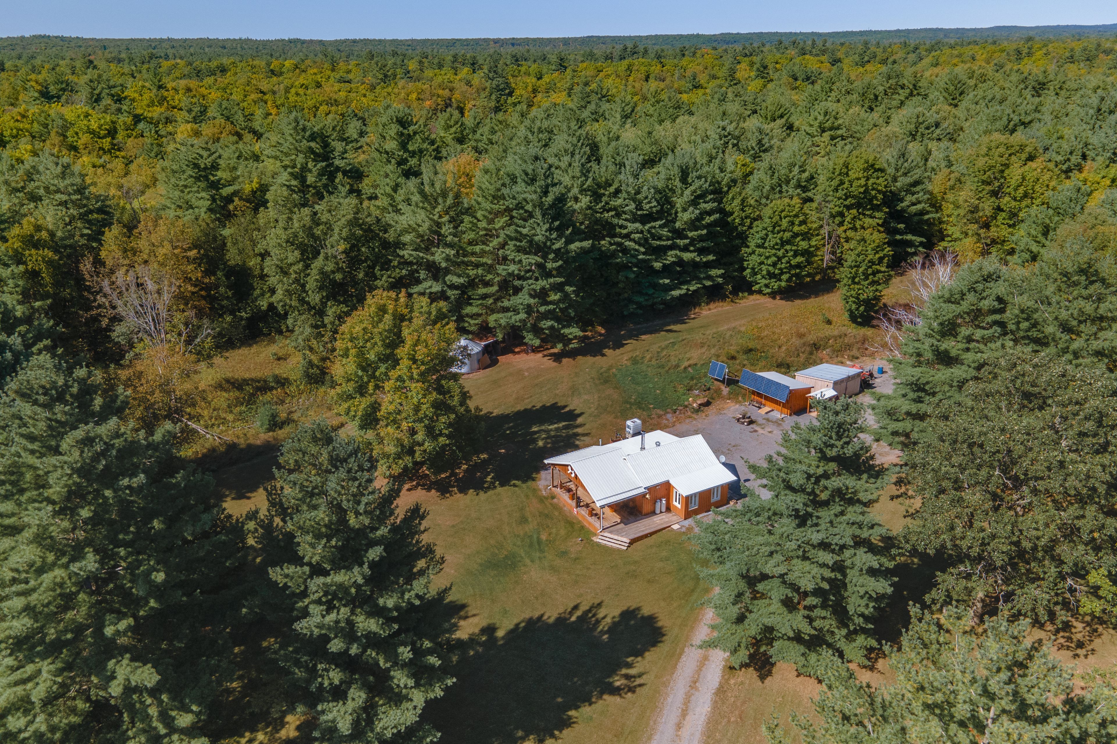 • Private 69-acre lot with three unique cabins for off-grid living.
