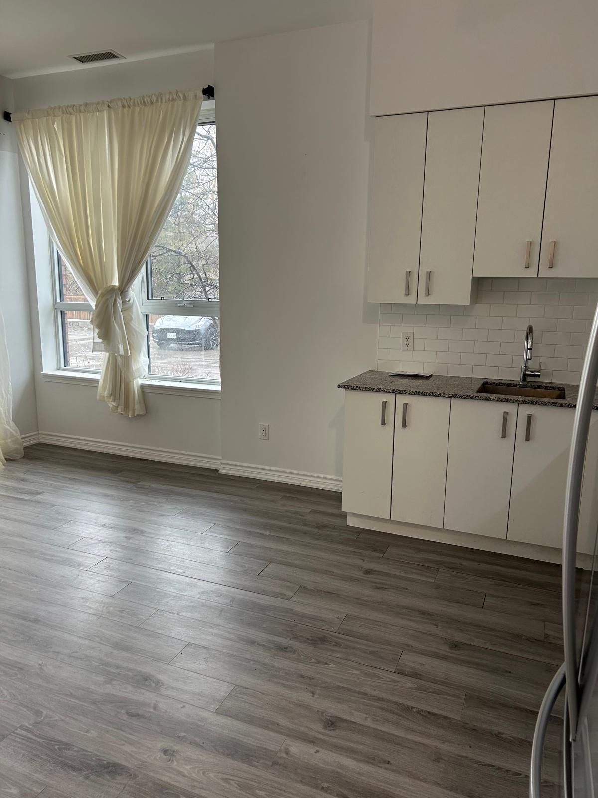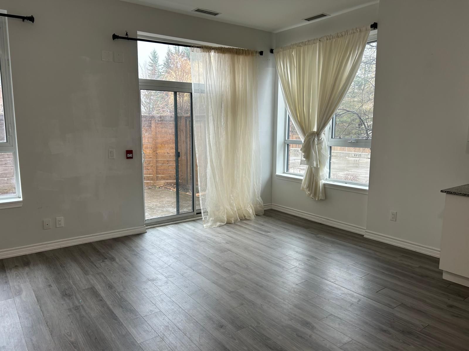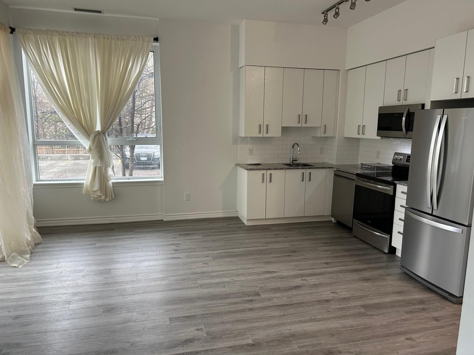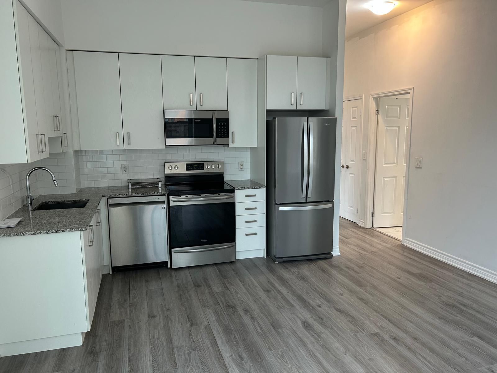 • Open-concept layout with 11-ft ceilings and modern laminate flooring.