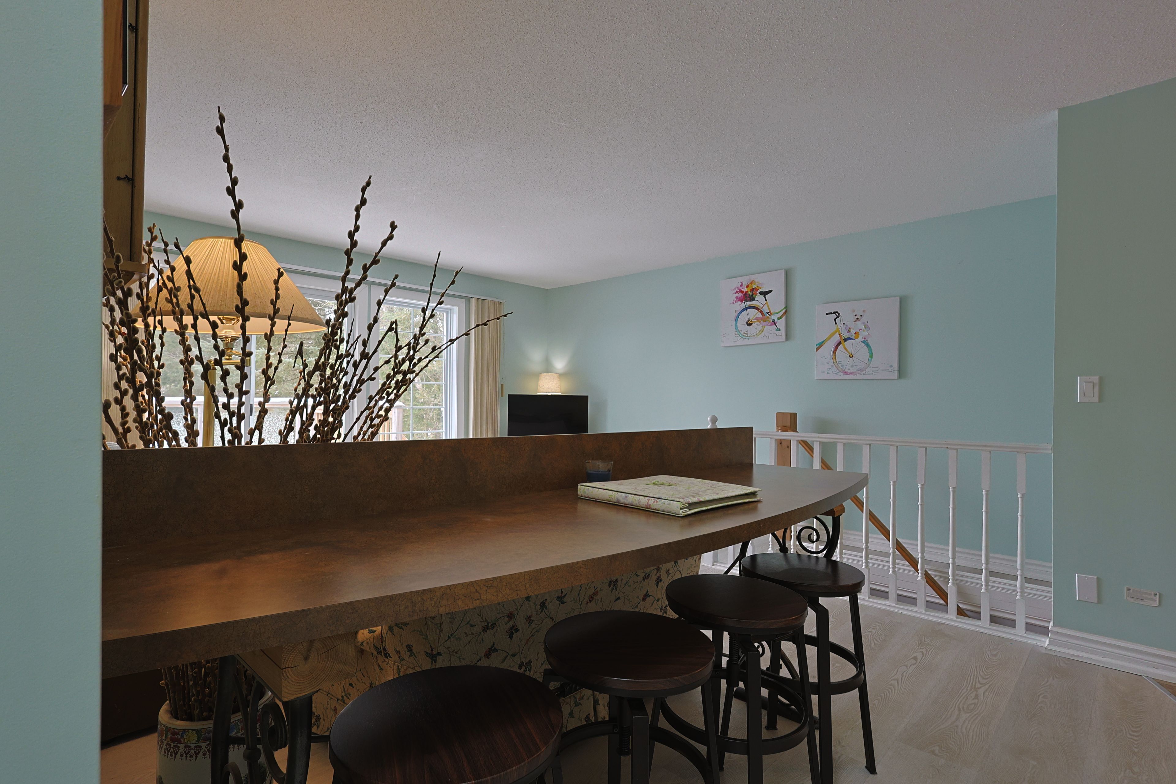 • Bright open kitchen with modern appliances and breakfast nook for casual dining.
