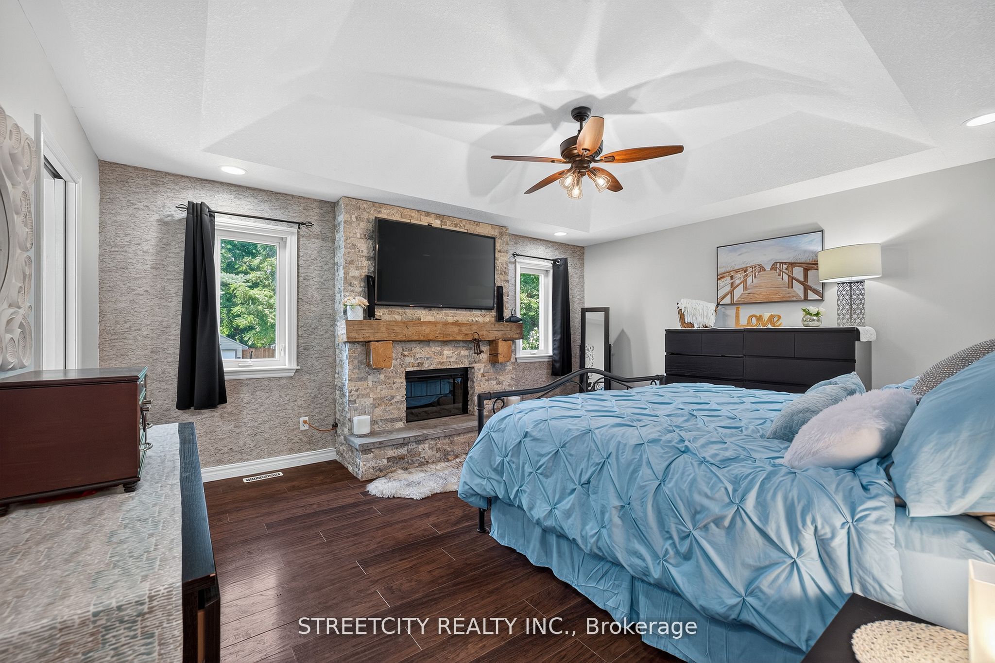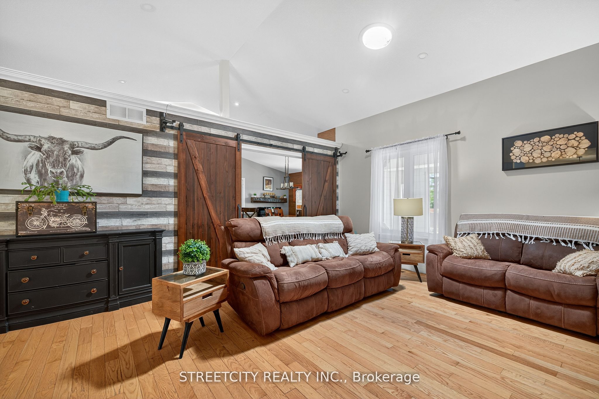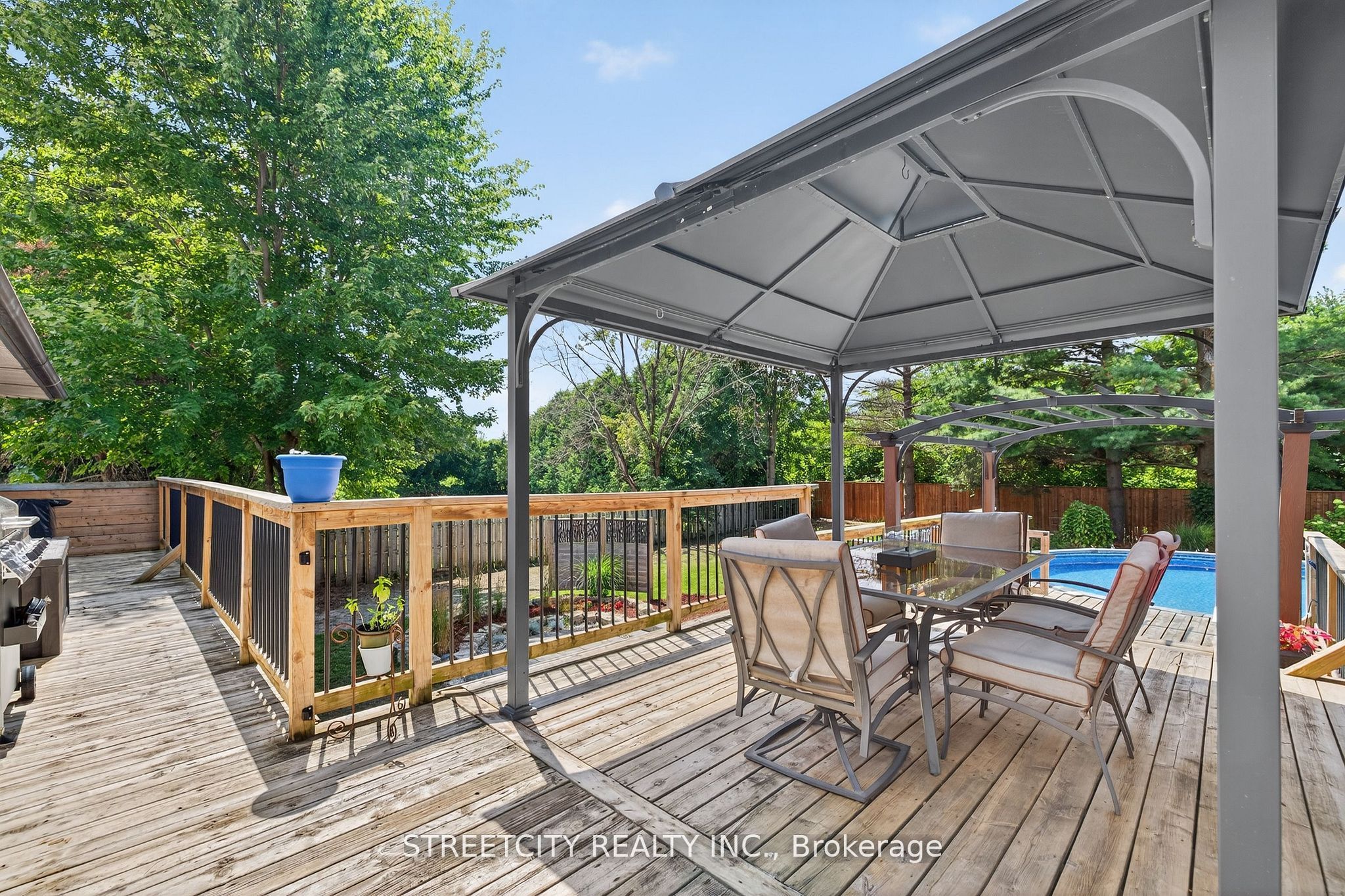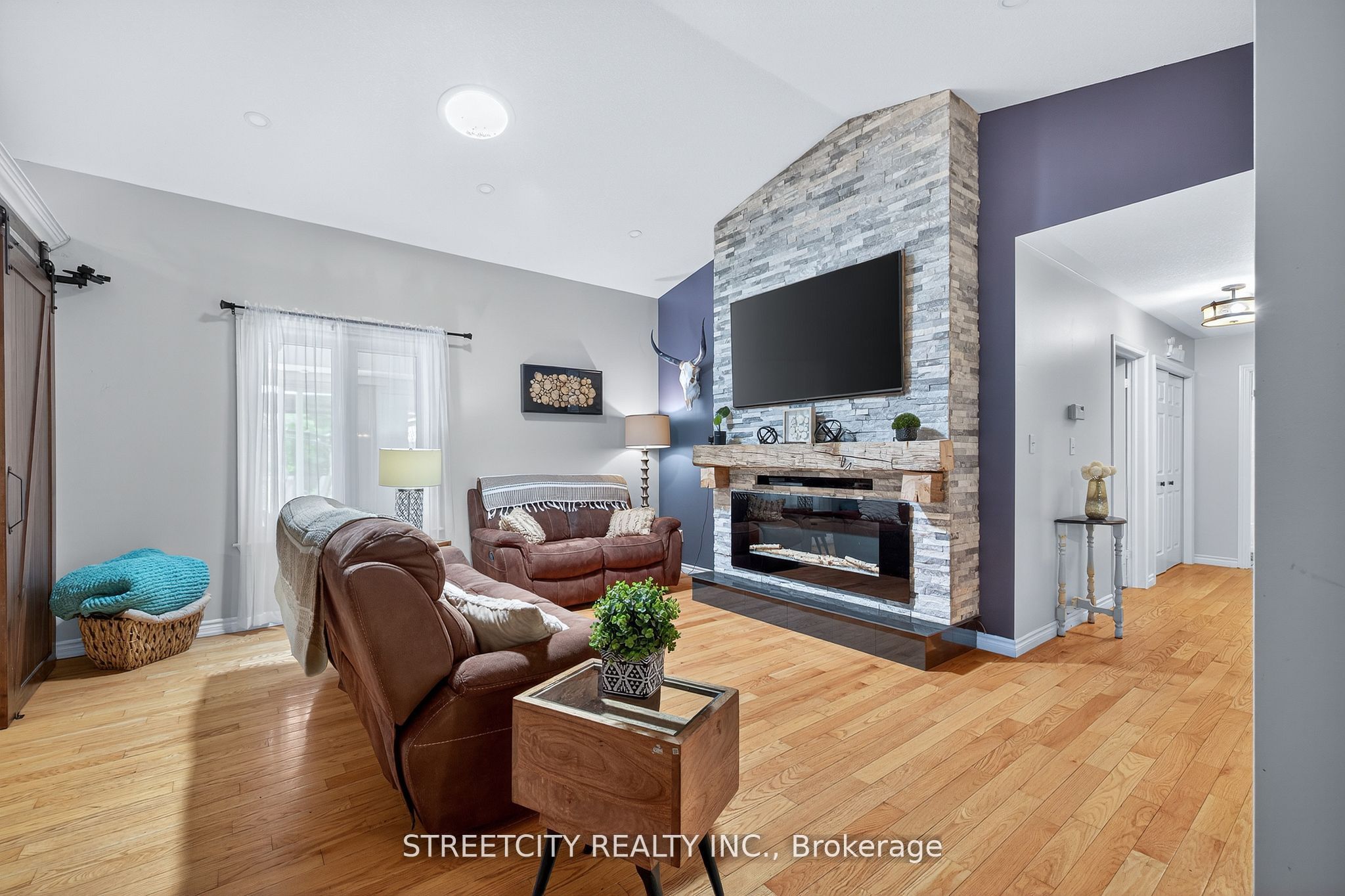 Where urban sophistication meets secluded country prestige. Tucked within a private, tree-lined setting just minutes from highway 401 and the airport, this exceptional estate offers a rare blend of convenience and tranquility-ideal for those who value both privacy and accessibility. A true standout is the extraordinary three-car garage, thoughtfully designed for automotive enthusiasts or skilled craftsmen. Featuring oversized doors, soaring ceilings suitable for a hoist, a mezzanine for added storage, and a private staircase to the fully finished lower level, it's far more than a garage-it's a rare, purpose-built workspace. The outdoor living experience is equally refined, with lush landscaping, multiple decks, a sparkling pool, serene koi pond, and intimate patios that create a private oasis for relaxation and entertaining. Inside, over 3,500 sq. Ft. Of finished living space showcases warm, elegant design. Highlights include custom wood beam fireplace mantels, stylish accent walls, and a barn-style door opening to a chef-inspired kitchen with premium appliances and generous workspace. The primary suite offers a luxurious retreat with a cozy fireplace and spacious layout. Three full bathrooms and a powder room provide both comfort and function. The fully finished lower level features a versatile in-law suite with in-floor heating, accessible from the main level, garage, or a private entrance-ideal for multi-generational living or income potential. This is a rare offering-where refined living, exceptional functionality, and peaceful surroundings come together seamlessly.