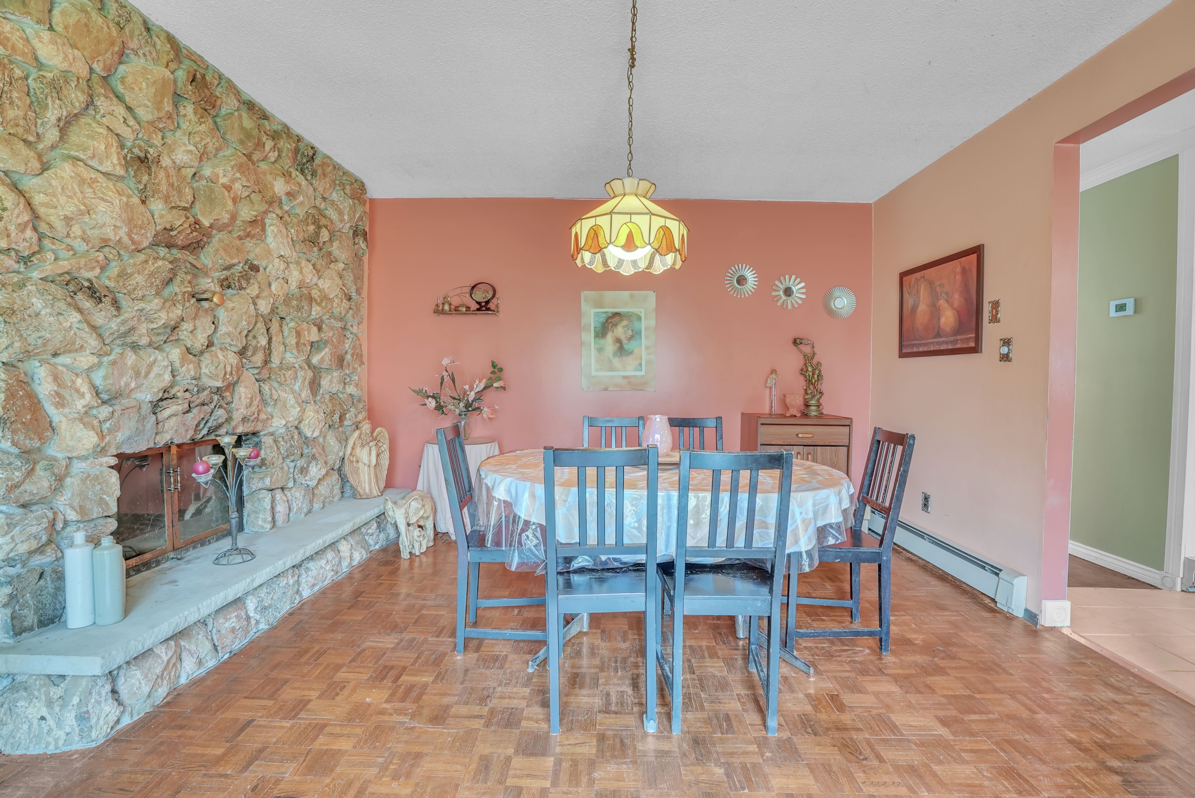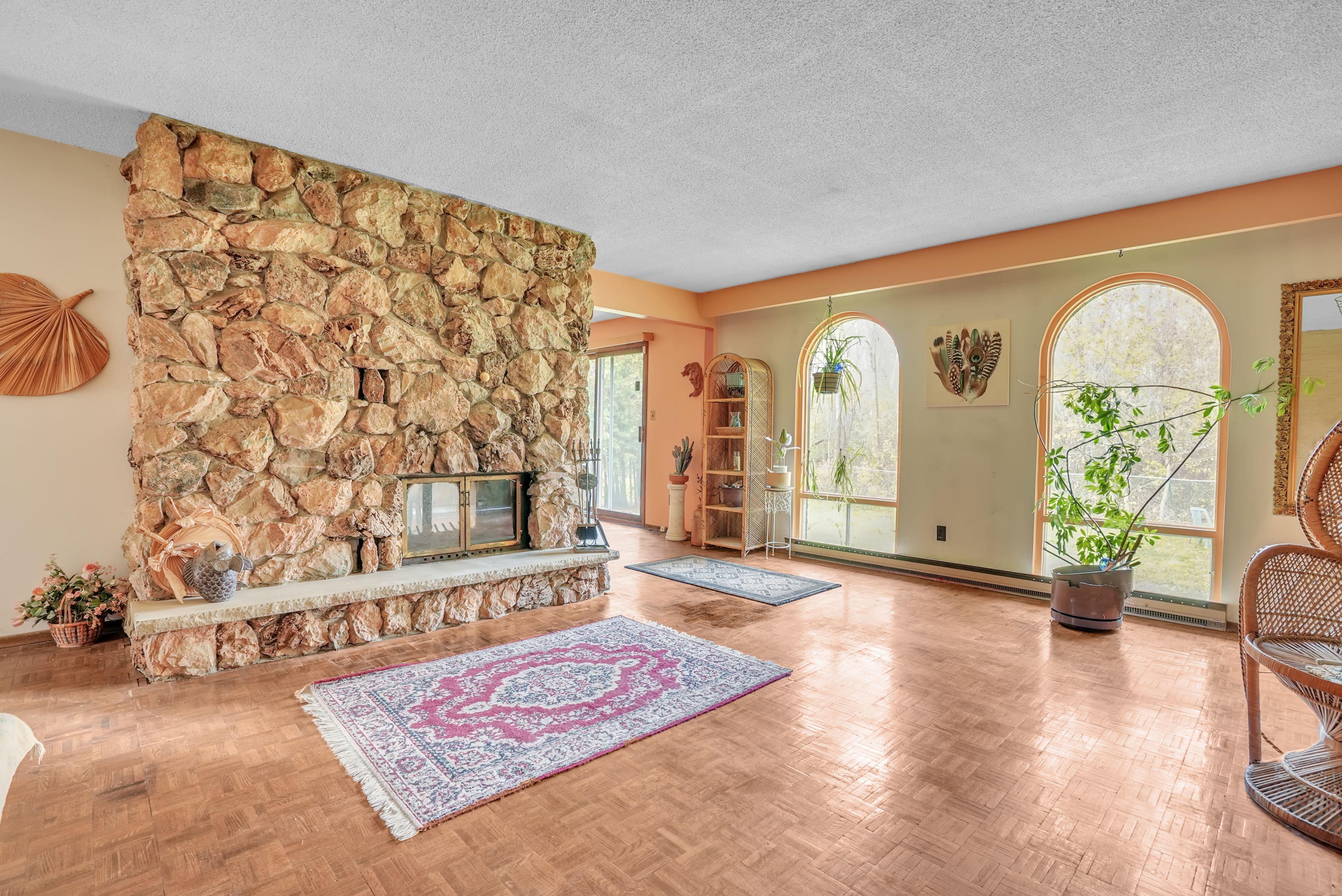 • Natural stone two-sided fireplace and cathedral windows create a welcoming atmosphere.