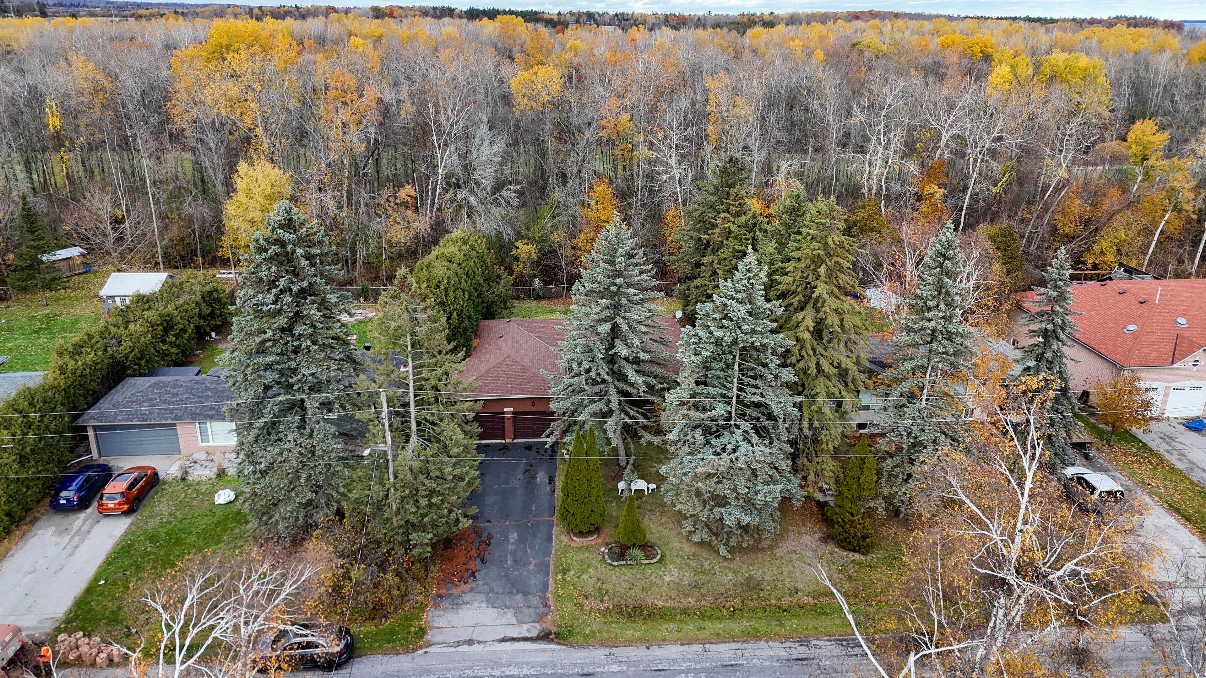 Welcome to a rare opportunity to enjoy the relaxed lifestyle of gilford's coveted lakeside community. This sprawling all-brick bungalow backs directly onto harbourview golf & country club and is just steps from the beach, offering the perfect balance of nature, recreation and small-town charm. Set on a beautifully treed 75x150 ft lot, this solid home offers 3+1 bedrooms, 3 bathrooms, and a finished basement, providing generous space for family living or weekend escapes. Inside, the living and dining areas are highlighted by soaring cathedral windows and a striking natural stone two-sided fireplace, creating a warm and inviting focal point for both entertaining and relaxing evenings at home. The main-floor primary suite offers comfort and privacy with its own ensuite bath. The finished lower level expands the living space with an additional bedroom, bathroom, large recreation/family room, and plenty of storage. Outdoors, enjoy peaceful mornings and summer gatherings surrounded by mature trees and nature. A large private driveway with no sidewalk provides ample parking. Ideally located just minutes to cooks bay, two marinas, golfing, the tanger outlet mall, and hwy 400, with toronto only 40 minutes away, this location combines lakeside tranquility with everyday convenience. Recent updates include electrical panel, roof shingles, front entry door, oversized garage doors, select basement windows, and a new garden shed. This well-built home offers tremendous potential and is ready for its next chapter. Bring your vision and personal updates - the property is being sold in as-is condition. A wonderful opportunity to create your dream home in one of lake simcoe's most desirable communities.
