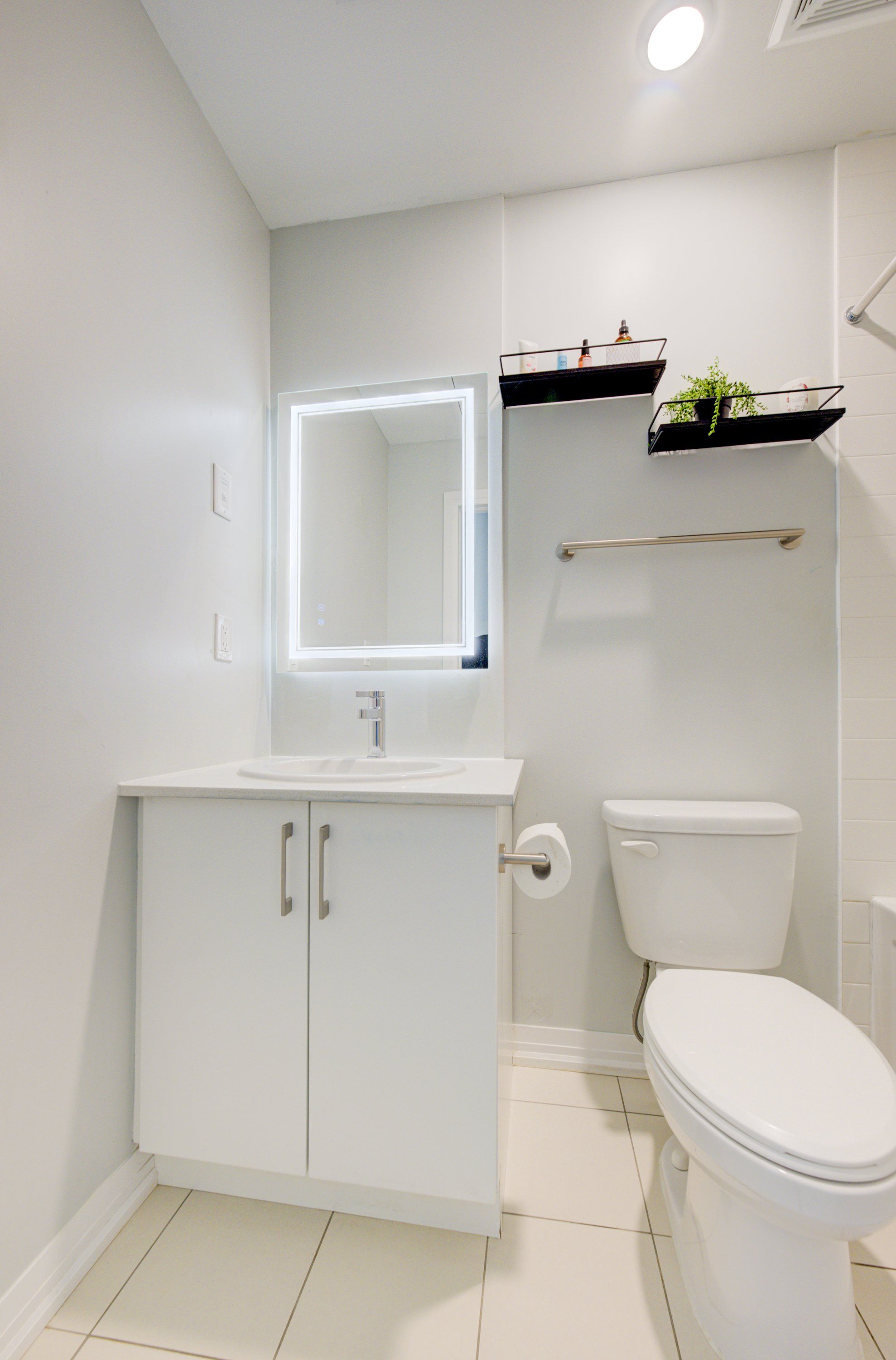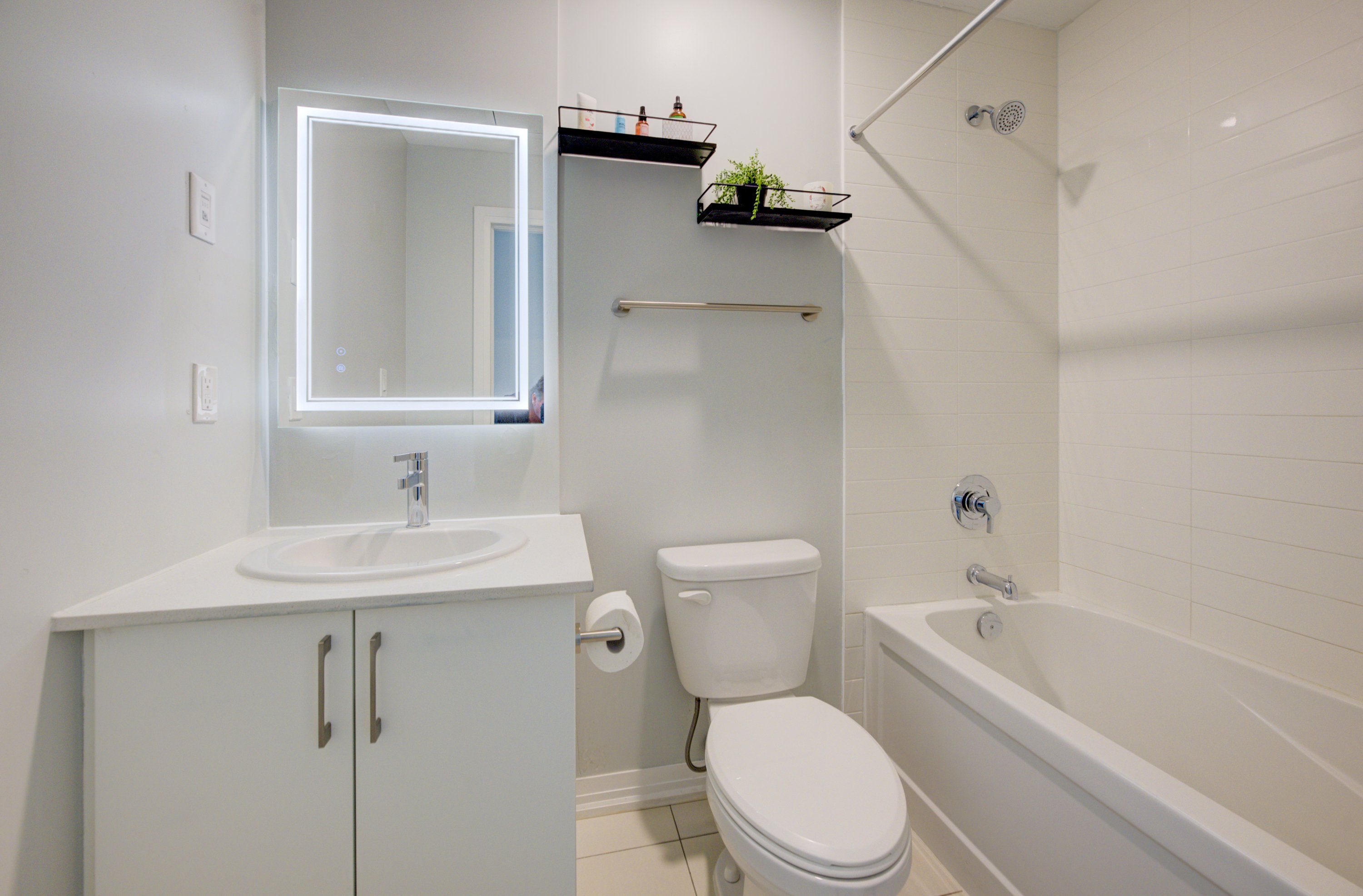 • Modern bathroom features stylish fixtures and LED mirror.