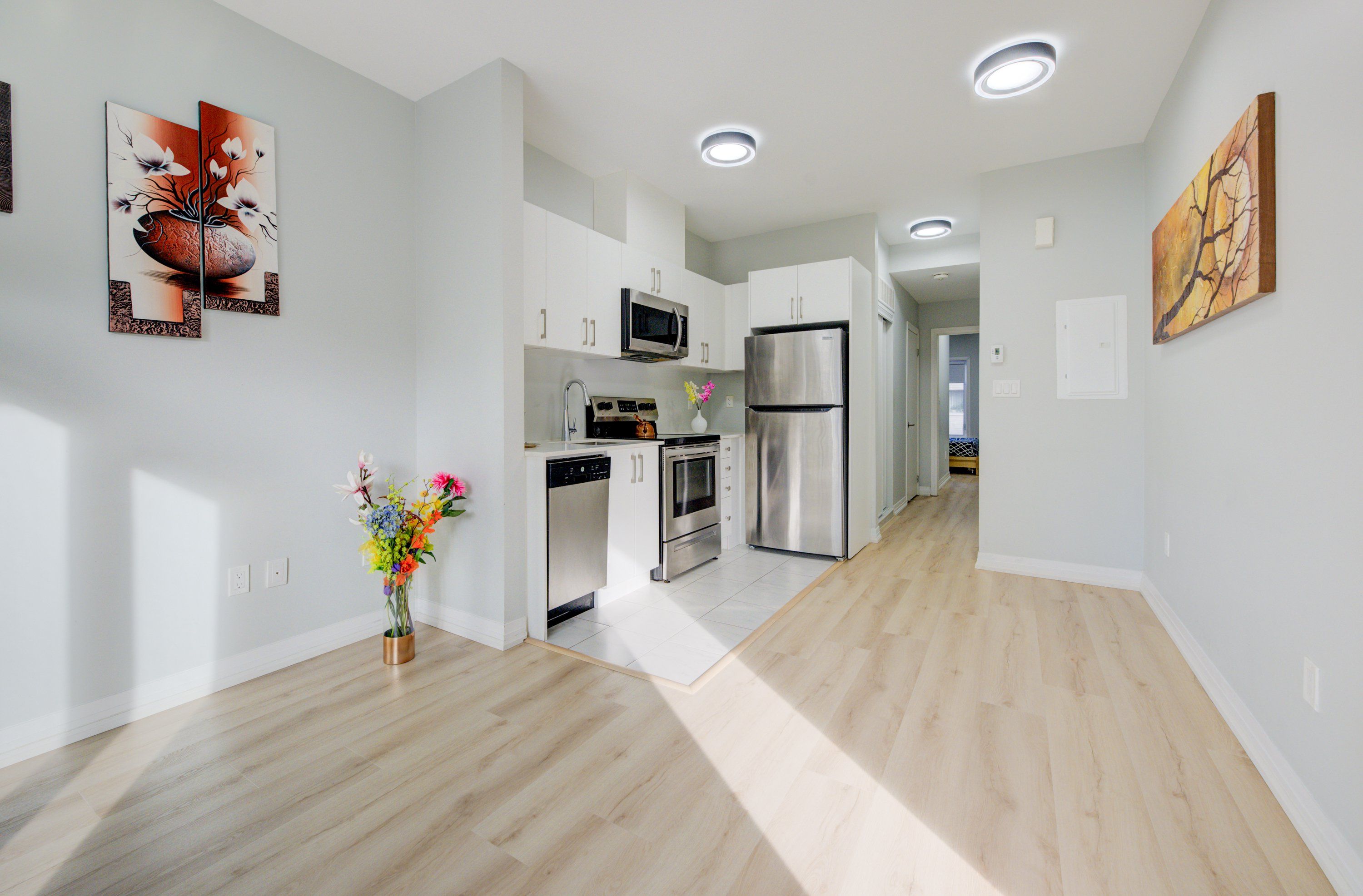 • Open-concept living area with 9-foot ceilings for an airy feel.