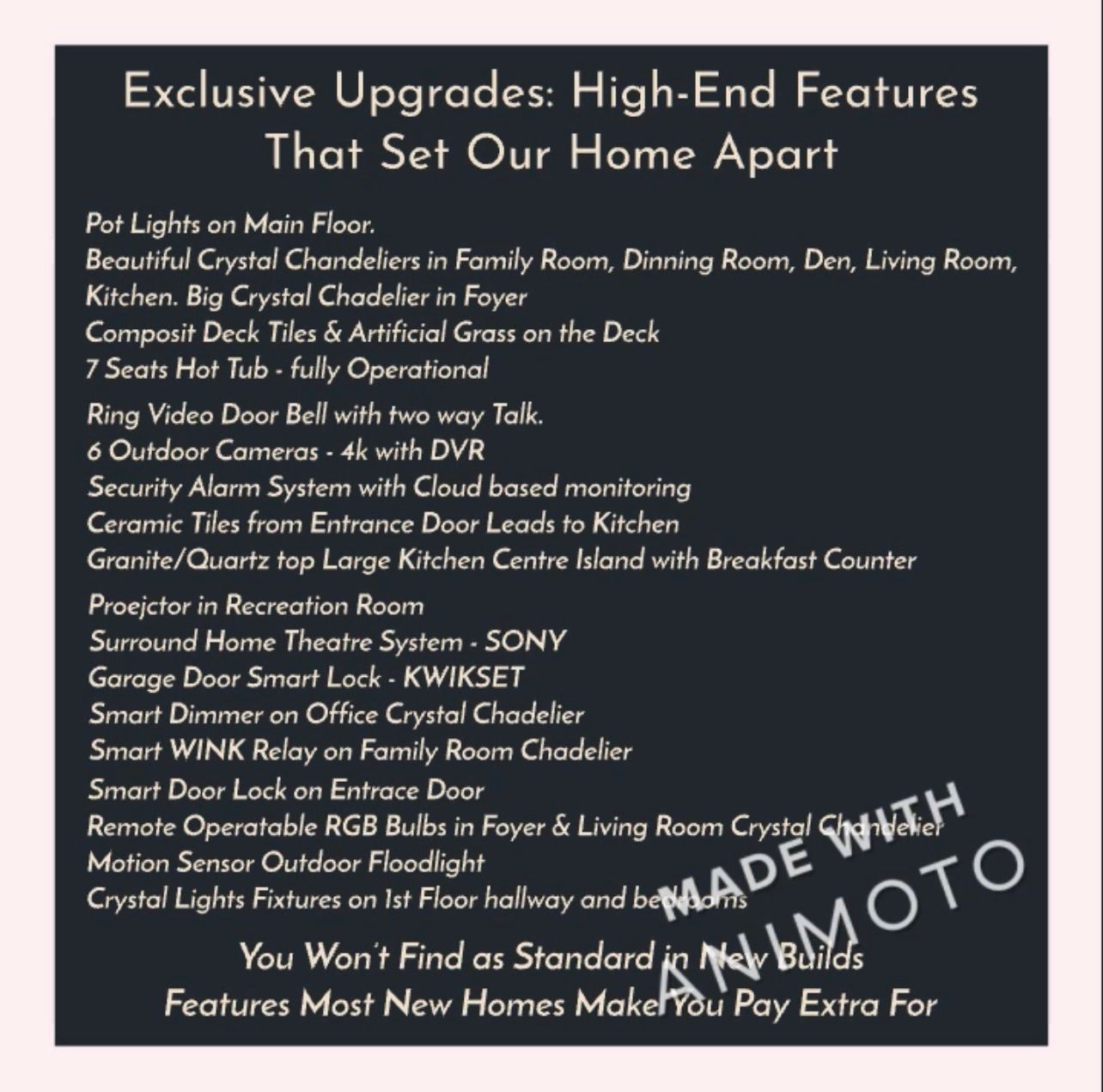 This stunning 4+1 bedroom, 3. 5 bathroom home in the prestigious morgan's grant kanata neighborhood offers 2700 sqft of luxury living space, combining modern comforts and smart home technology, ideal for both family living and entertaining. Key features:grand entrance: high-ceiling foyer with chandelier sets an elegant tone. Spacious living areas: family room with pot lights and chandelier; formal dining room with large windows, recessed lighting, and chandelier. Flexible spaces: main floor den/office, or an additional bedroom if needed. Open concept living and kitchen: modern kitchen with white cabinetry, crystal door knobs, stainless steel appliances, and a large granite island. Pot lights and chandelier create a stylish ambiance. Master suite: large master bedroom with luxurious ensuite featuring a jacuzzi tub. Additional bedrooms: three good-sized upstairs bedrooms, each with ample natural light, plus a well-appointed shared bathroom. Fully finished basement: large recreation room with led pot lights, 1 bedroom, full bathroom, and storage area, perfect for guests or an in-law suite. Outdoor living: deck, covered hot tub area, and storage shed for relaxation and entertaining. Additional features:smart home technology: app-controlled lighting, thermostat, door lock, and ring doorbell. Cctv system with 6 outdoor 4k cameras. Entertainment ready: basement with built-in projector, sony home theater system, subwoofer, and speakers. Exterior enhancements: motion-sensor lighting, led pot lights around the house, and a digital address sign. High-efficiency upgrades: new furnace (2021) and owned tankless water heater. Impressive interior: crystal light fixtures, hardwood floors, and window blinds. Bright and airy: large windows fill the home with natural light. Location: convenient access to kanatas business district, parks, golf courses, top-rated schools, and only a 25-minute drive to downtown ottawa. Closing date: flexible.