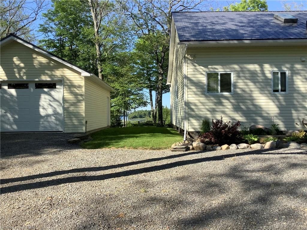 Tucked along the southern shores of big gull lake, 1165b kirk kove road offers the kind of privacy and space that's hard to find with just under 9 acres of wooded land and a remarkable (approx) 1,500 feet of waterfront. Approx 10 years old, this fully winterized 1. 5-storey cottage/home blends seasonal charm with ability for year-round comfort. Inside, you'll find approximately 1,700 square feet of living space, including four bedrooms and a main-level bathroom, all finished with durable laminate flooring and warmed by a striking 20-foot-high wood-burning fireplace, an ideal spot to gather after a day on the lake. The open-concept main floor is functional and inviting, featuring a bright kitchen, dining area, and a spacious family room. A screened-in porch offers a relaxing place to take in the views without the bugs, while the second-floor loft adds flexible space for guests or a cozy reading nook. Water access is straightforward with both road and boat accessibility, and the private dock extends into a weedy shoreline with a direct connection to big gull lake via a creek great for paddlers and boaters alike. The drilled well provides clean, deep water, and there's a detached two-car garage plus a shed for extra storage. Located off a shared gated road used by just three other cottagers, the property strikes a nice balance between seclusion and community. Whether you're planning to spend weekends or all four seasons here, this cottage offers a rare combination of space, access, and waterfront tranquility in the heart of frontenac county just north of hwy 7/arden and east of 41 and harlowe.