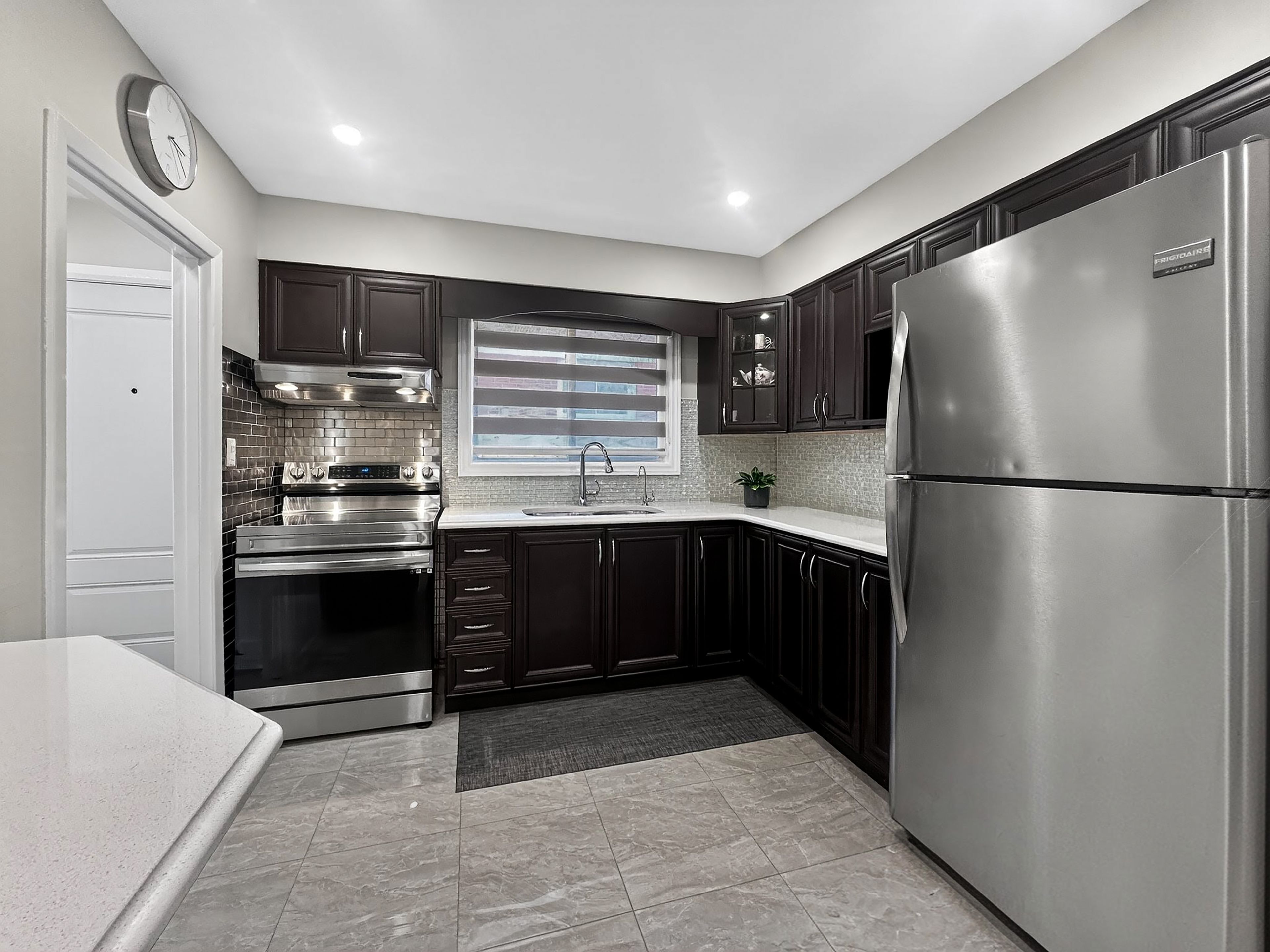 • Contemporary kitchen with stainless steel appliances and ample cabinetry.