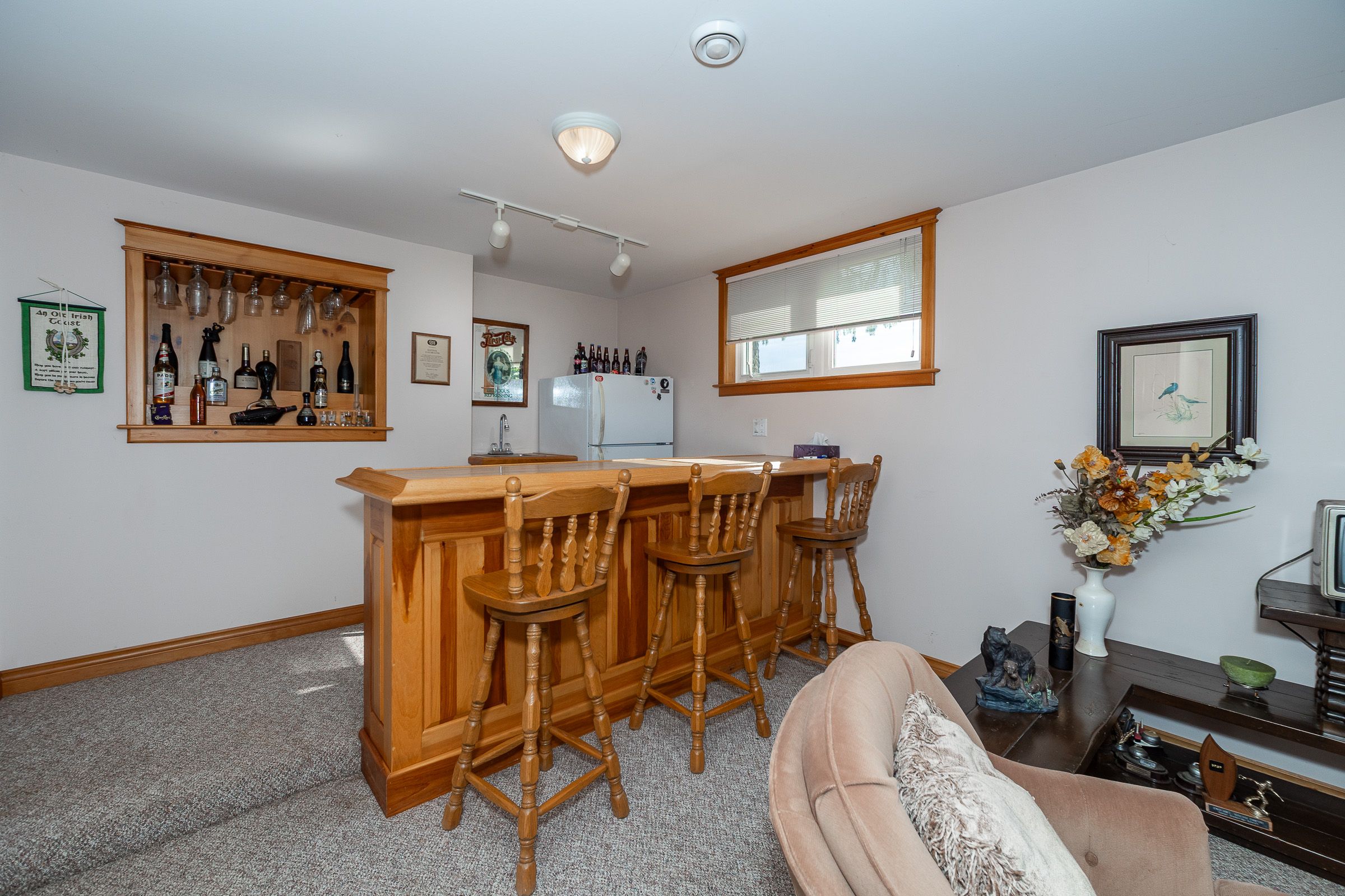 • Basement rec room with built-in bar and pool table for entertainment.