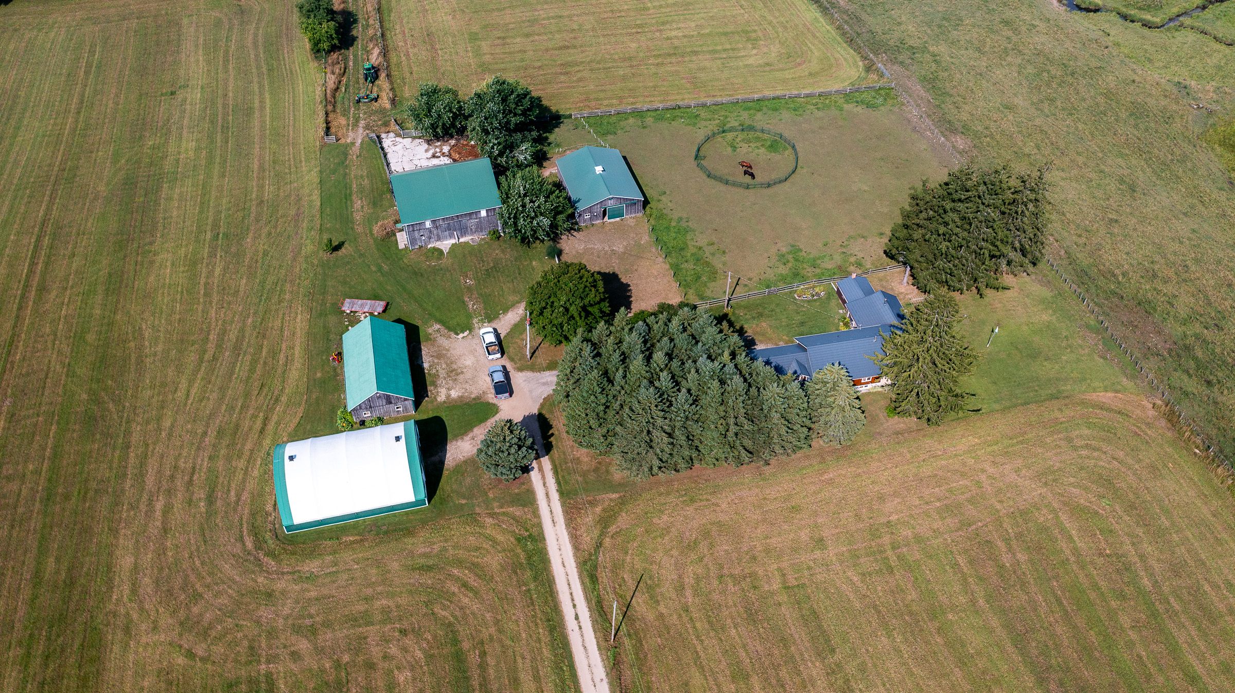 Set a ways back from the paved road, this farm has it all! 121 acres of pasture, workable farmland, mixed bush, a meandering creek, and well-equipped buildings for a variety of farming endeavours. Surrounded by mature trees with views of the horse paddocks from the veranda, the home blends the charm of the original farmhouse: pine floors, solid wood cabinets, and a cozy woodstove with the added space of a bright, modern addition. The farmhouse includes a welcoming kitchen, family room, office or optional bedroom, and a three-piece bath, while the addition features a large, light-filled living room with deck access, a primary bedroom, four-piece bath, laundry room, and attached double garage. Upstairs offers a loft sitting area and second bedroom, and the basement boasts a spacious rec room with built-in bar and pool table. Outbuildings include a 36' x 48' horse stable with four 12' x 12' box stalls, heated tack room with plumbing, a 43' x 50' bank cattle barn with concrete barnyard and separate well, a 26'6" x 46'6" driveshed, and a 40' x 56'6" coverall building.