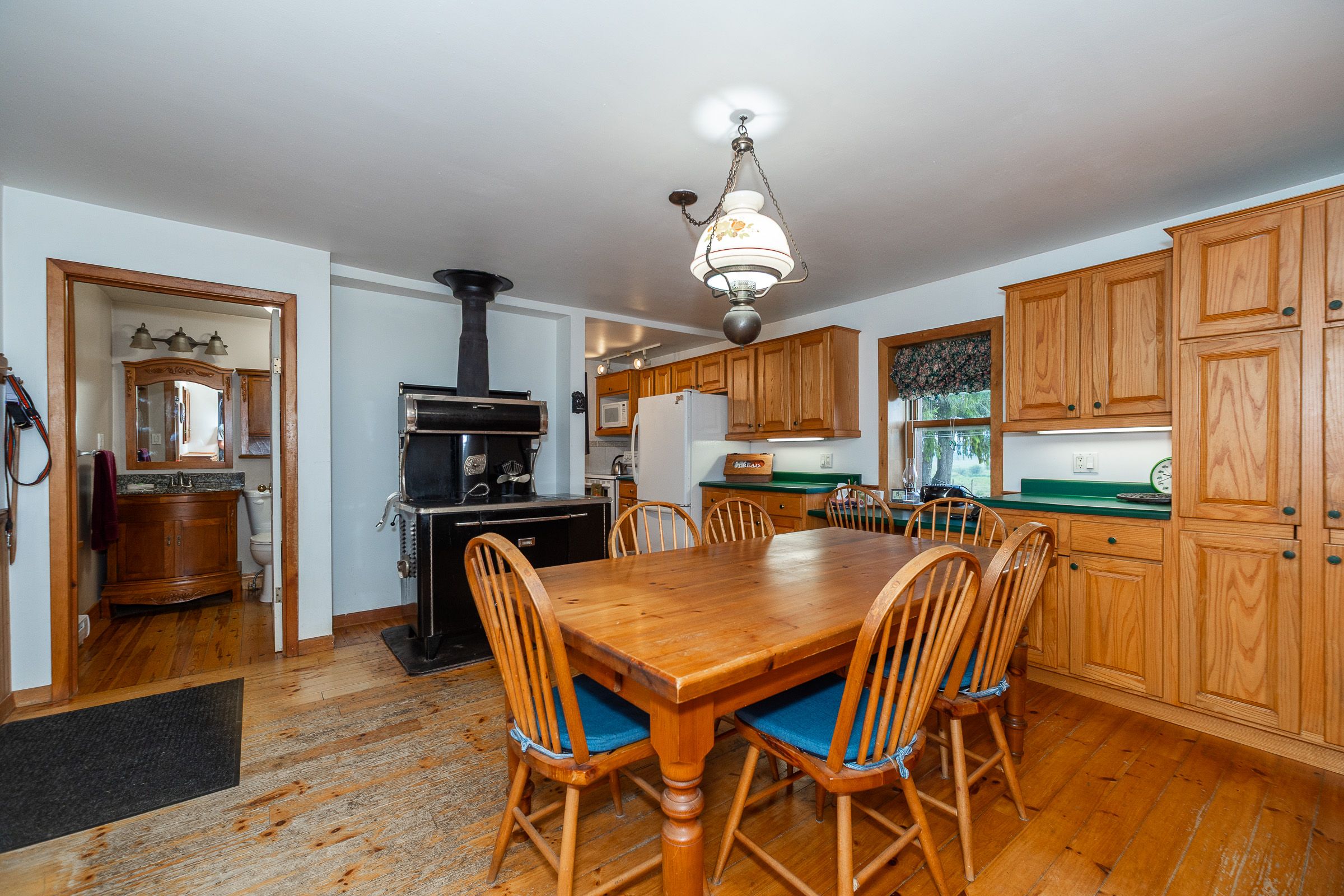 • Charming farmhouse features original details like pine floors and woodstove.