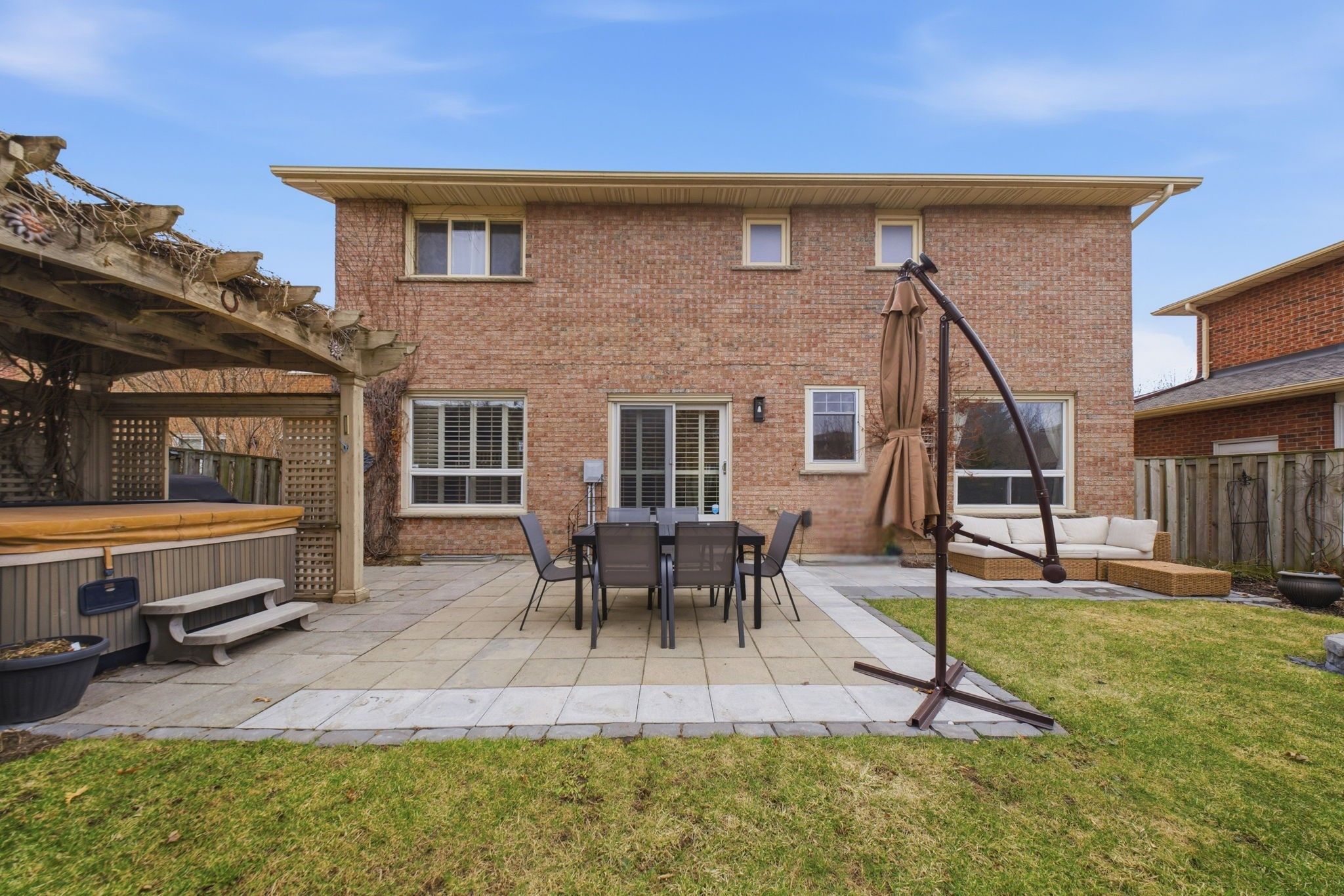 • Backyard oasis features a new stone patio, hot tub, and fire pit.
