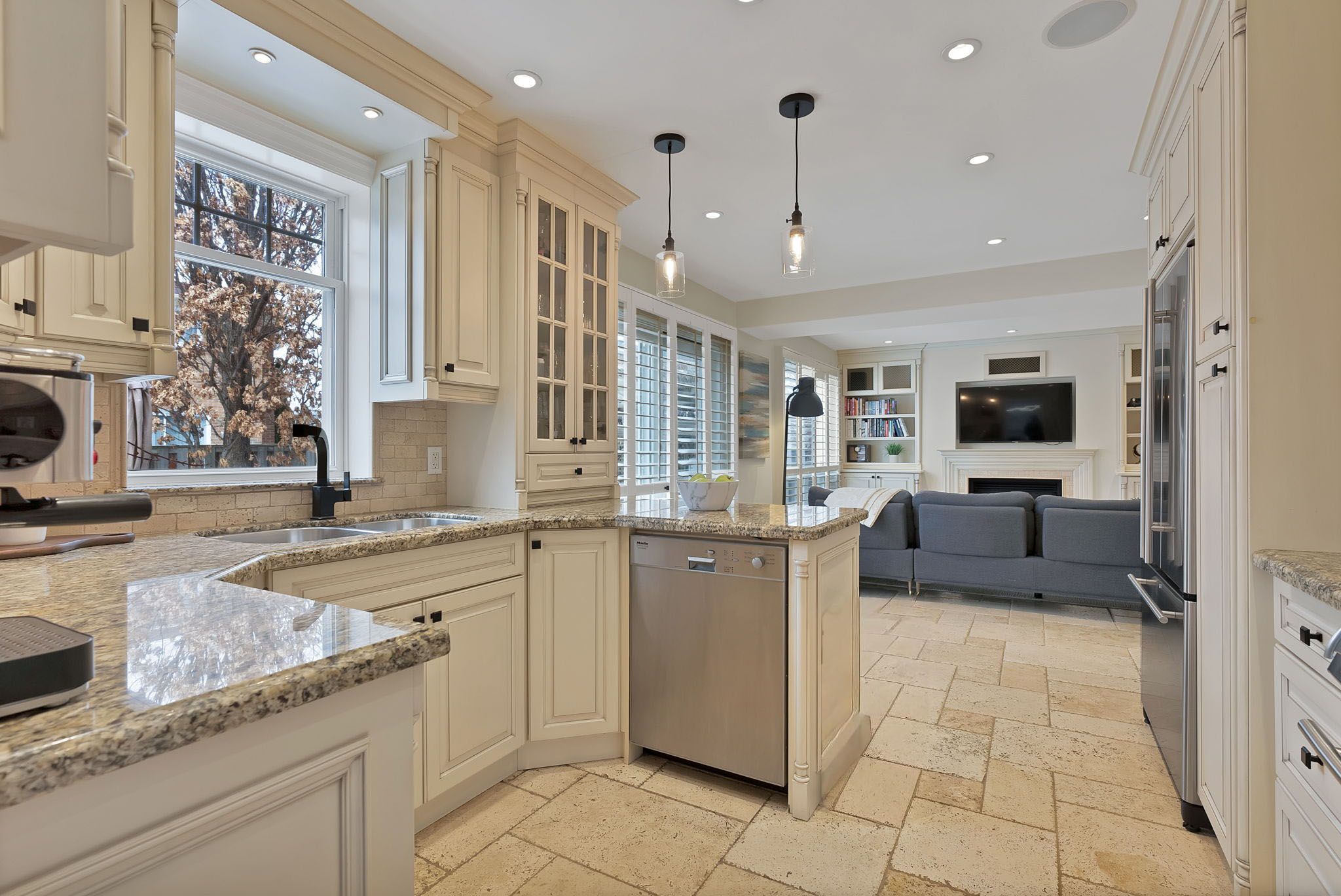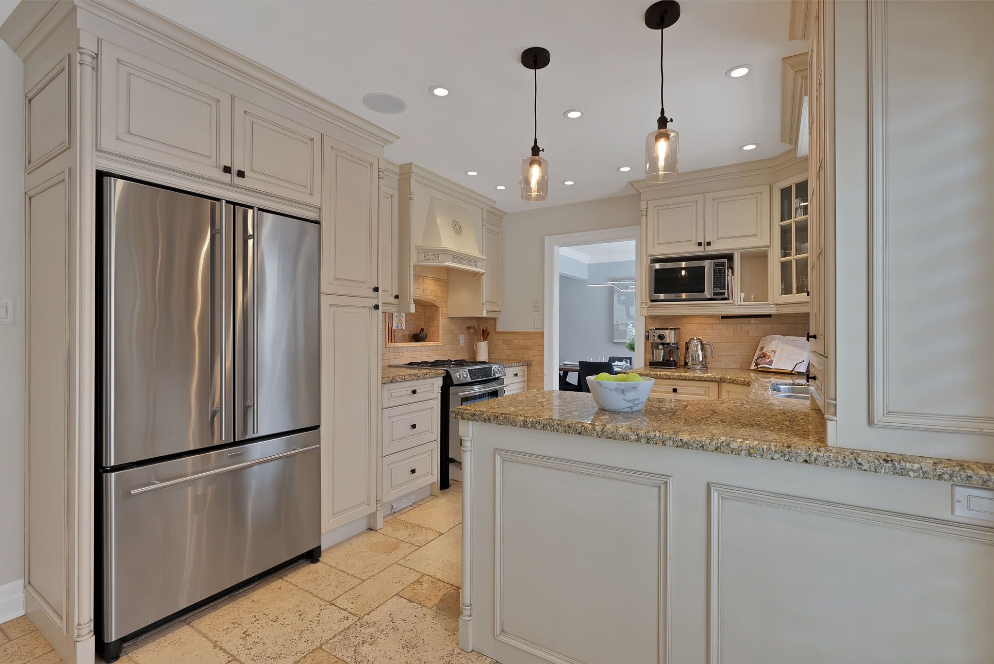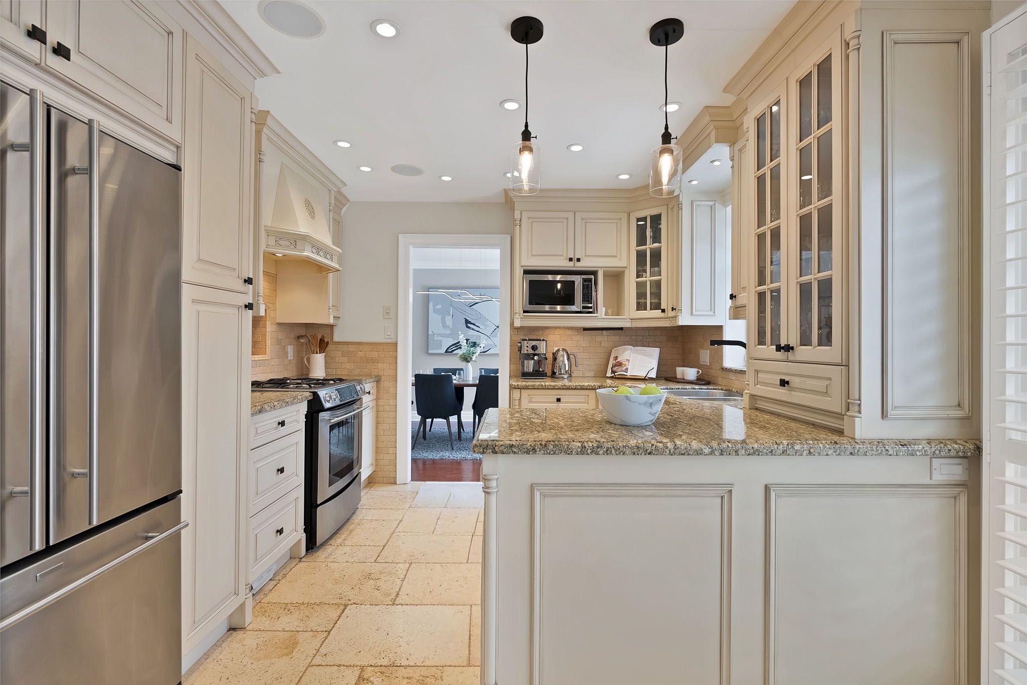• Modern kitchen with high-end appliances and elegant stone countertops.