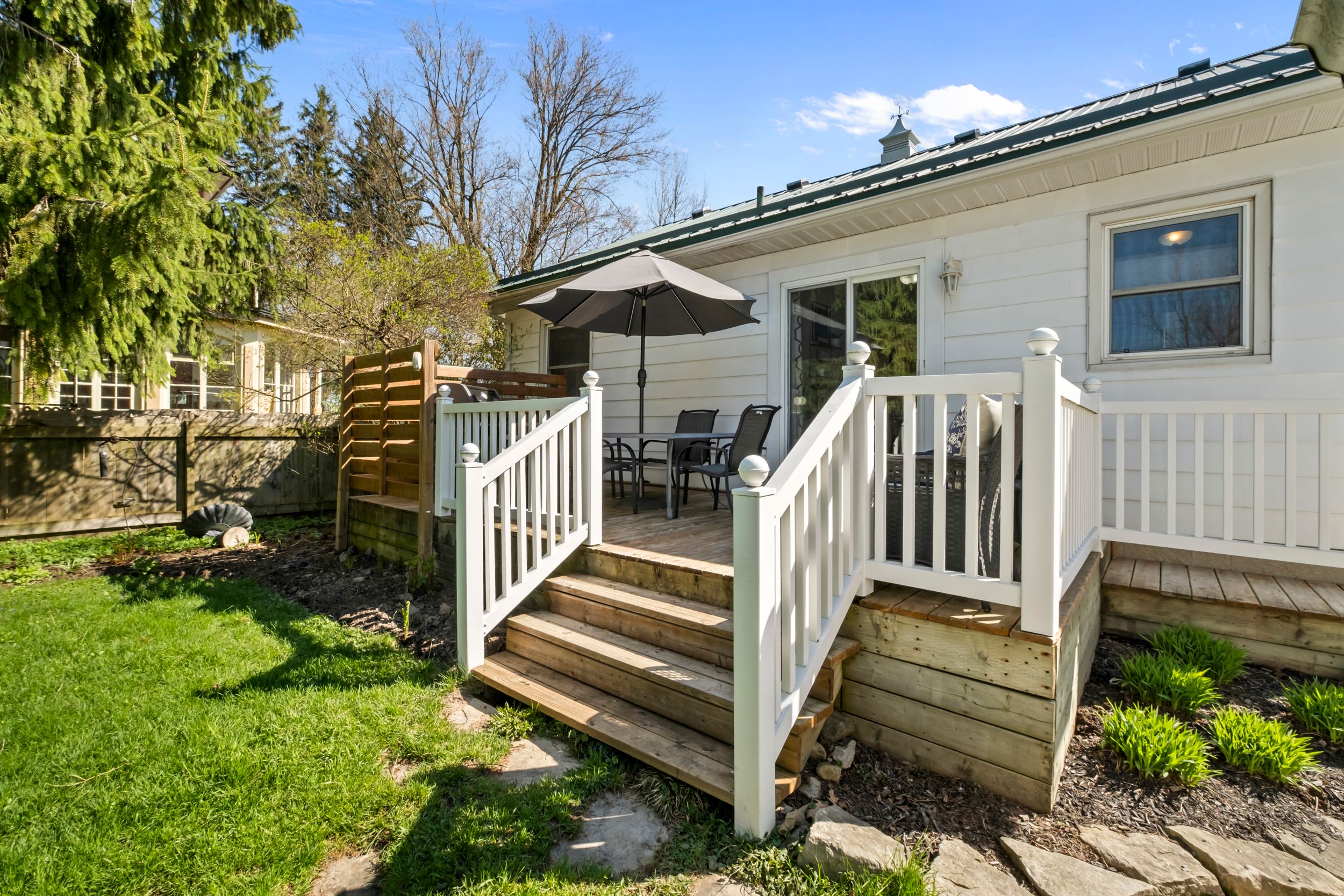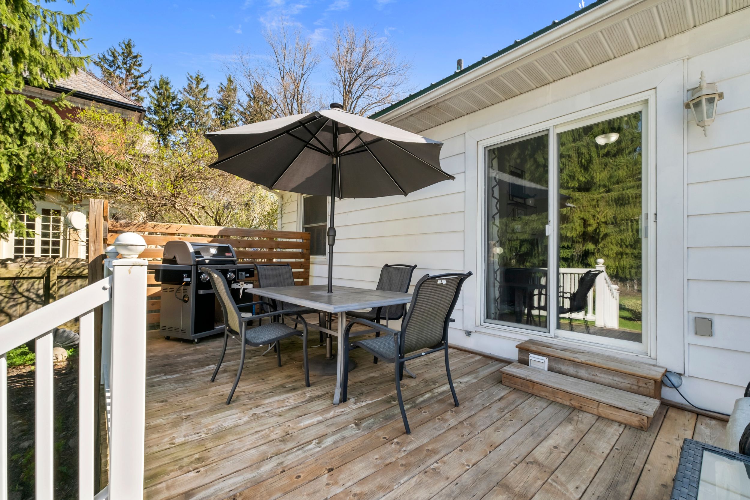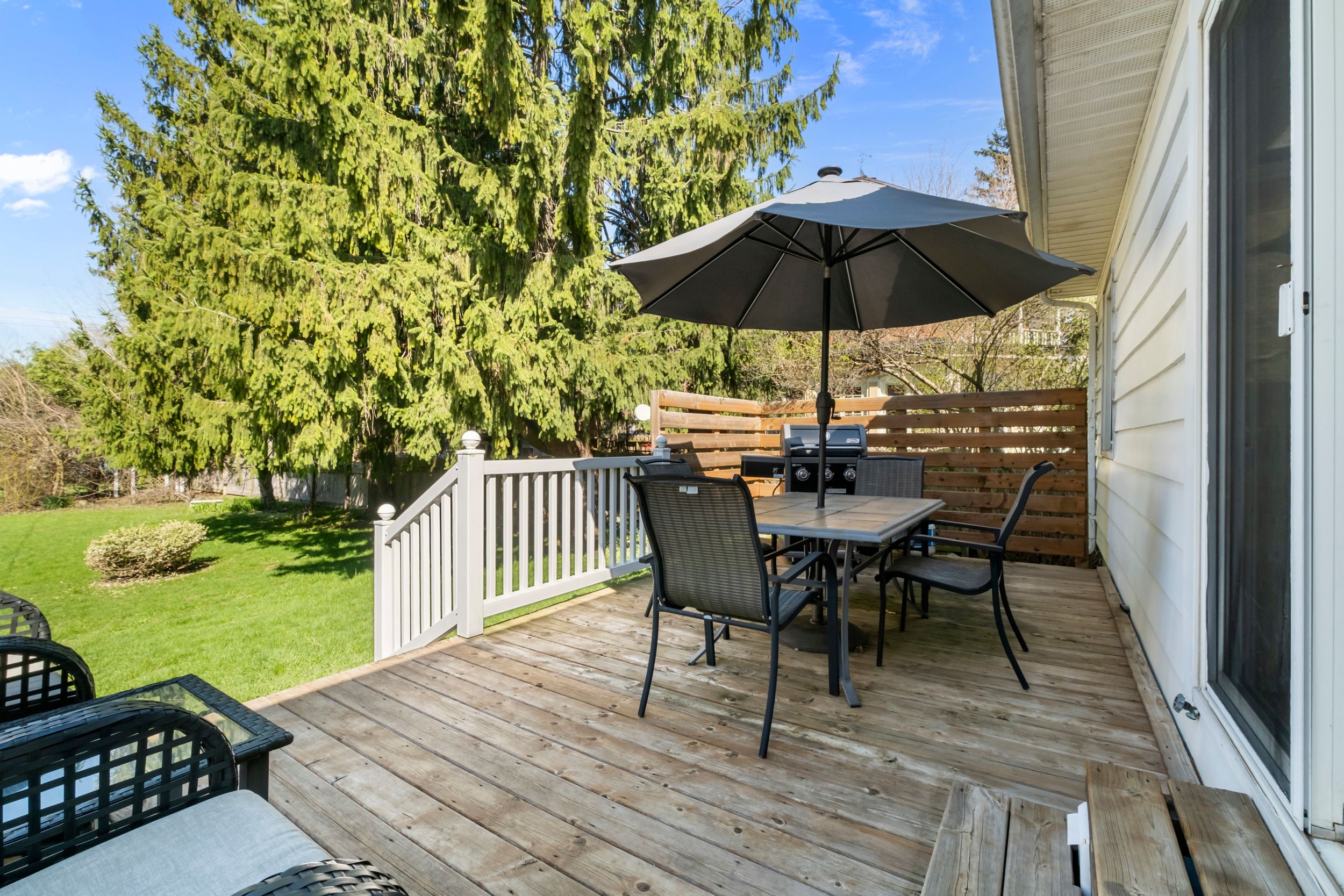• Large deck overlooking a private yard with mature trees.