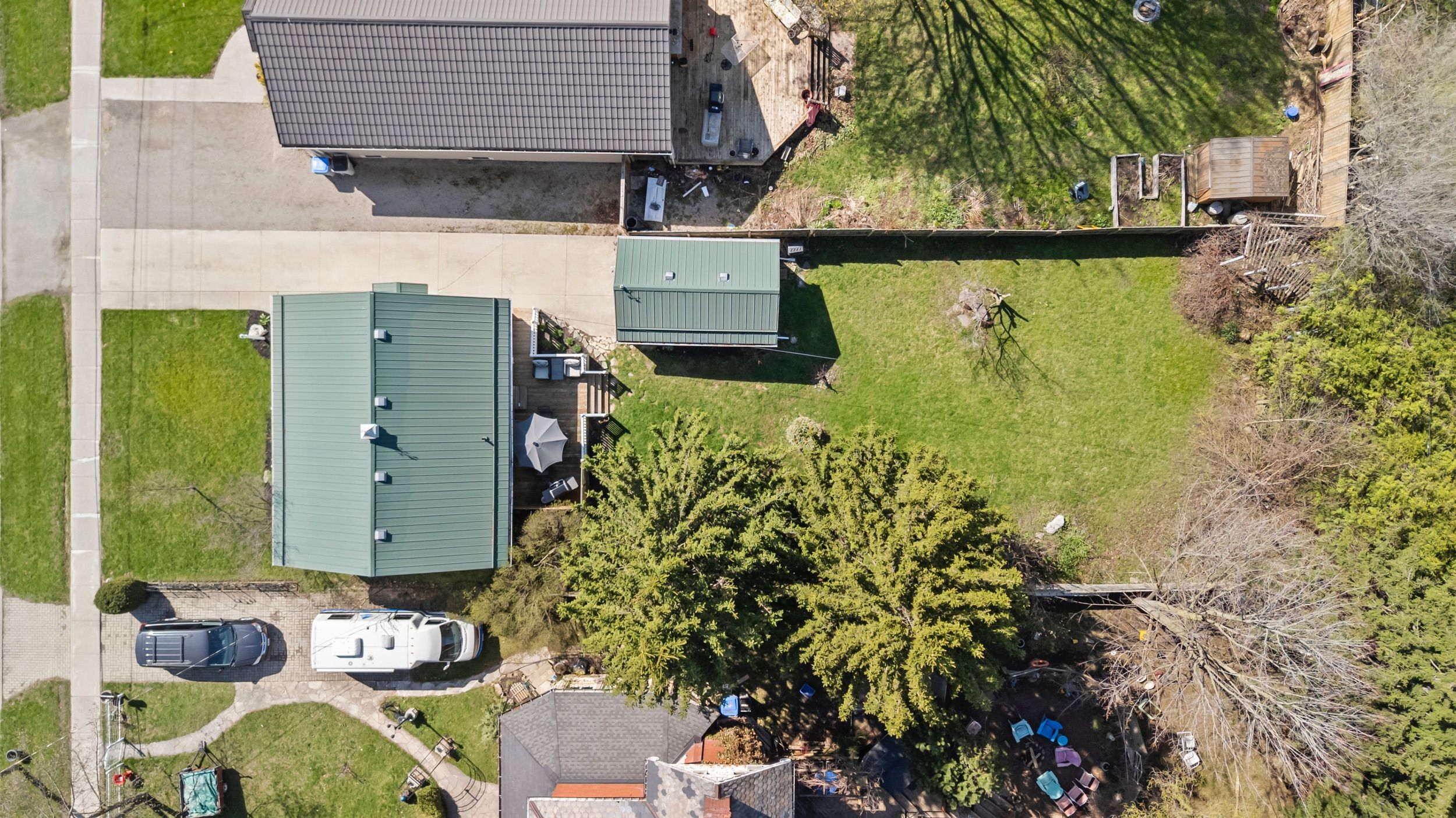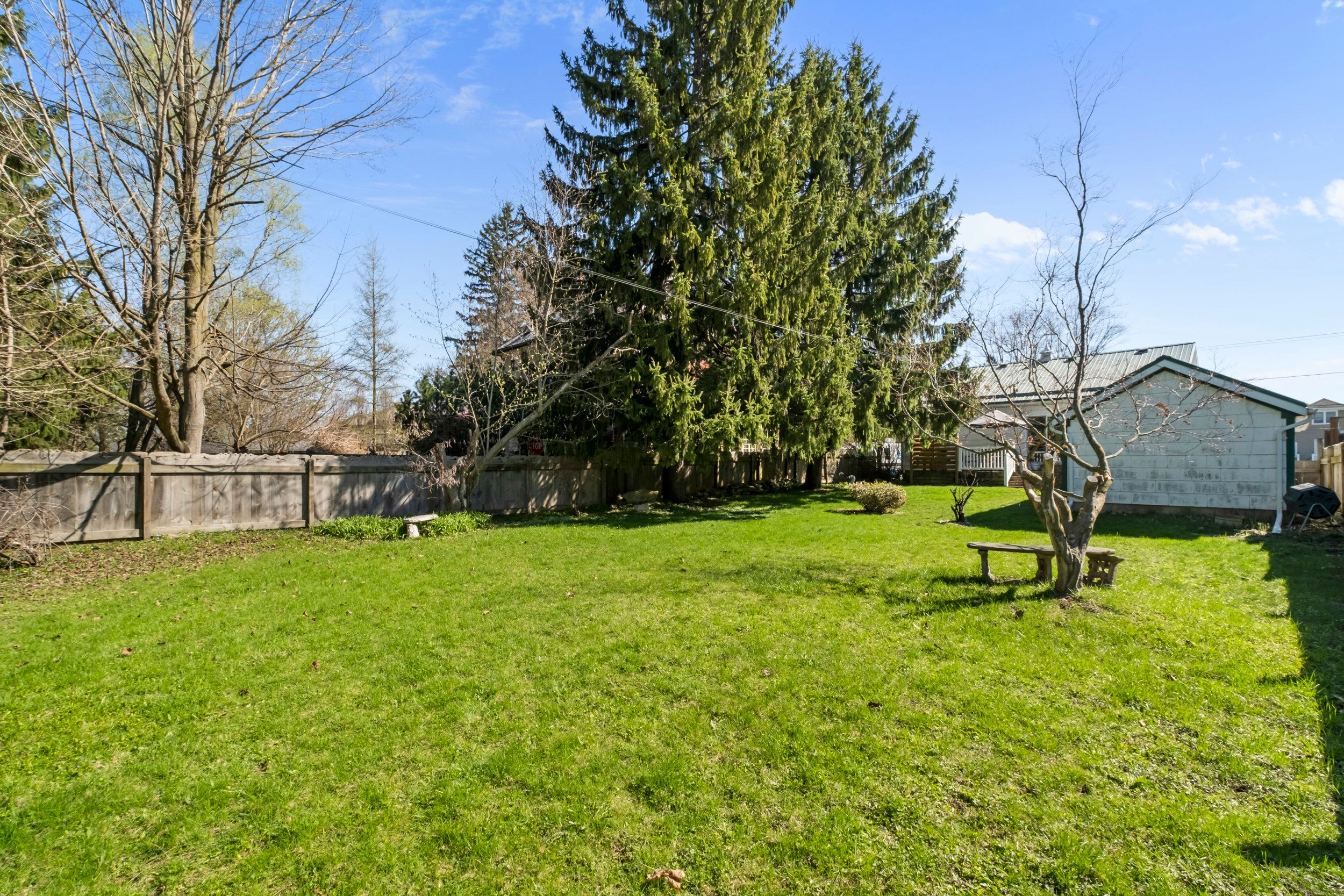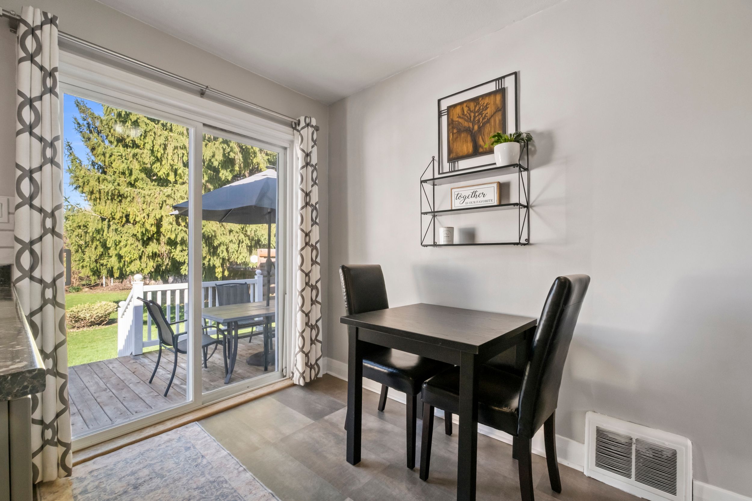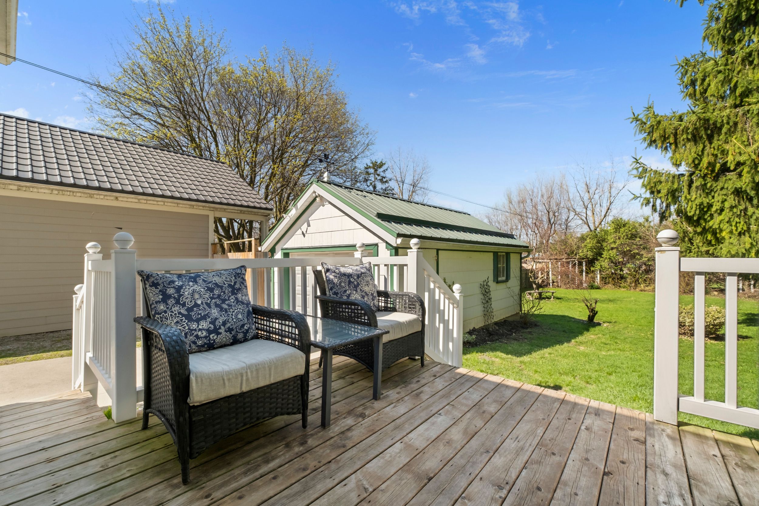 • Large deck overlooking a private yard with mature trees.
