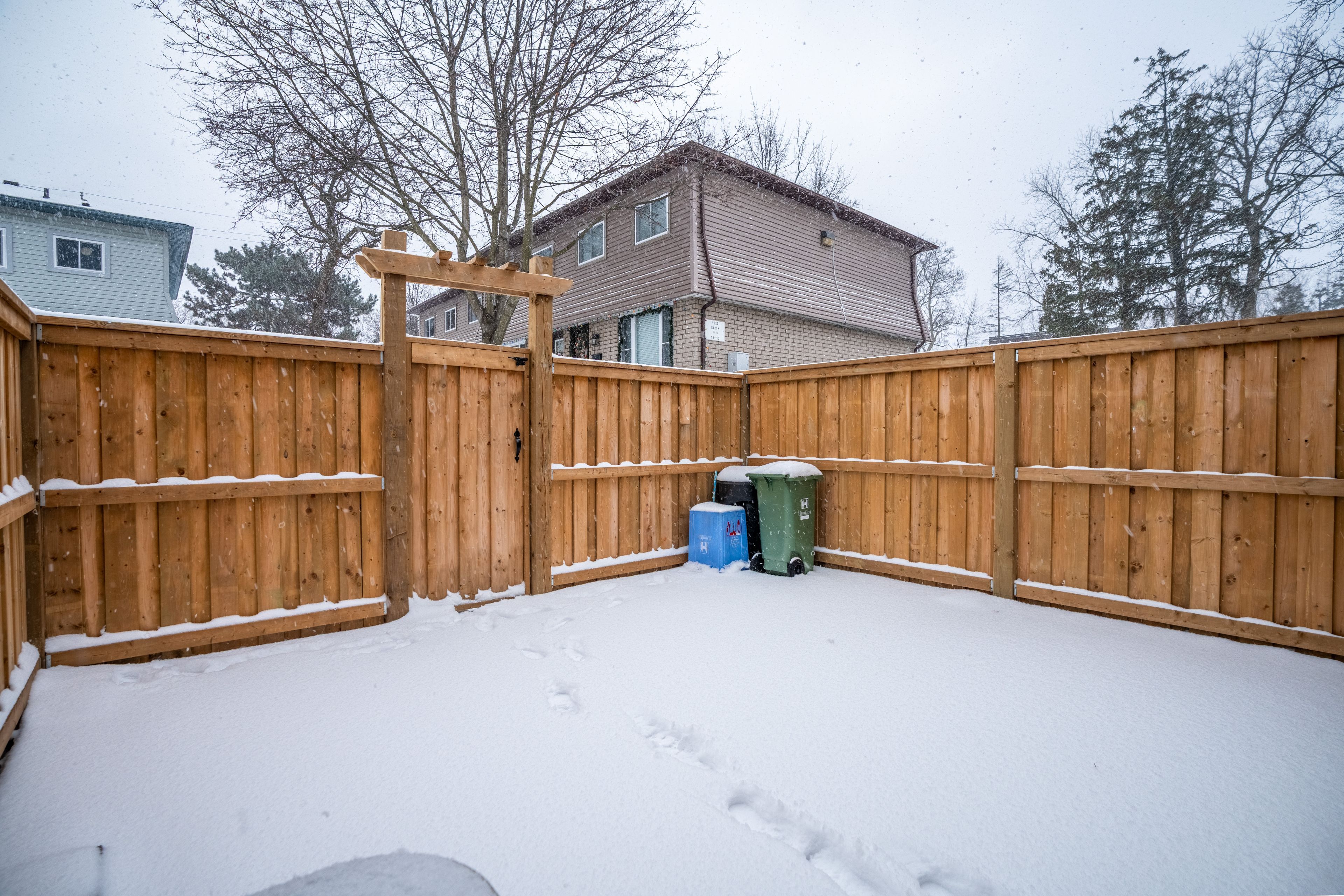 • Private backyard patio with an updated fence for outdoor enjoyment.