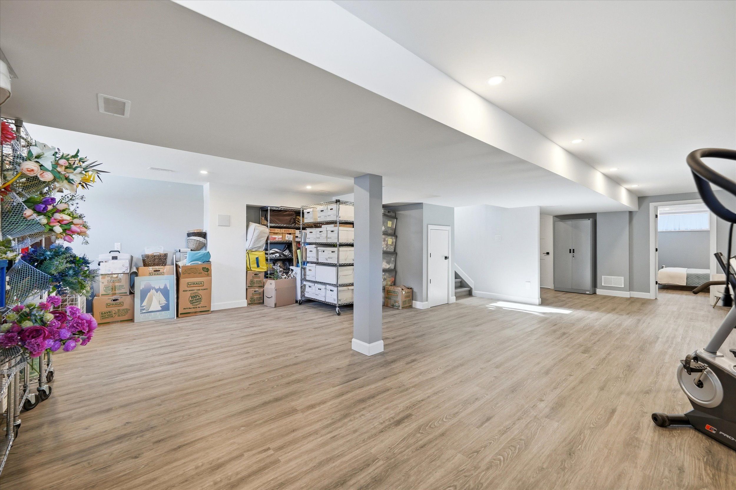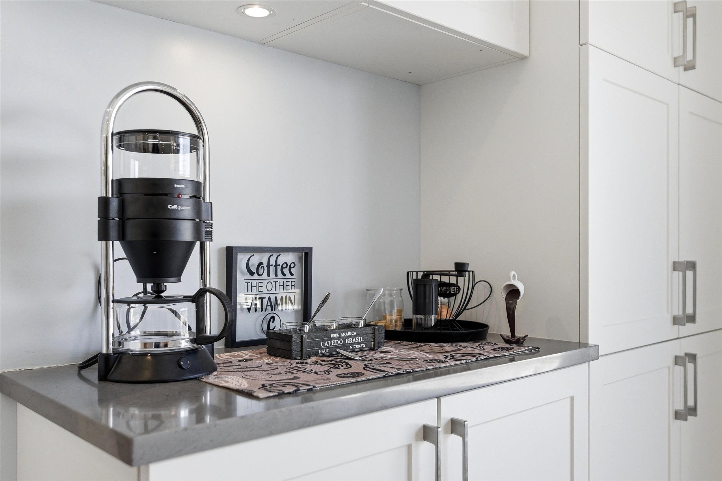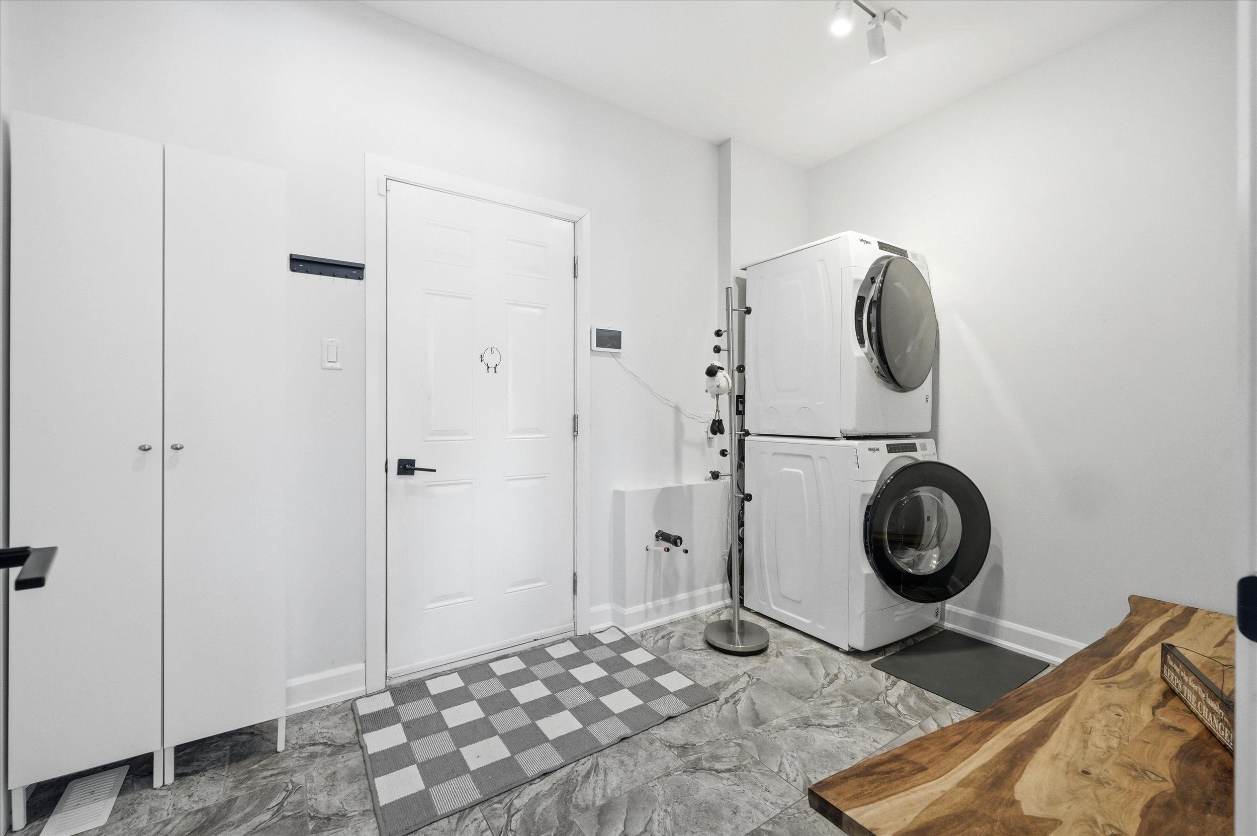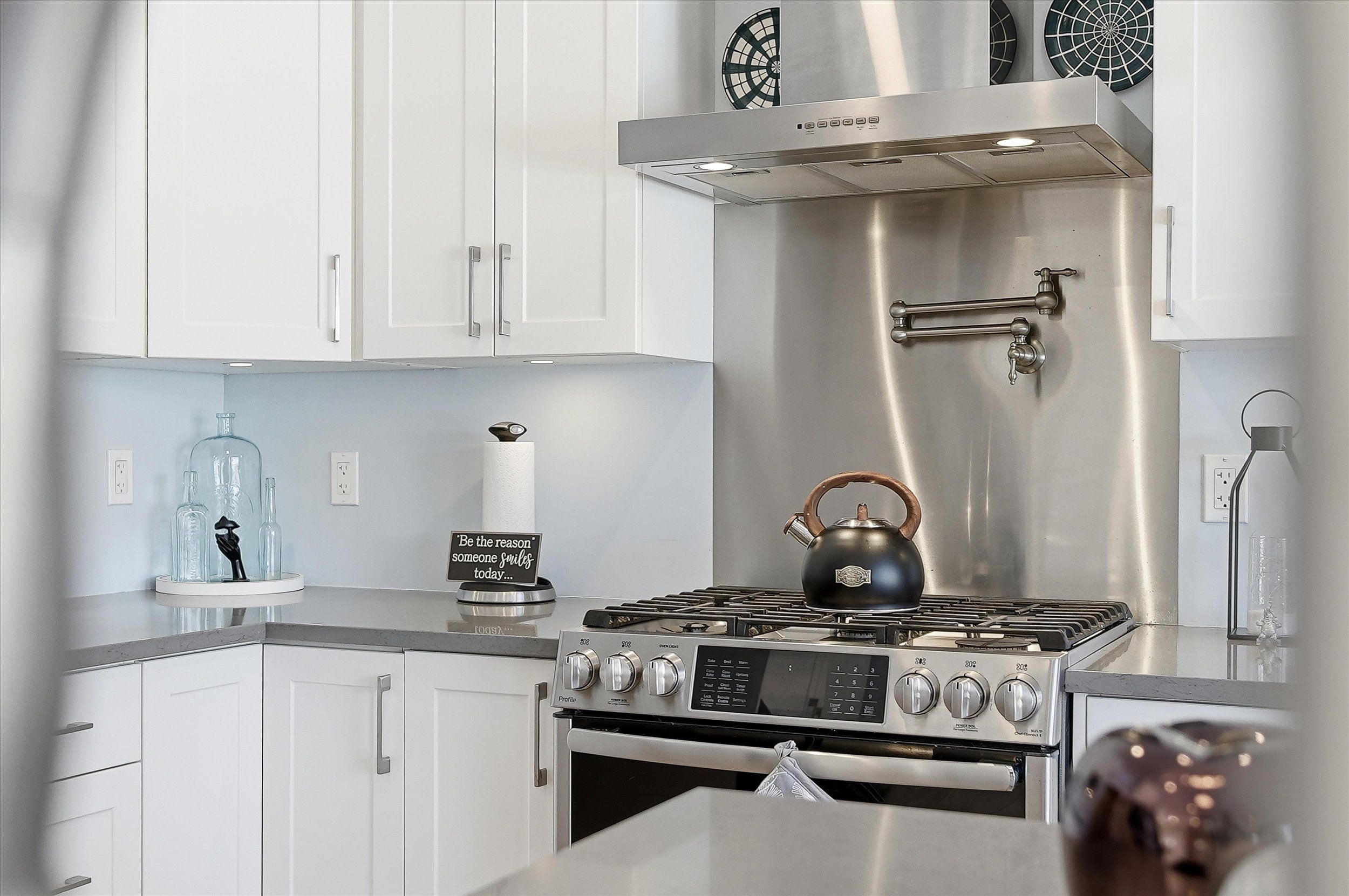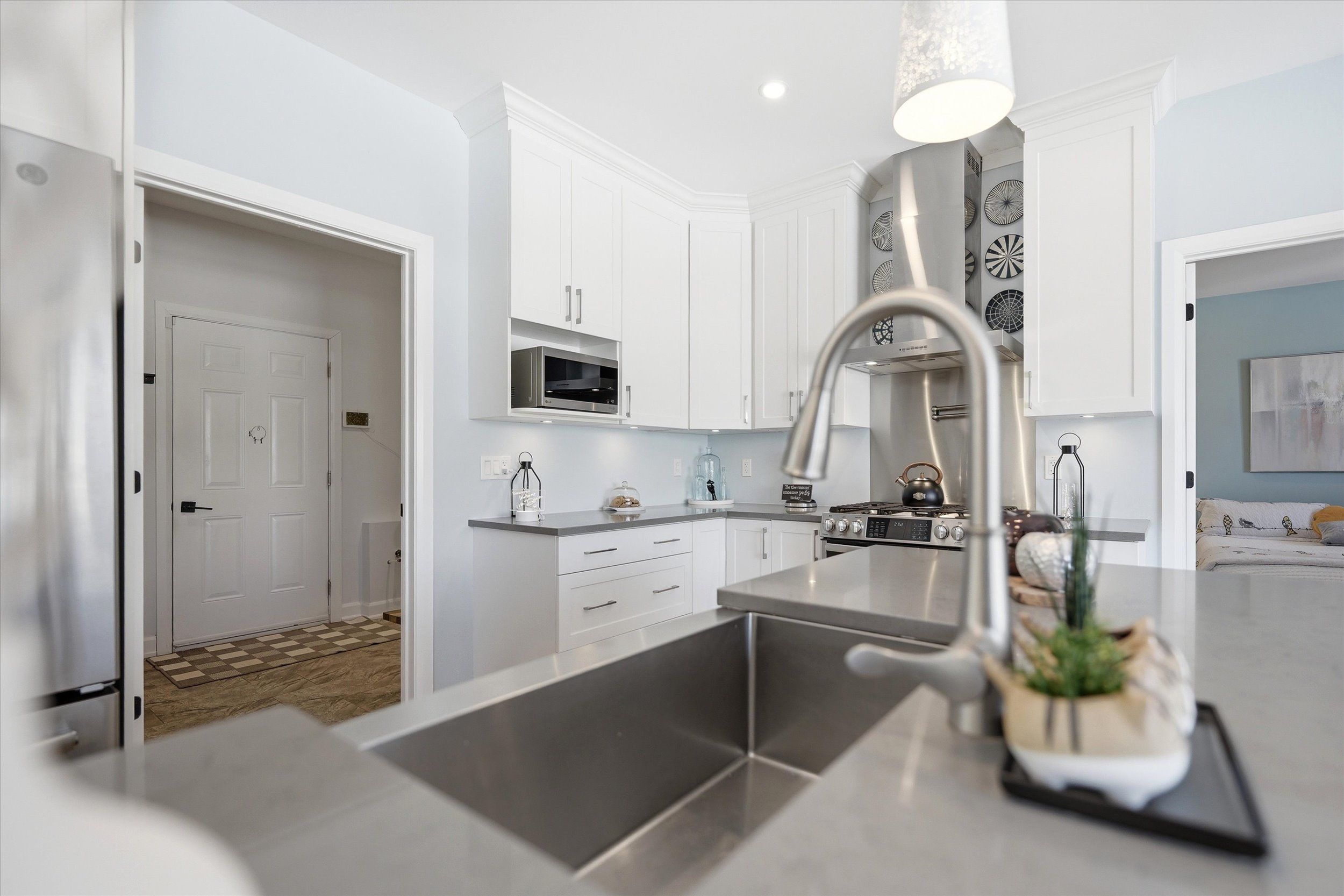 • Open concept kitchen features modern white cabinets and grey quartz countertops.