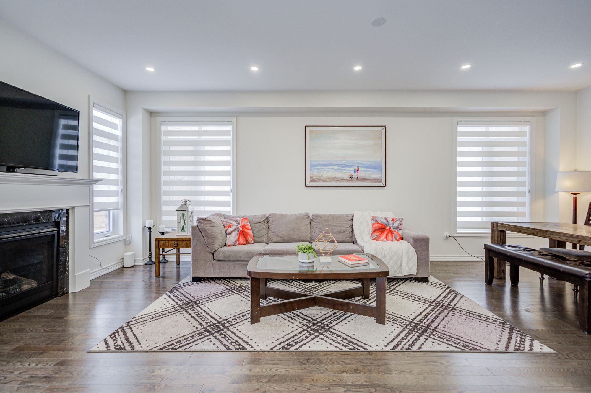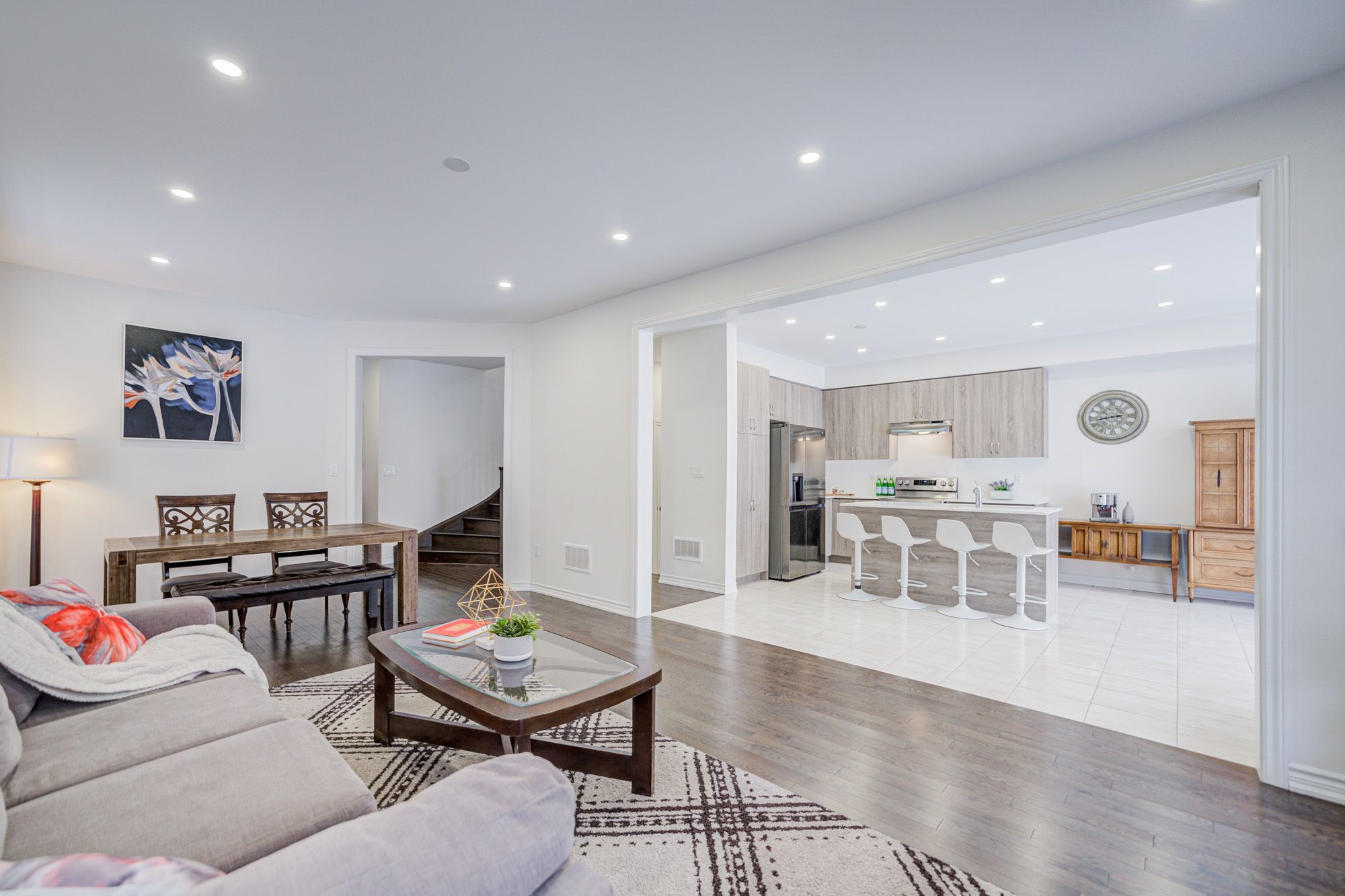 • Open-concept kitchen with granite countertops and a large island.