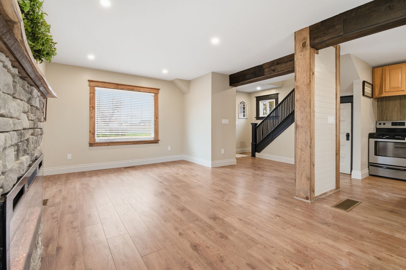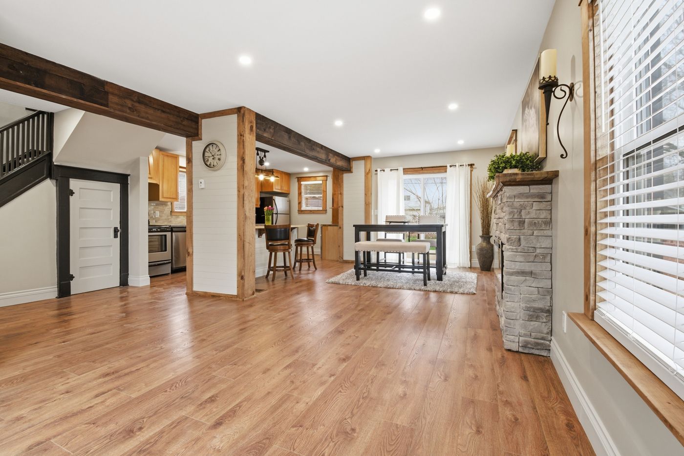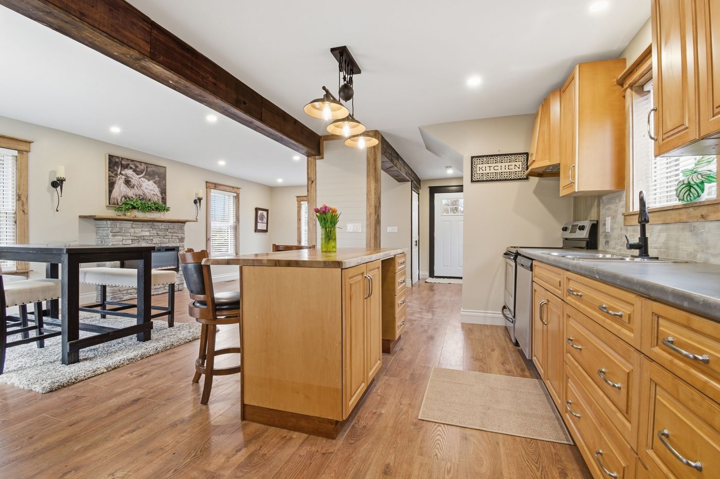 • Open concept main floor with a spacious kitchen and fireplace.