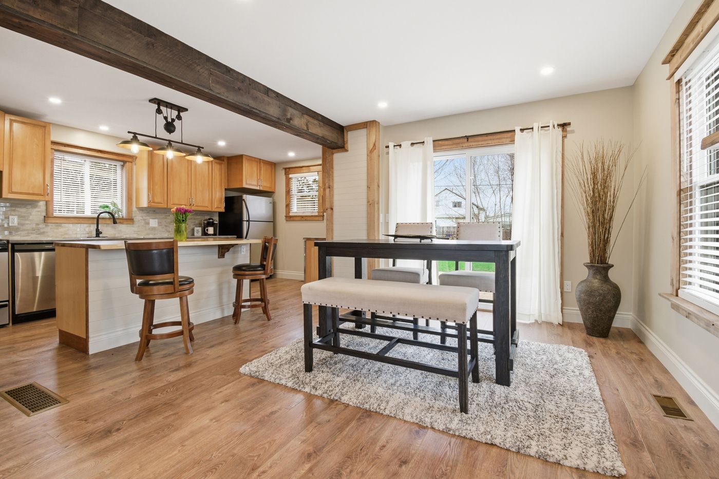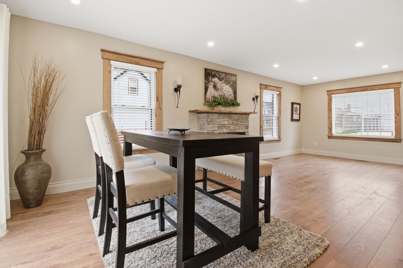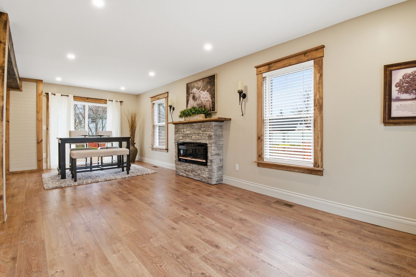 • Open concept main floor with a spacious kitchen and fireplace.