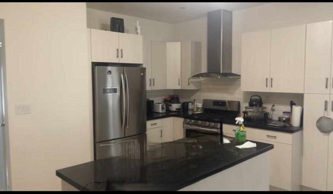 • Modern kitchen with quartz countertops and stainless steel appliances.